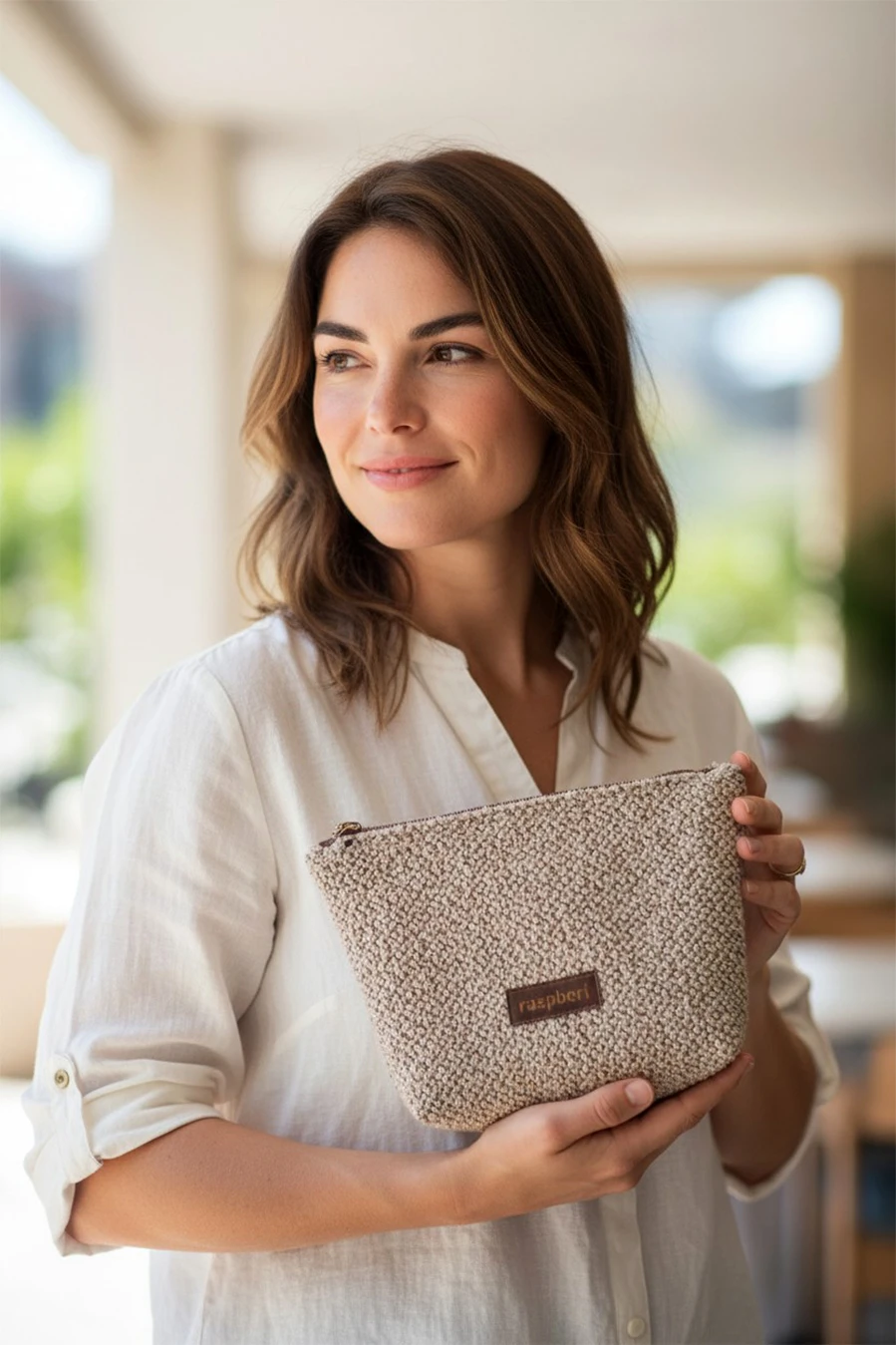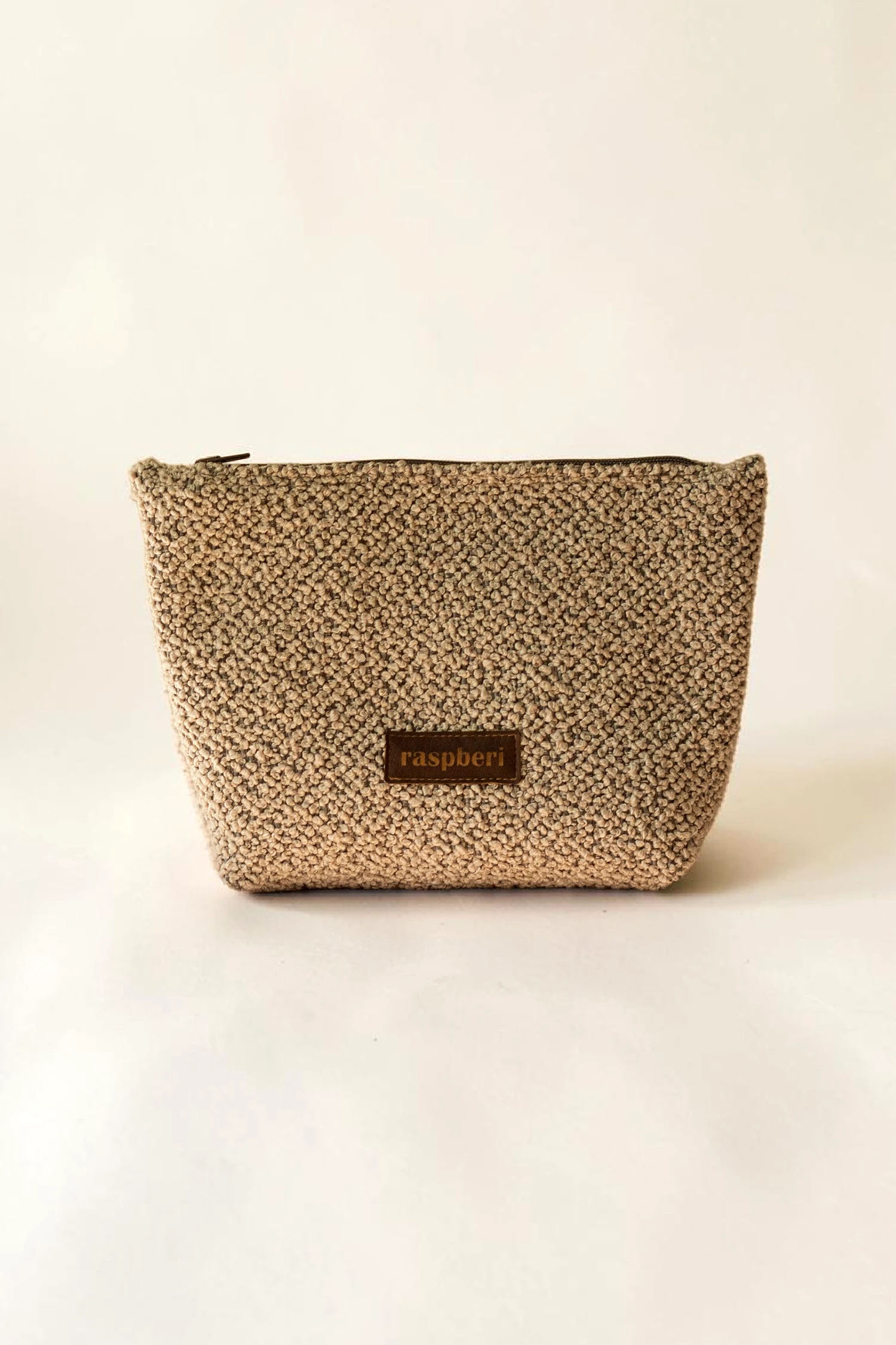 Duża kosmetyczka w kolorze beżowym.