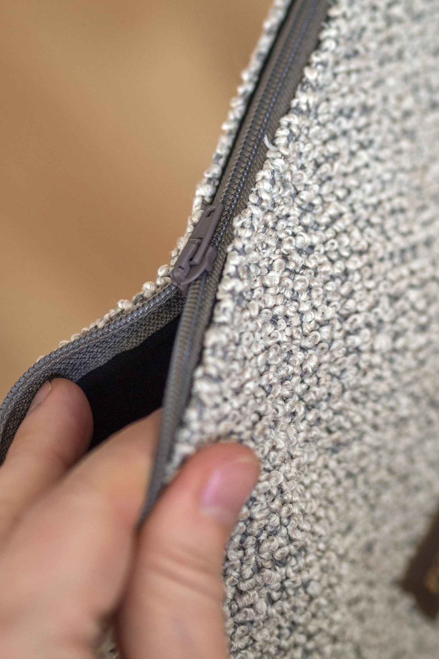 Kosmetyczka jest zapinana na suwak, w środku bawełniana podszewka.