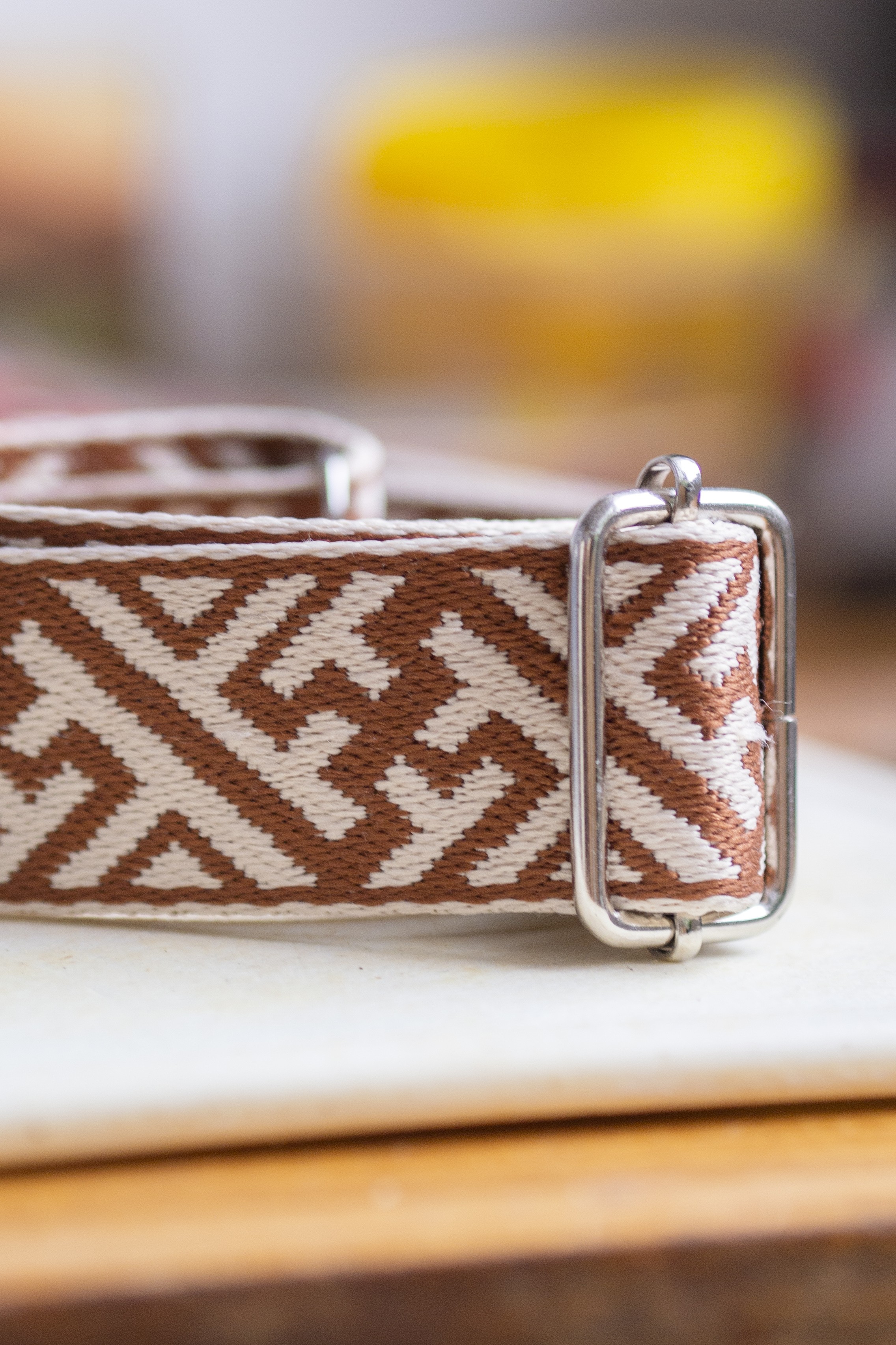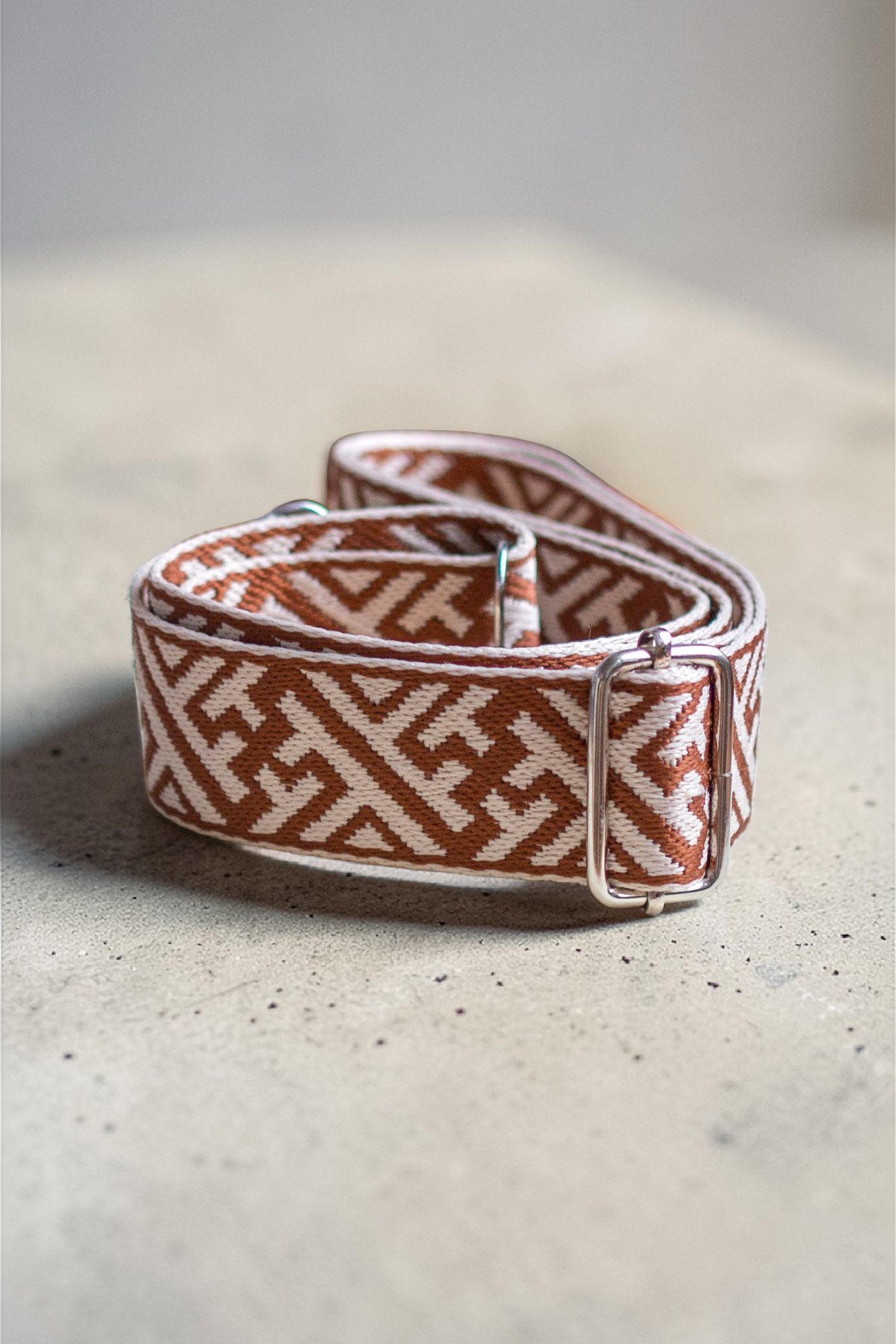 Regulowany pasek w kolorze beżowo-brązowym. Srebrne okucia.