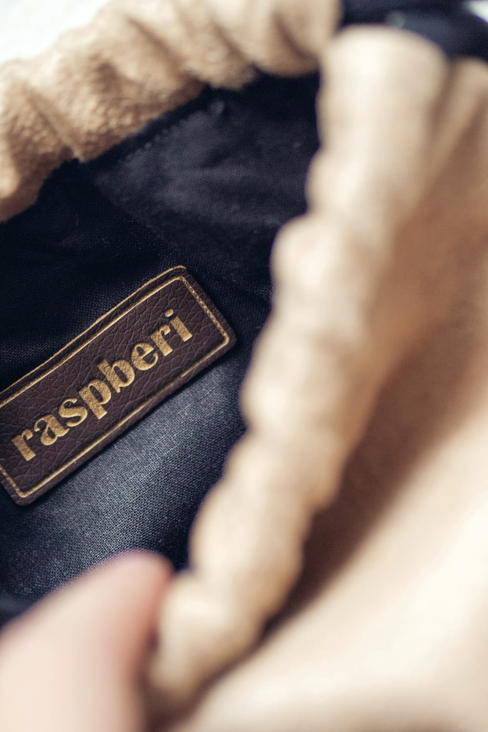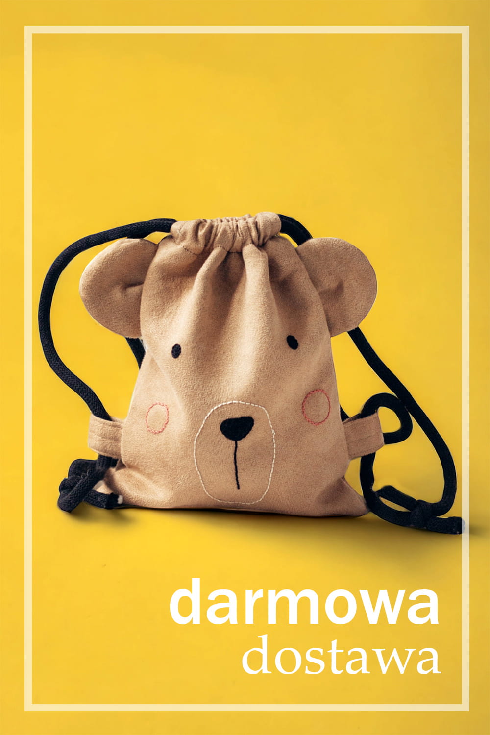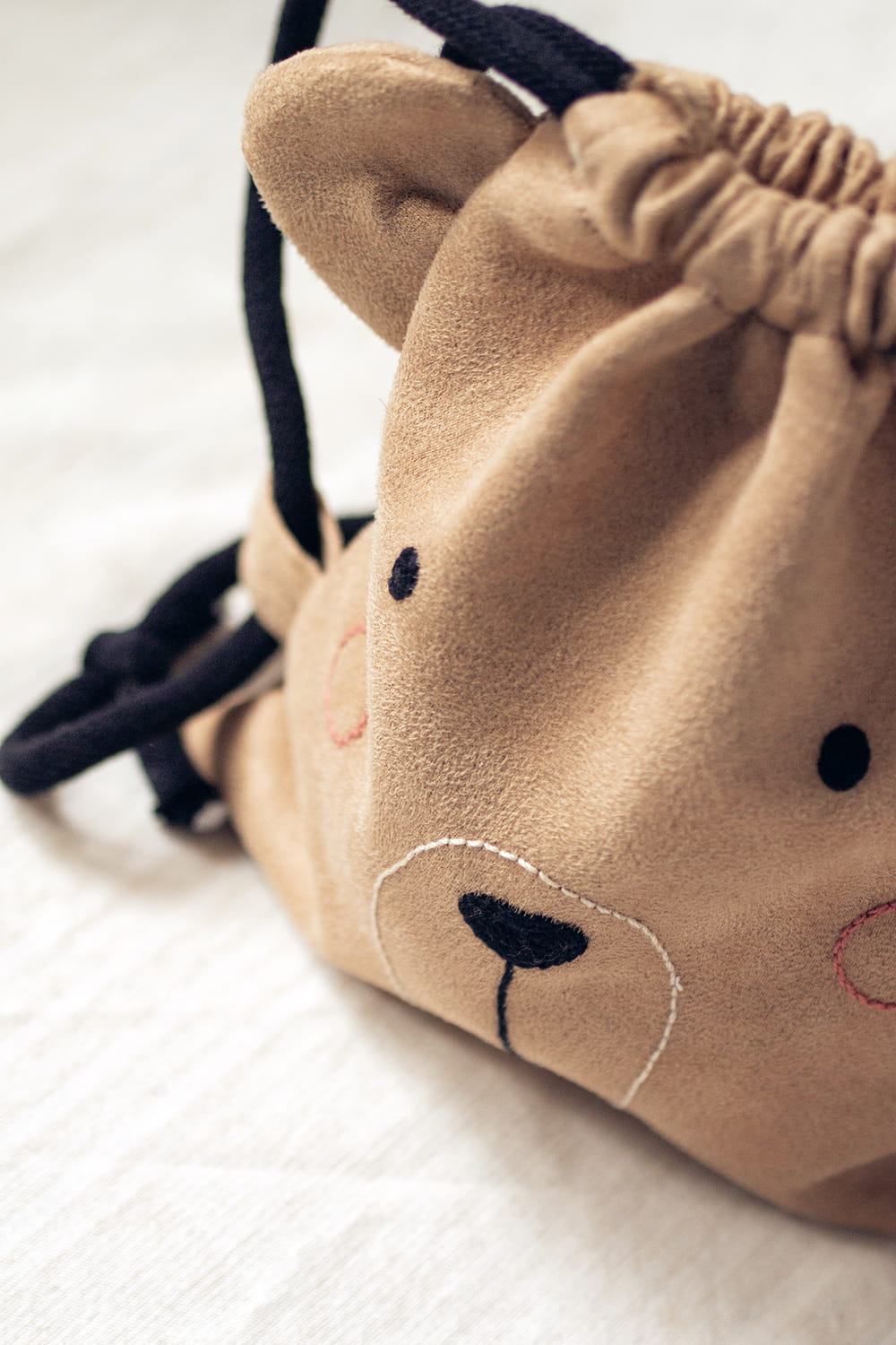 Dziecięcy plecaczek worek wykonany z beżowego nubuku. Ręcznie haftowany pyszczek misia. Bawełniane sznurki w kolorze czarnym.