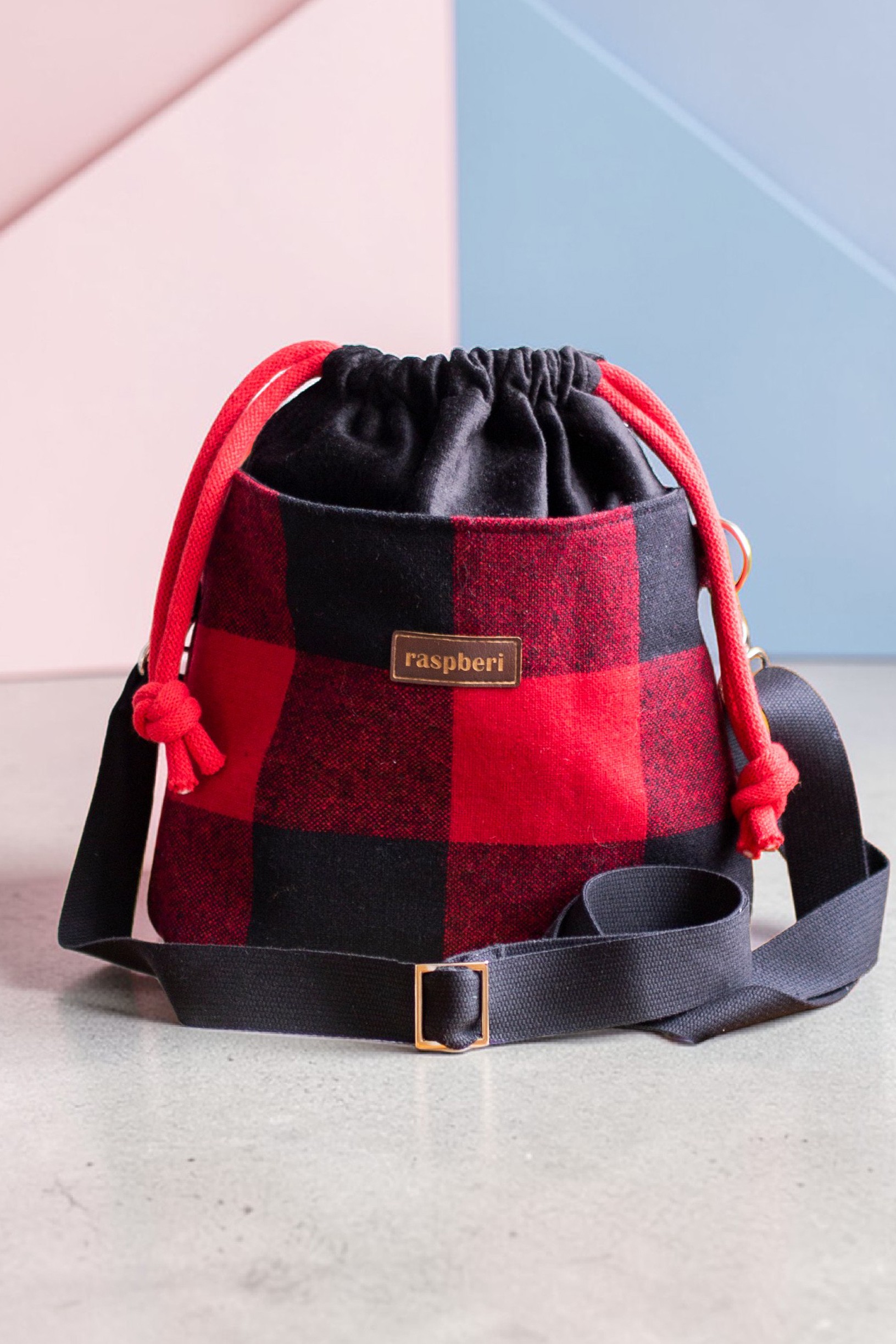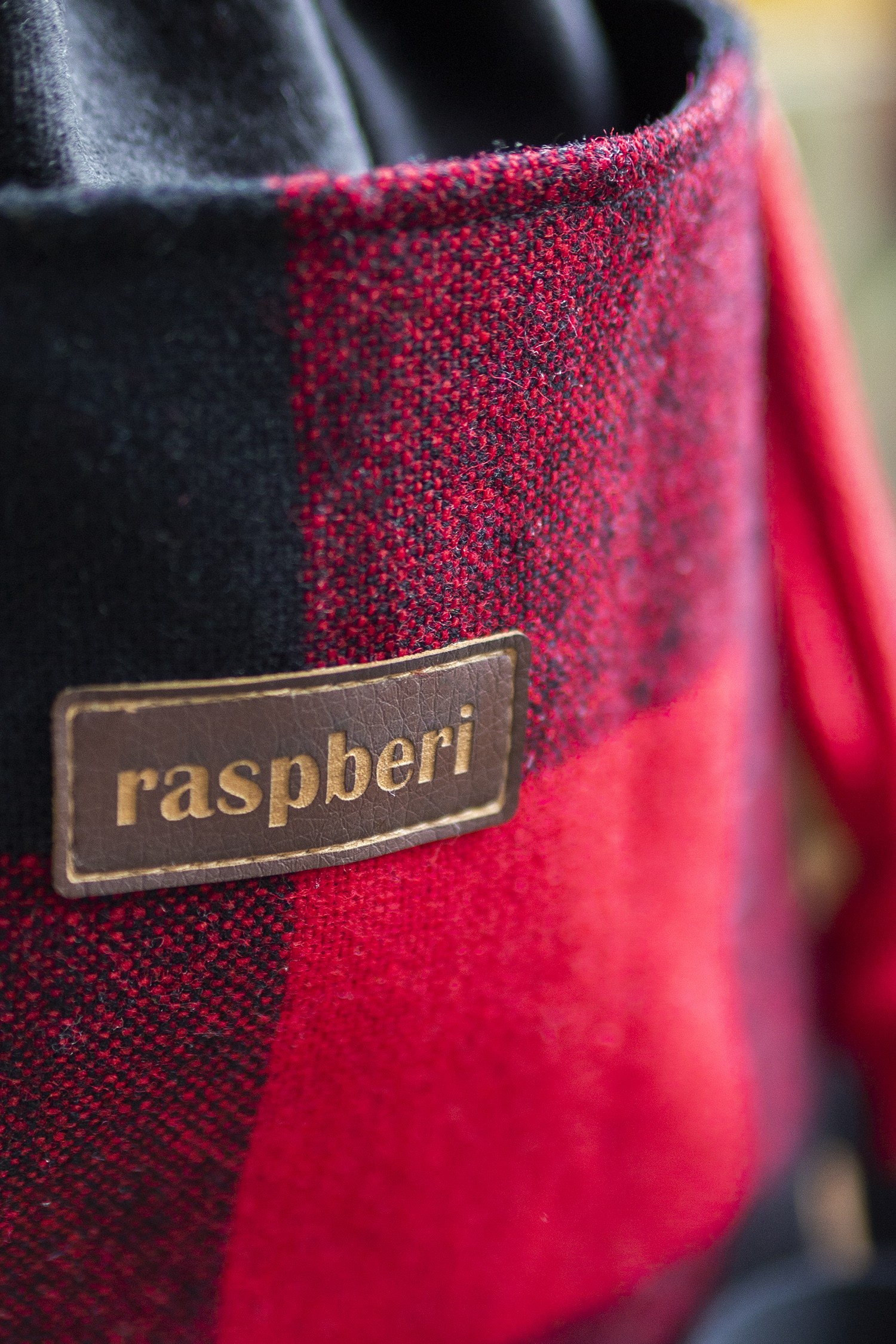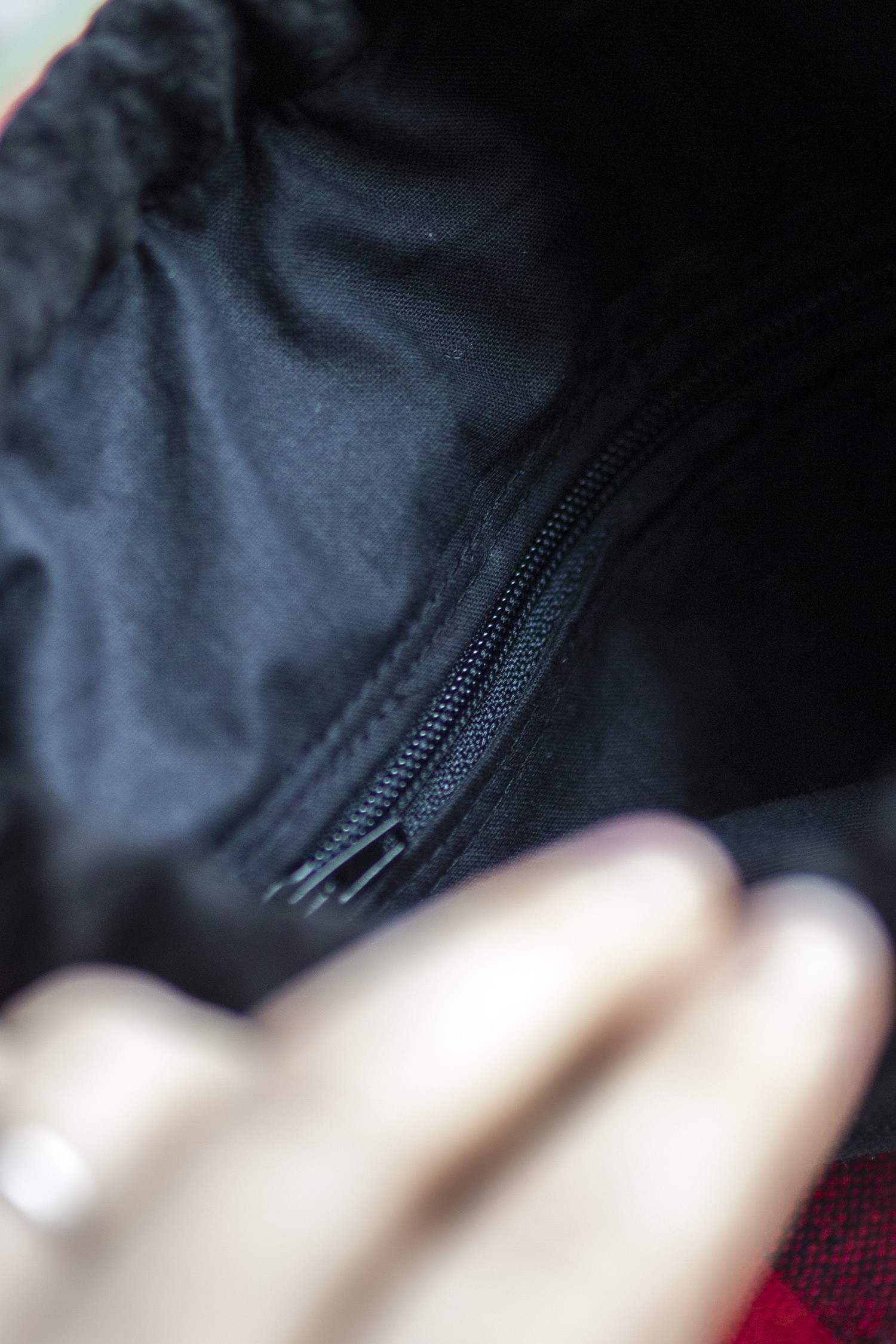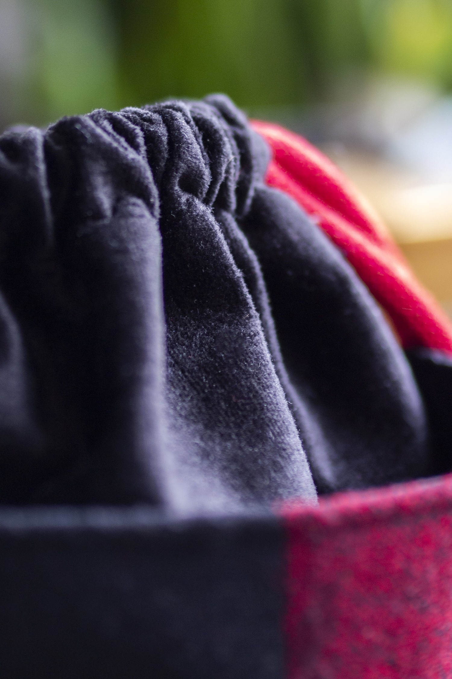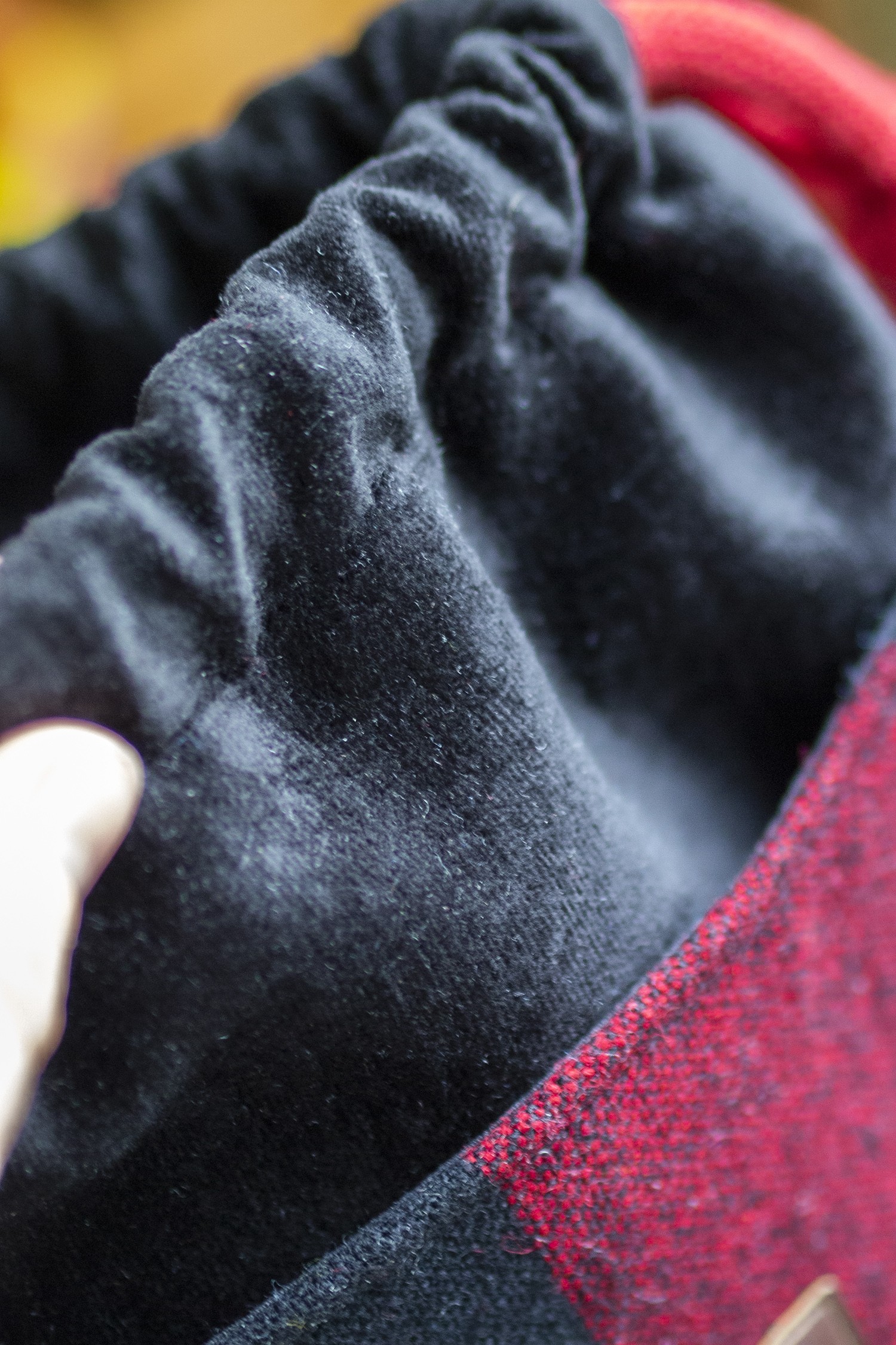 Wykonana z czarnego weluru. Z przodu oraz z na tyle torebki kieszenie (np. na telefon czy chusteczki) z czerwonej flaneli w kratę. W środku kieszonka zapinana na suwak.