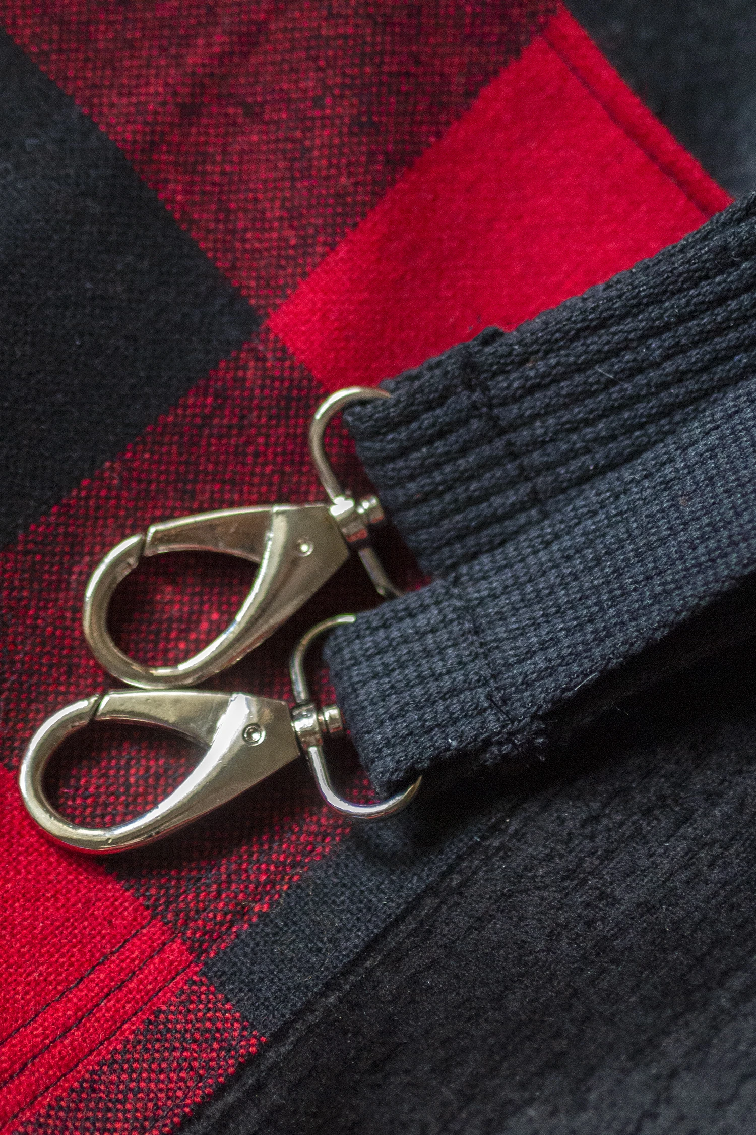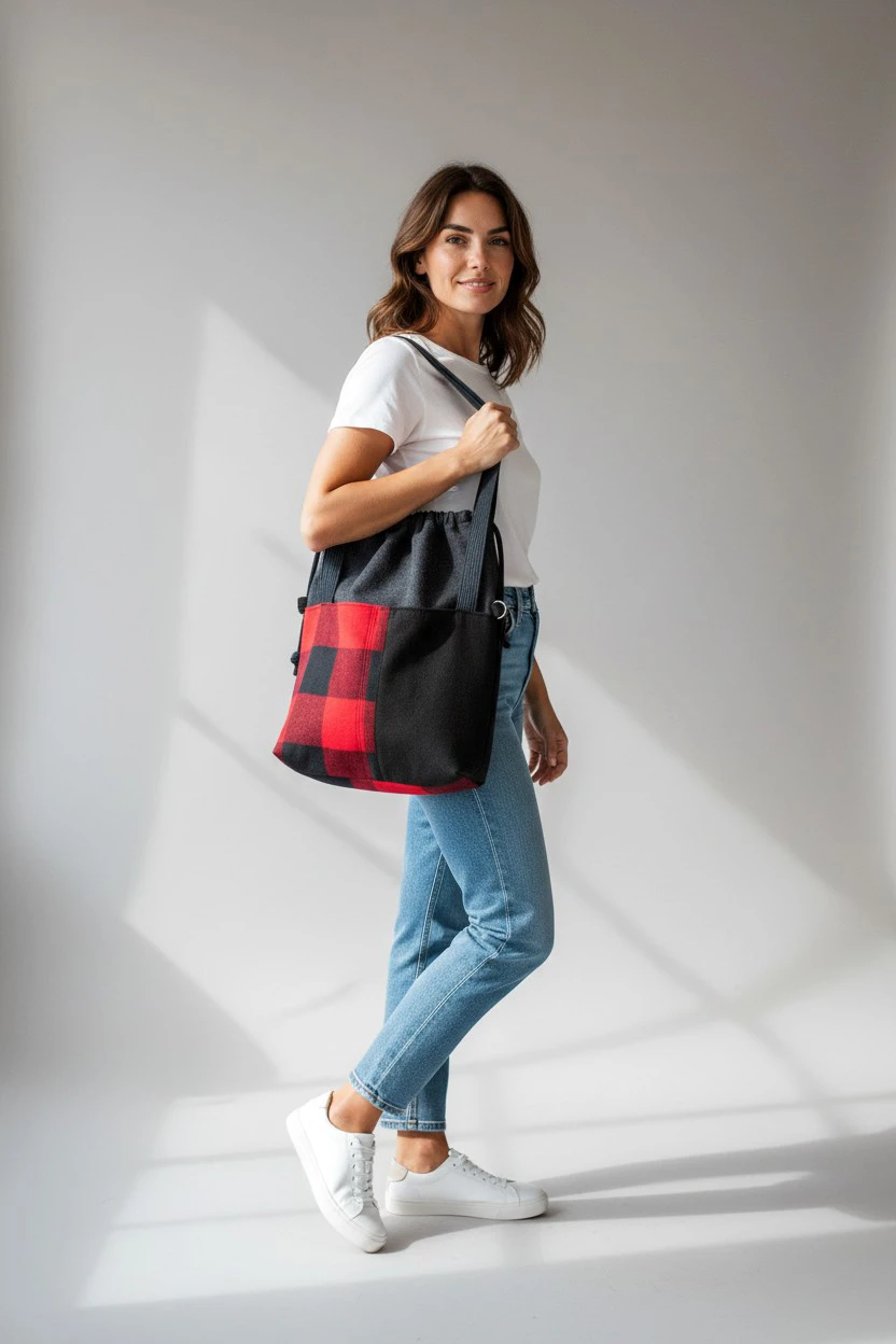 Torba worek wykonana z flauszu, weluru oraz czarno-czerwonej flaneli w kratę.