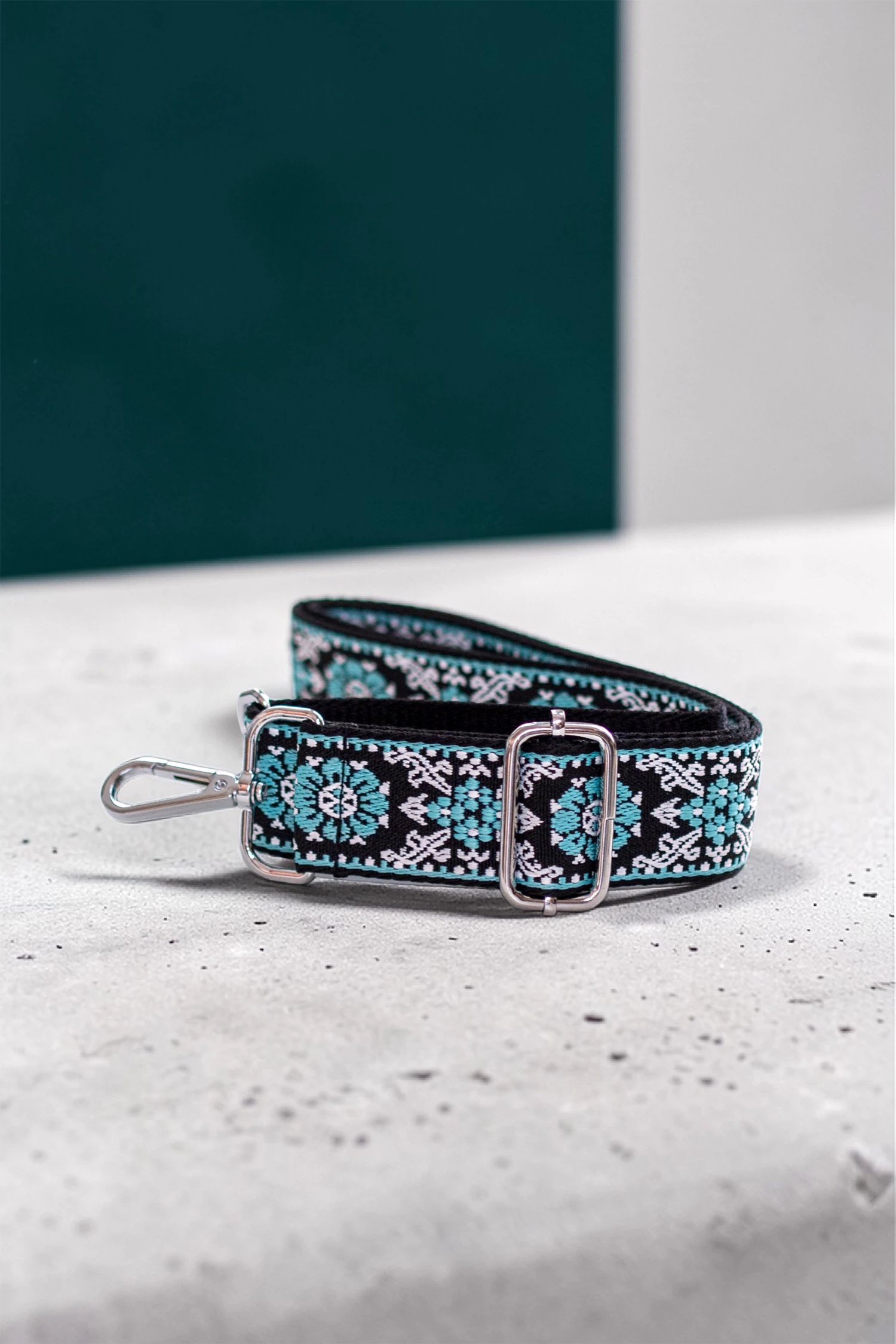 Regulowany pasek w kolorze czarno-turkusowym. Srebrne okucia.