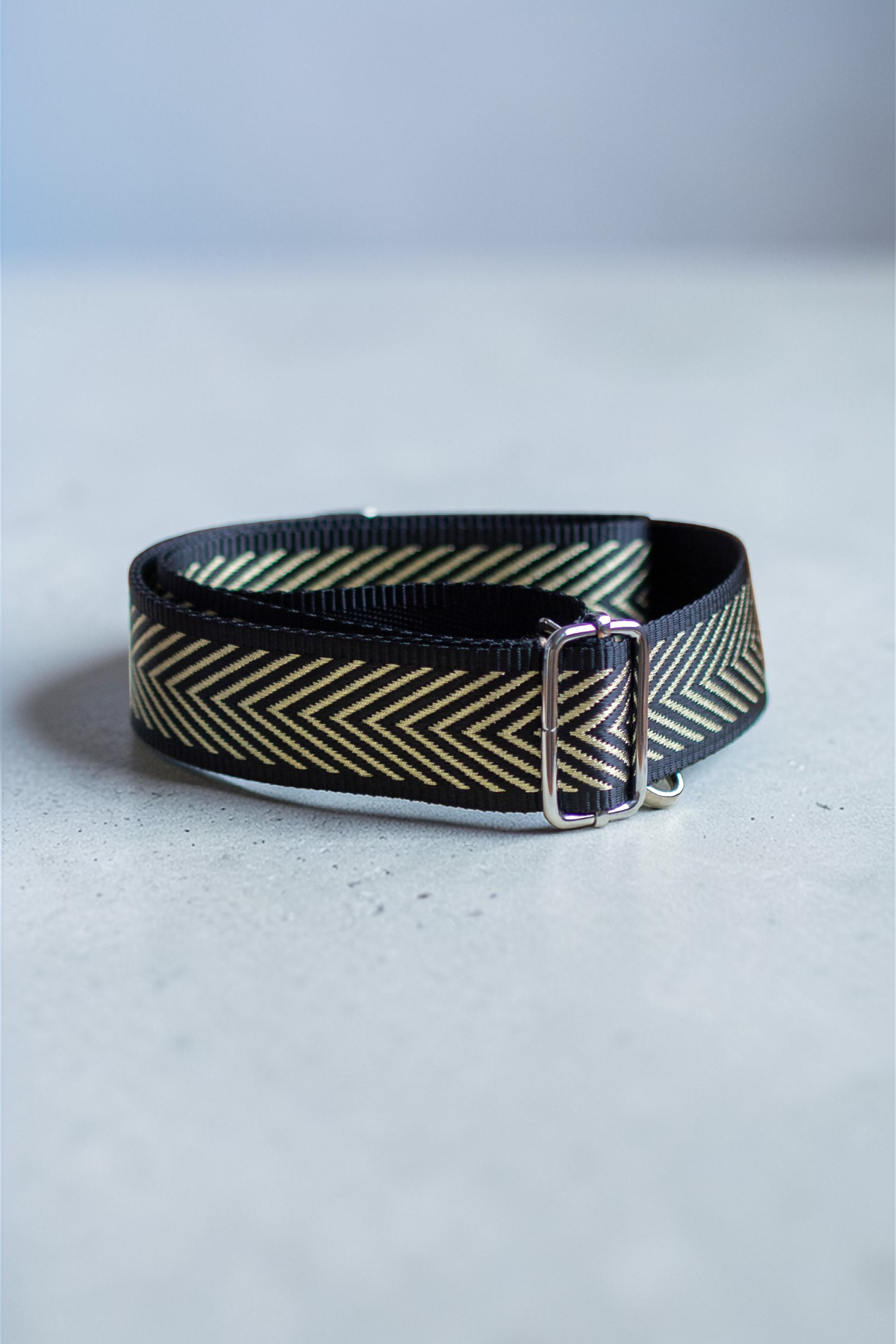 Regulowany pasek w kolorze czarno-złotym. Srebrne okucia.
