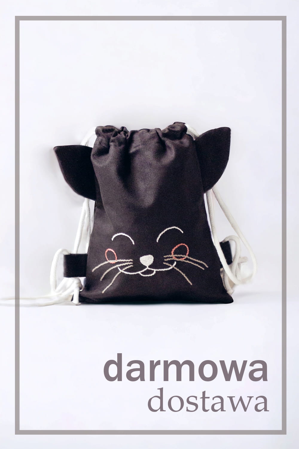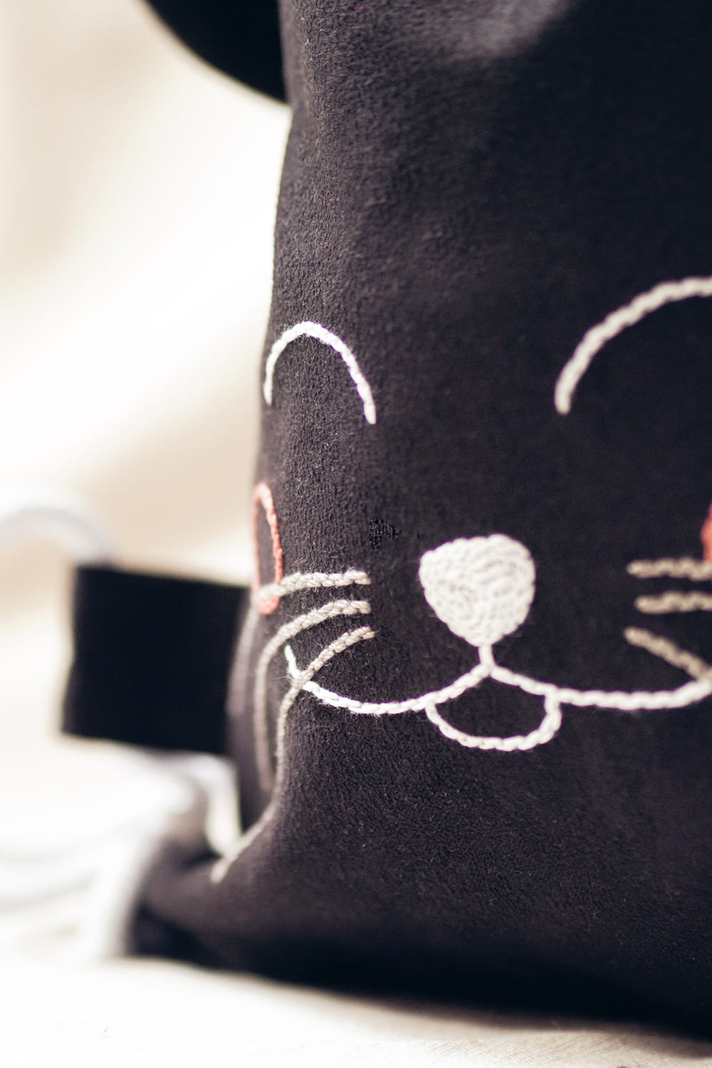 Dziecięcy plecaczek worek wykonany z czarnego nubuku. Ręcznie haftowany pyszczek kotka. Bawełniane sznurki w kolorze białym.