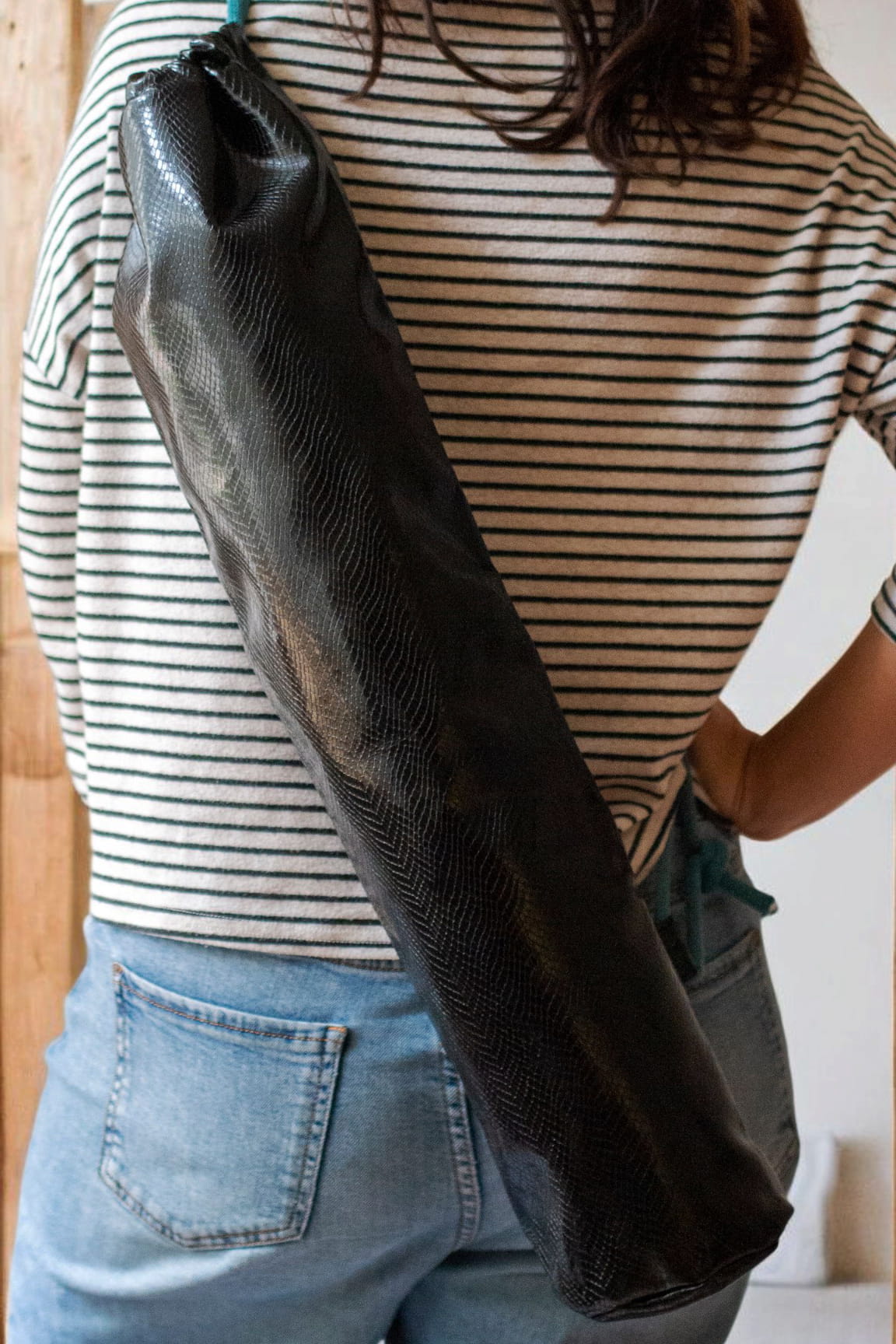 Plecak worek wykonany z czarnej tłoczonej ekoskóry w wężową łuskę. Jego kształt sprawia, iż idealnie nadaje się na pokrowiec na matę do jogi.