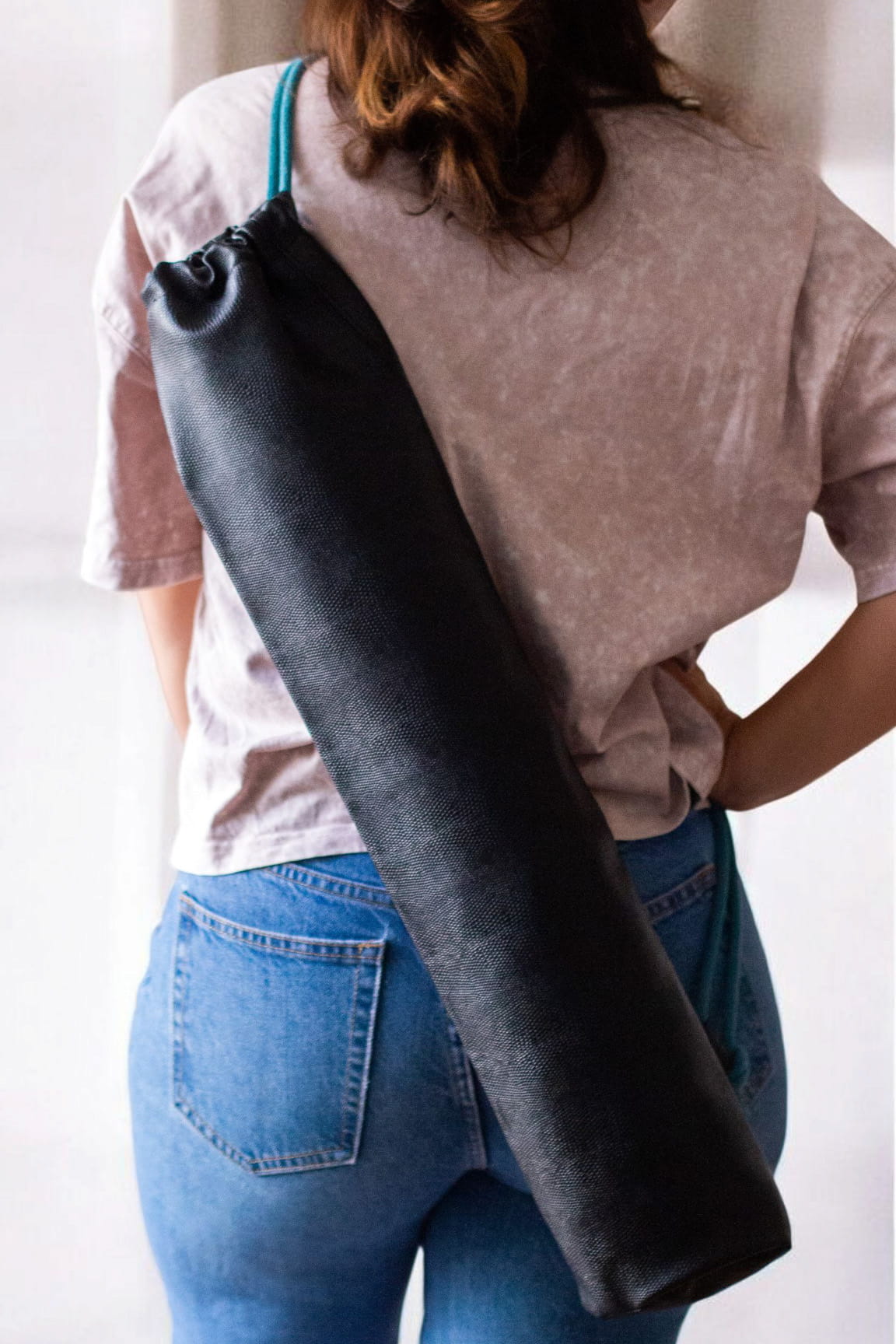Plecak worek wykonany z czarnej tłoczonej ekoskóry. Jego kształt sprawia, iż idealnie nadaje się na pokrowiec na matę do jogi.