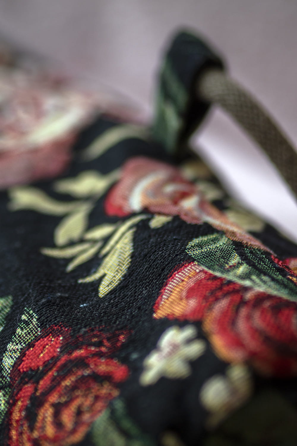 Plecak worek wykonany z żakardu w kwiaty. Jego kształt sprawia, iż idealnie nadaje się na pokrowiec na matę do jogi.