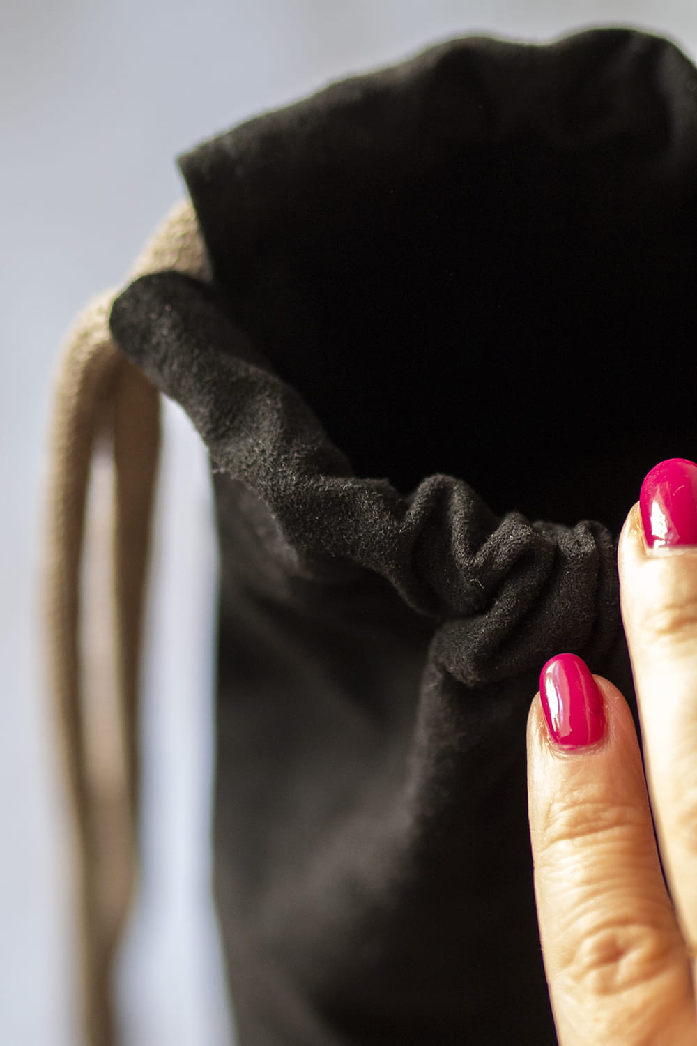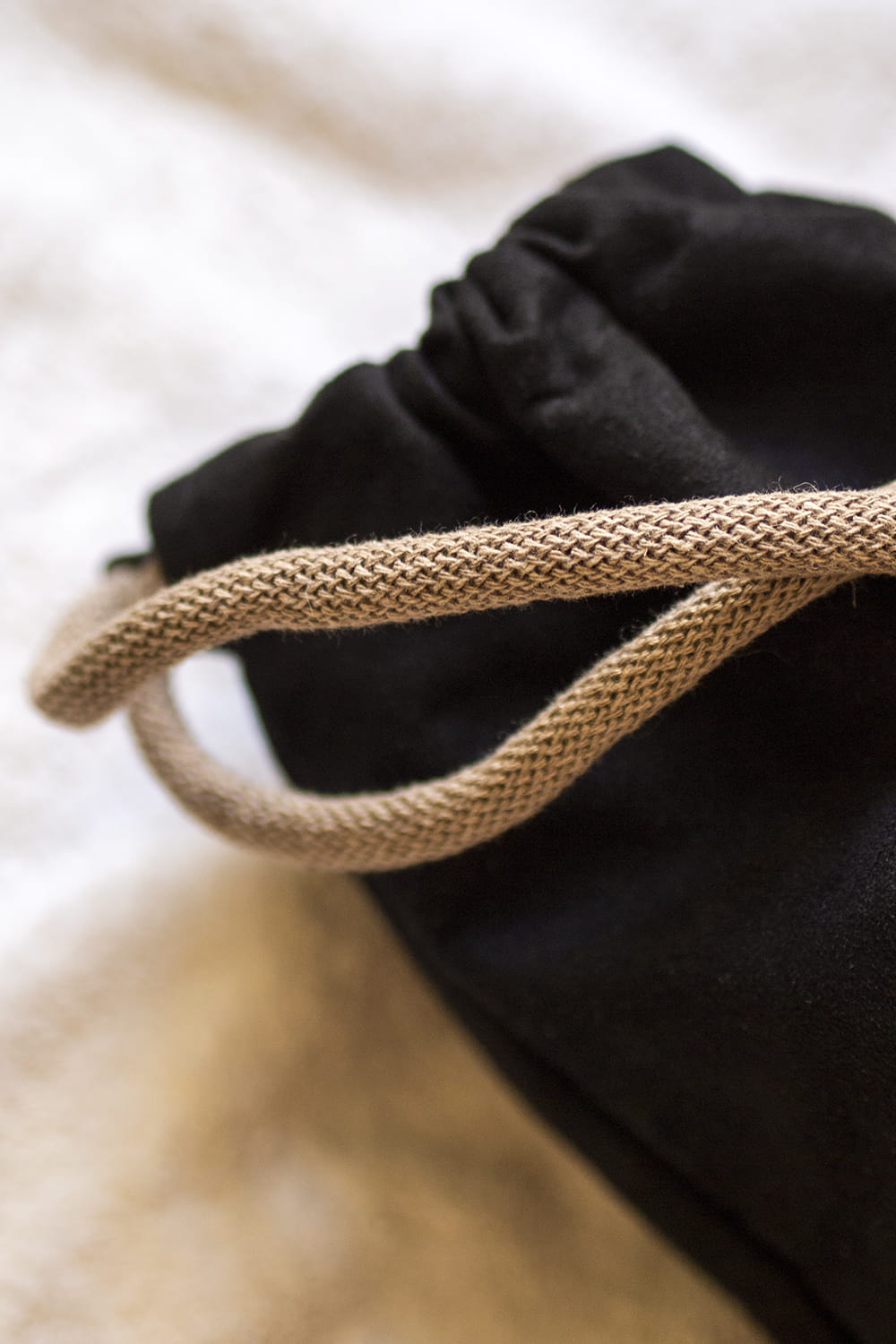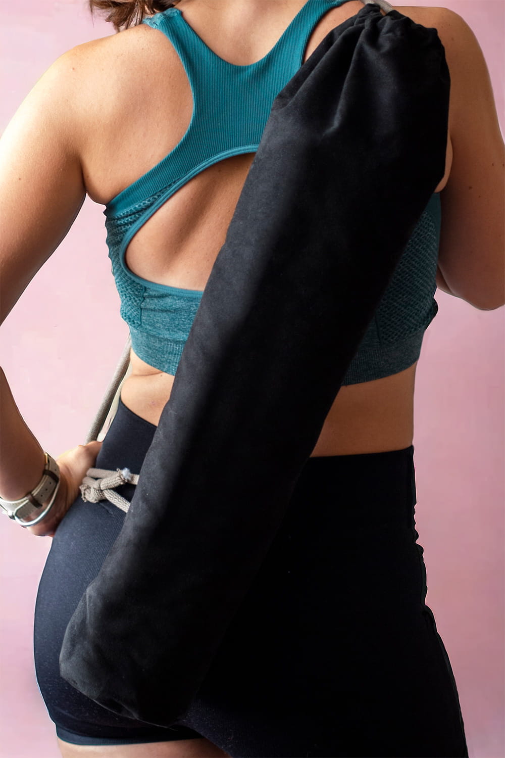 Plecak worek wykonany z czarnego nubuku. Jego kształt sprawia, iż idealnie nadaje się na pokrowiec na matę do jogi.