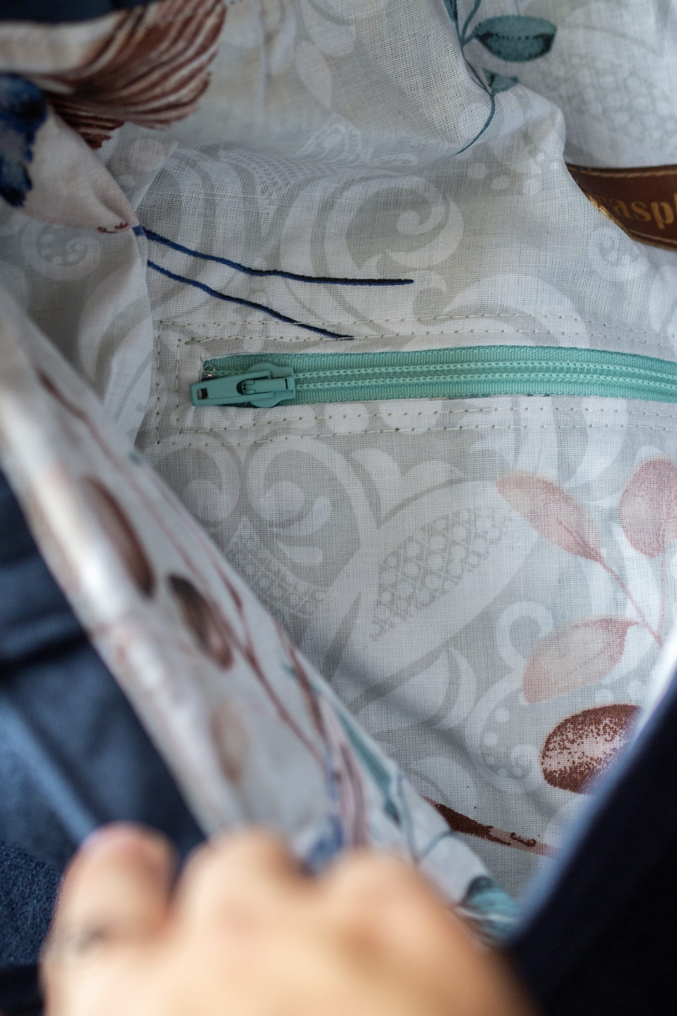 Torebka posiada bawełnianą podszewkę w kwiaty, a w środku kieszeń zapinaną na suwak. Z tyłu torby znajduje się dodatkowa kieszonka zapinana na suwak.