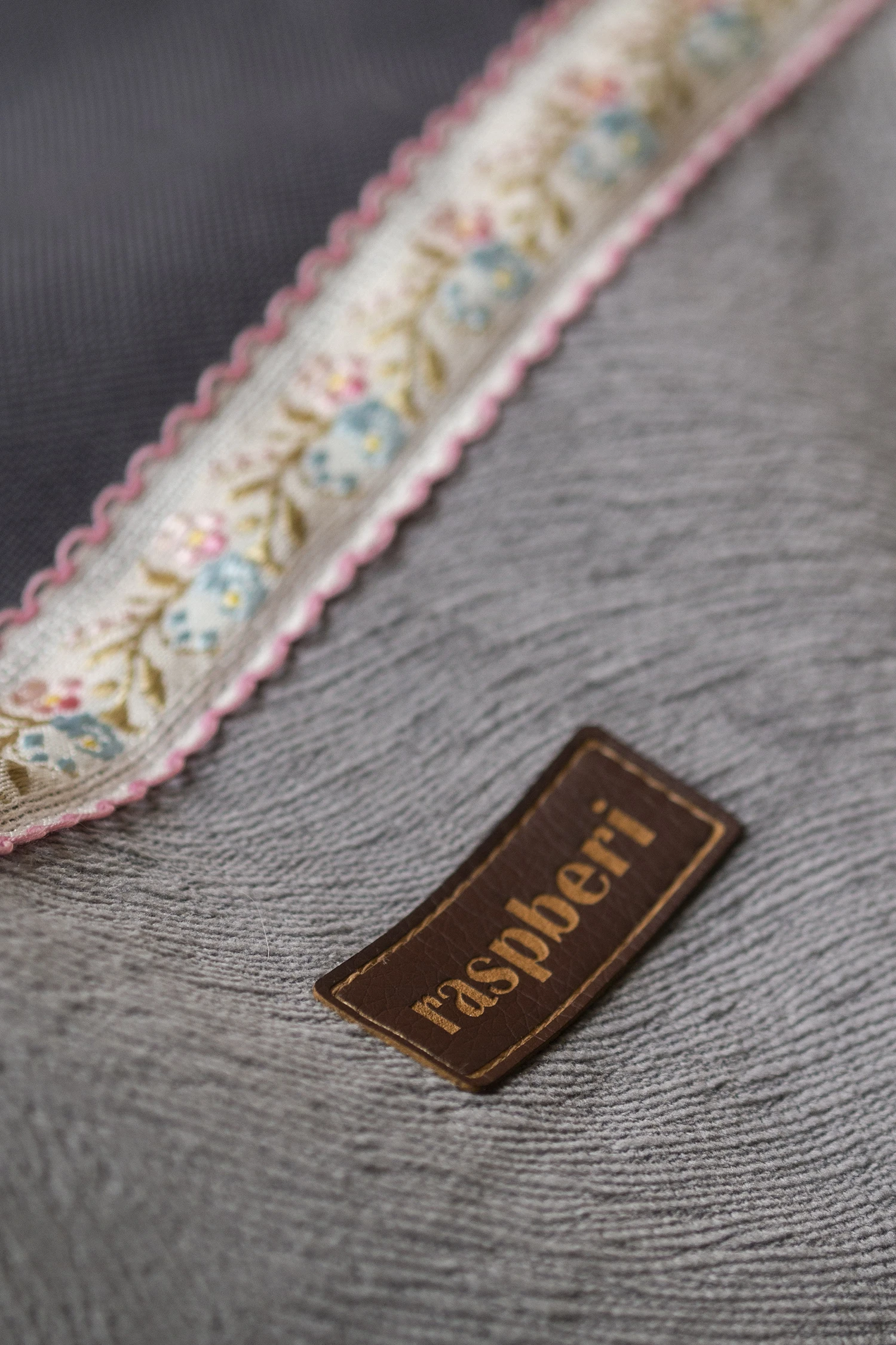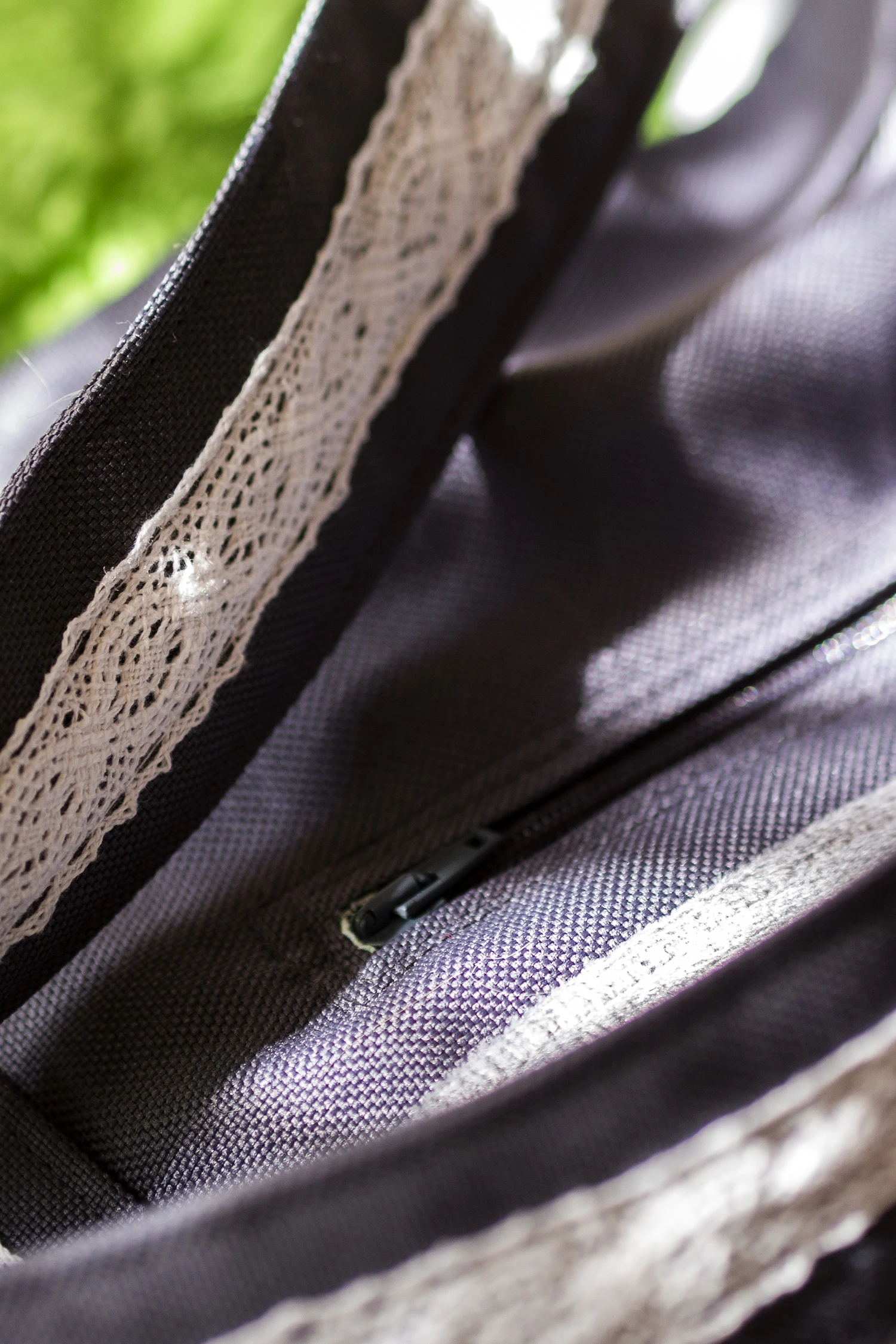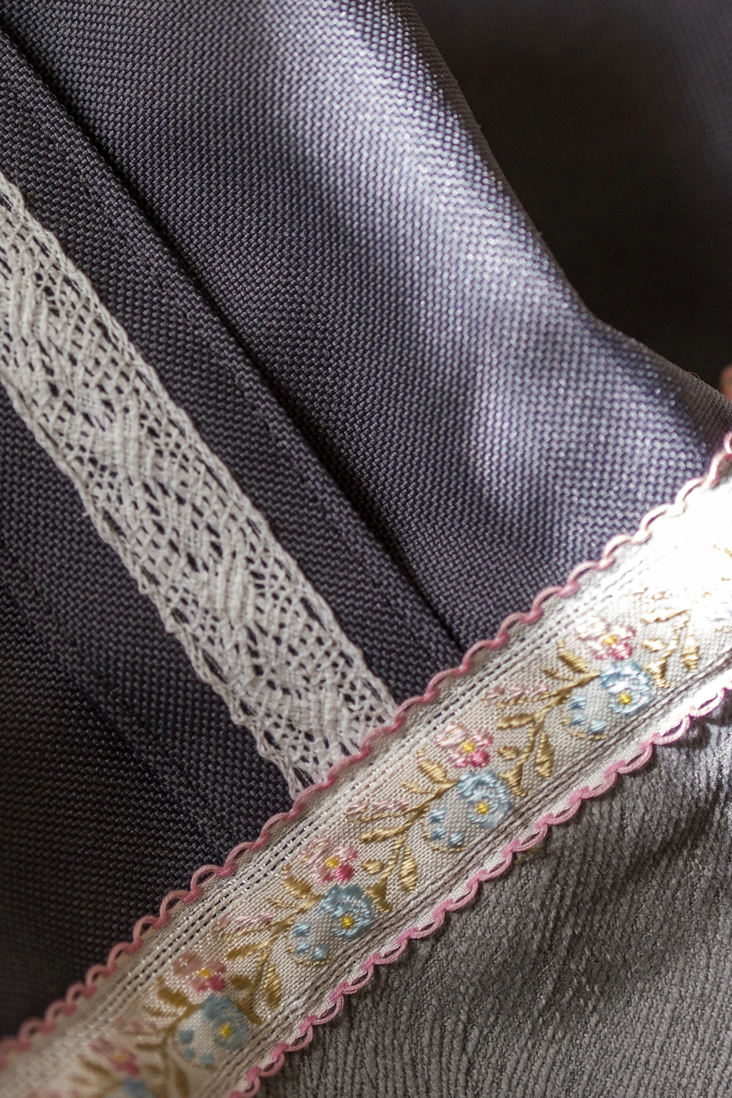 Bardzo duża torebka na ramię wykonana z tkaniny w kolorze grafitowym w połączeniu z szarym welurem z delikatnym tłoczeniem. Dodatki w postaci tasiemek w kwiaty oraz koronkowych sprawiają, że torba jest nietuzinkowa i jedyna w swoim rodzaju.