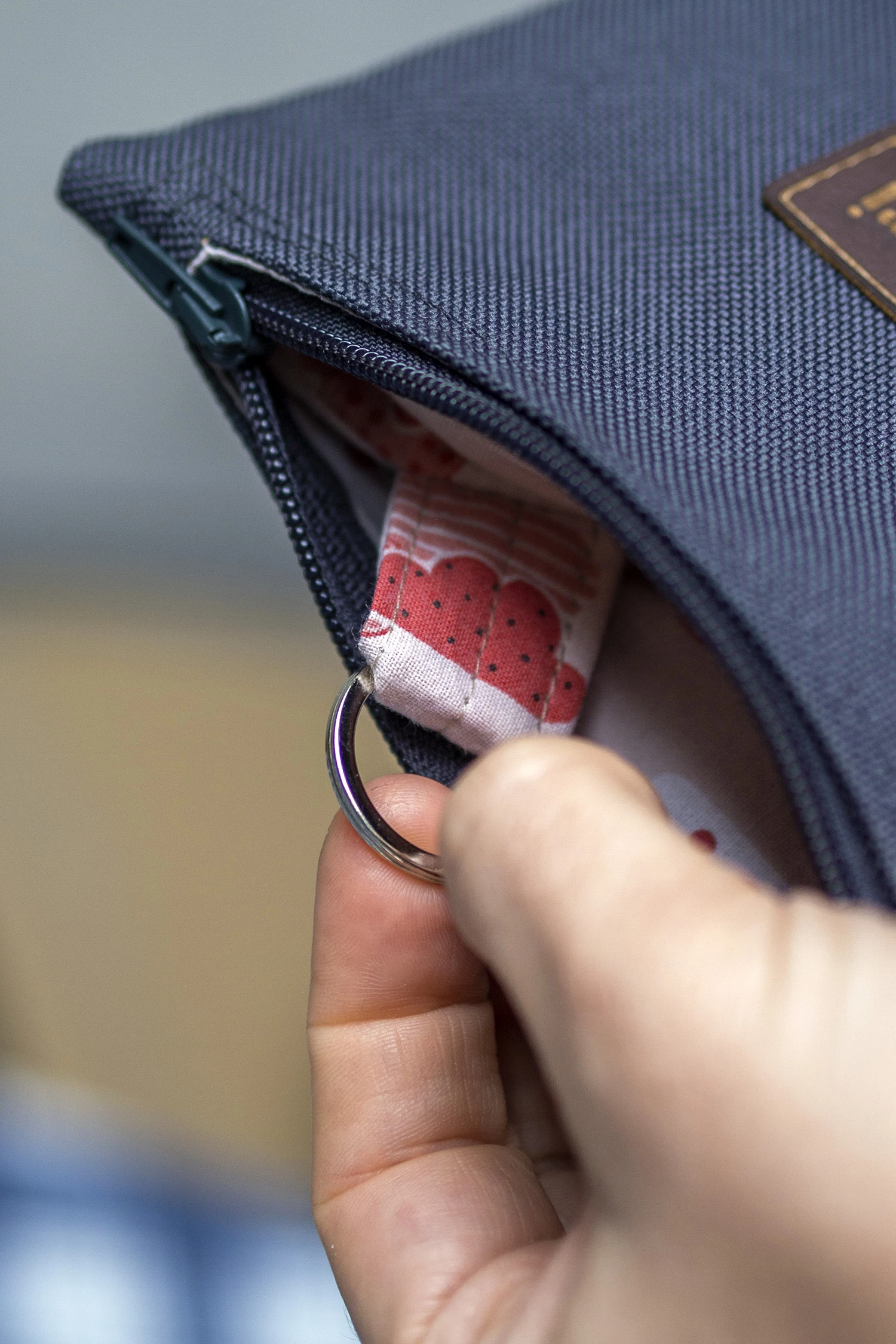 Pokrowiec w środku posiada metalowe kółko do którego można dopiąć klucze.