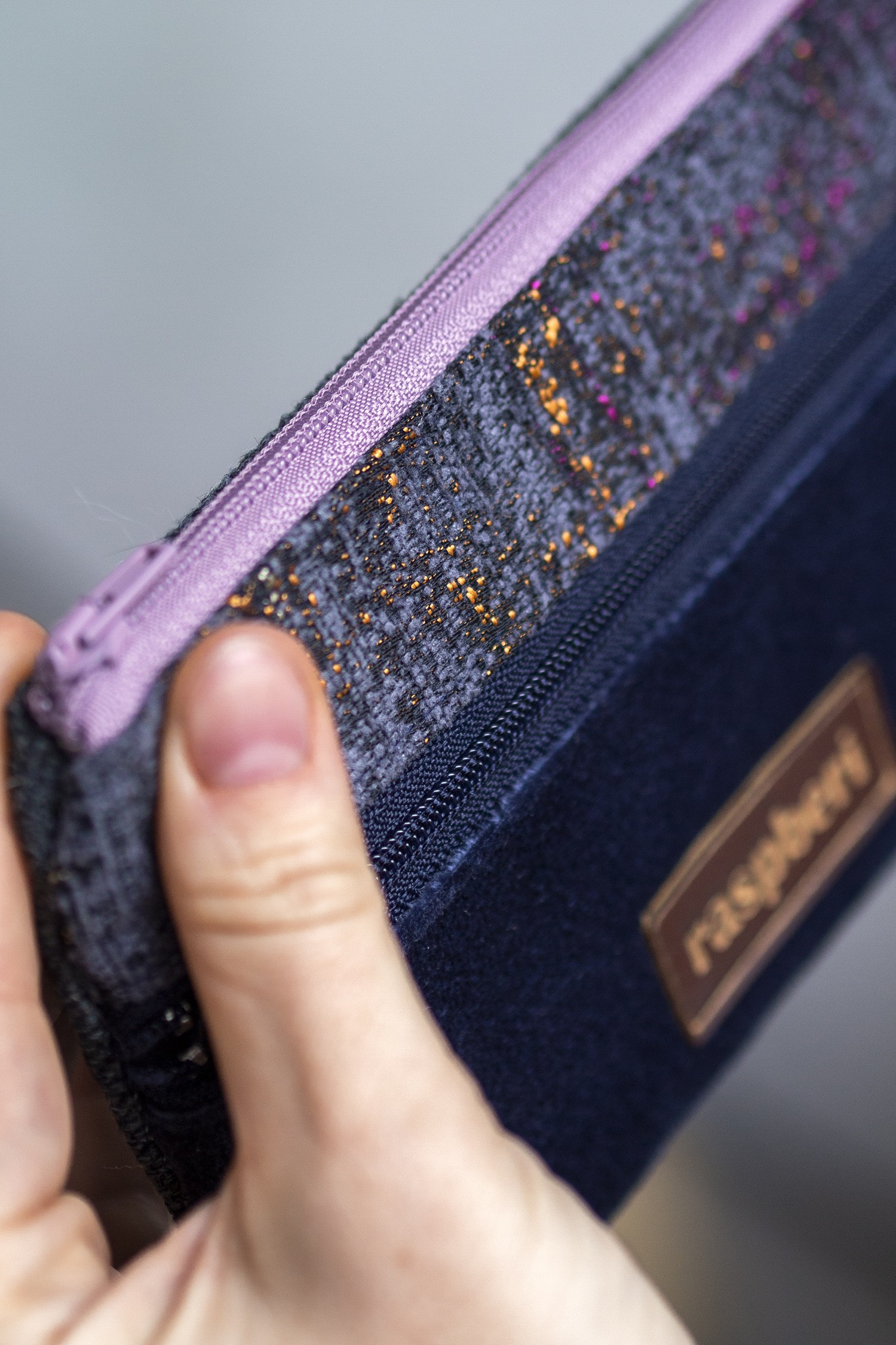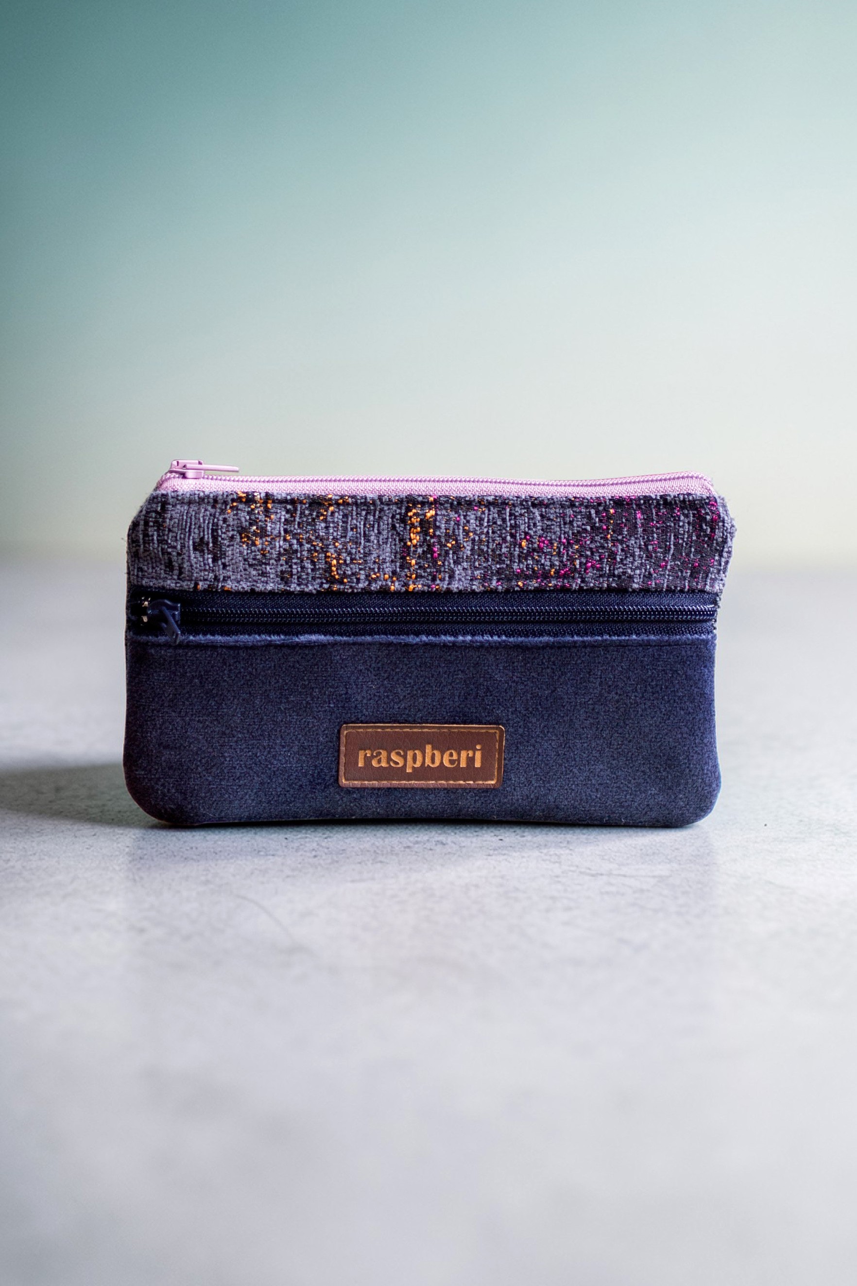 Prosty wodoodporny portfel wykonany z kilku rodzajów tkanin w odcieniach szarości i granatu.