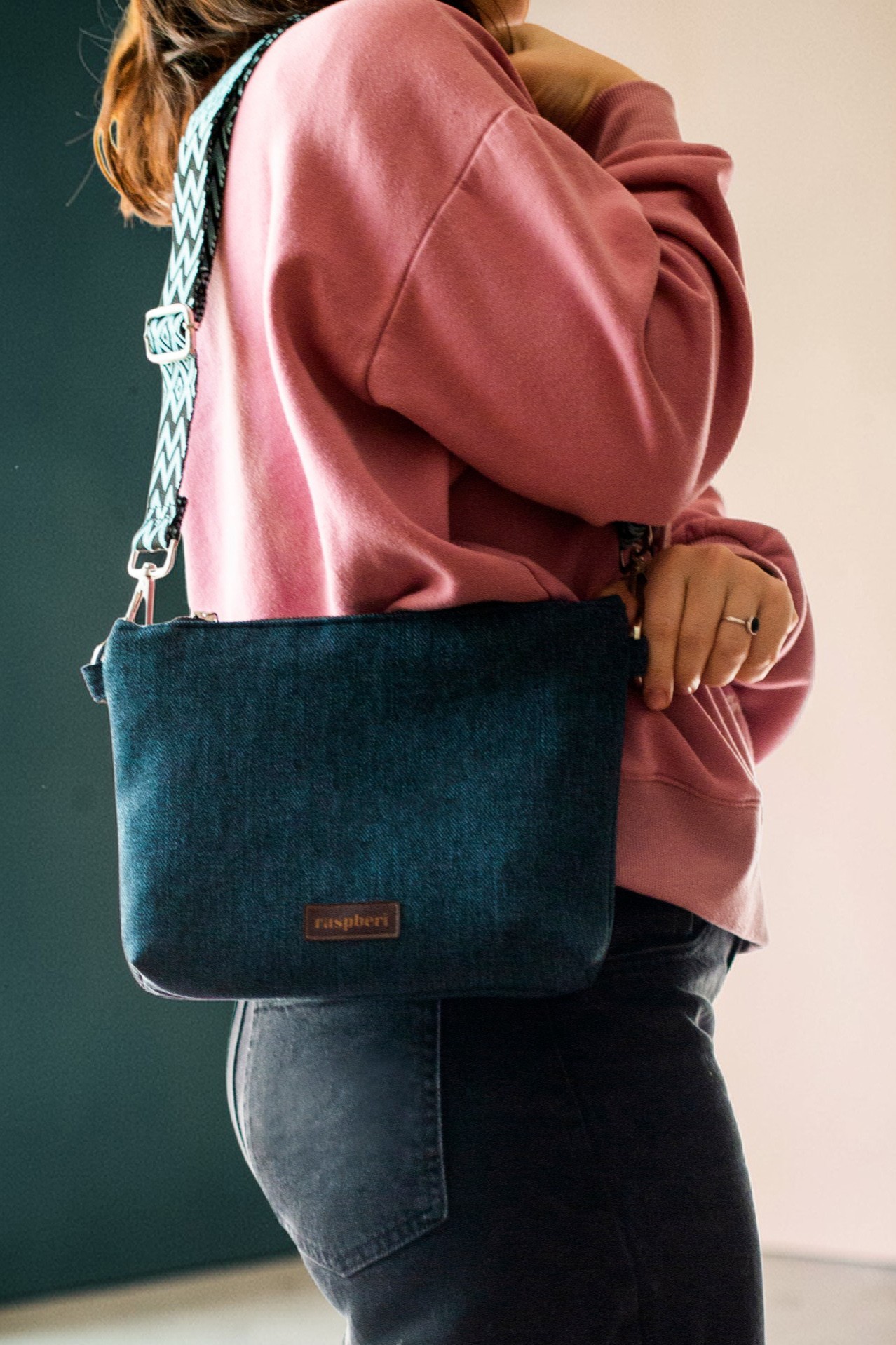 Torebka posiada regulowany, niebiesko-czarny pasek w zygzaki i srebrne okucia.