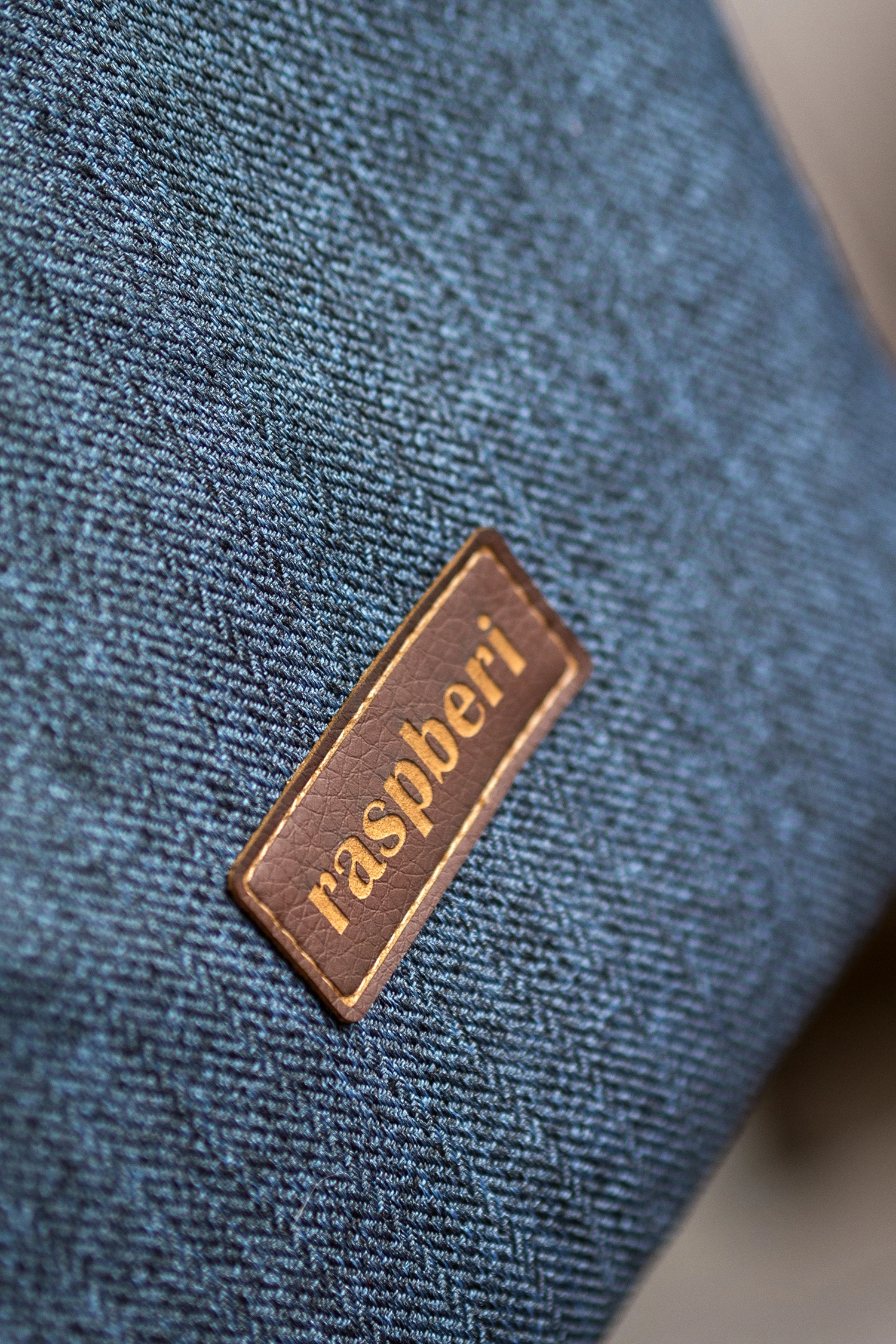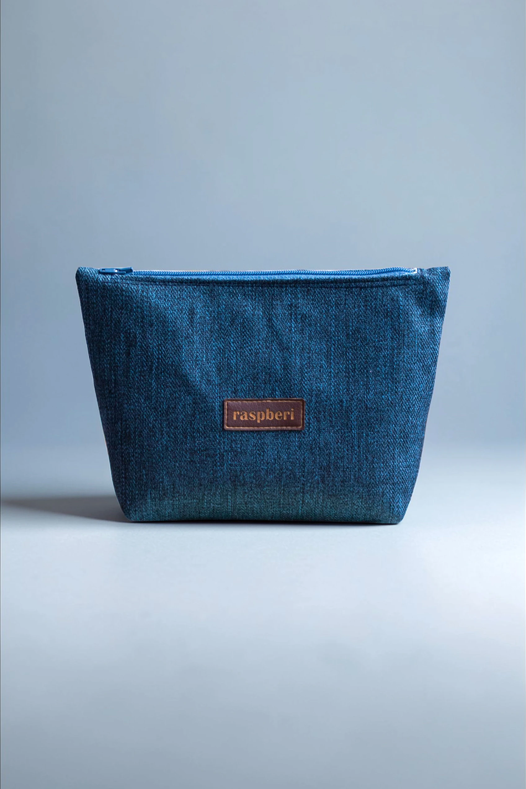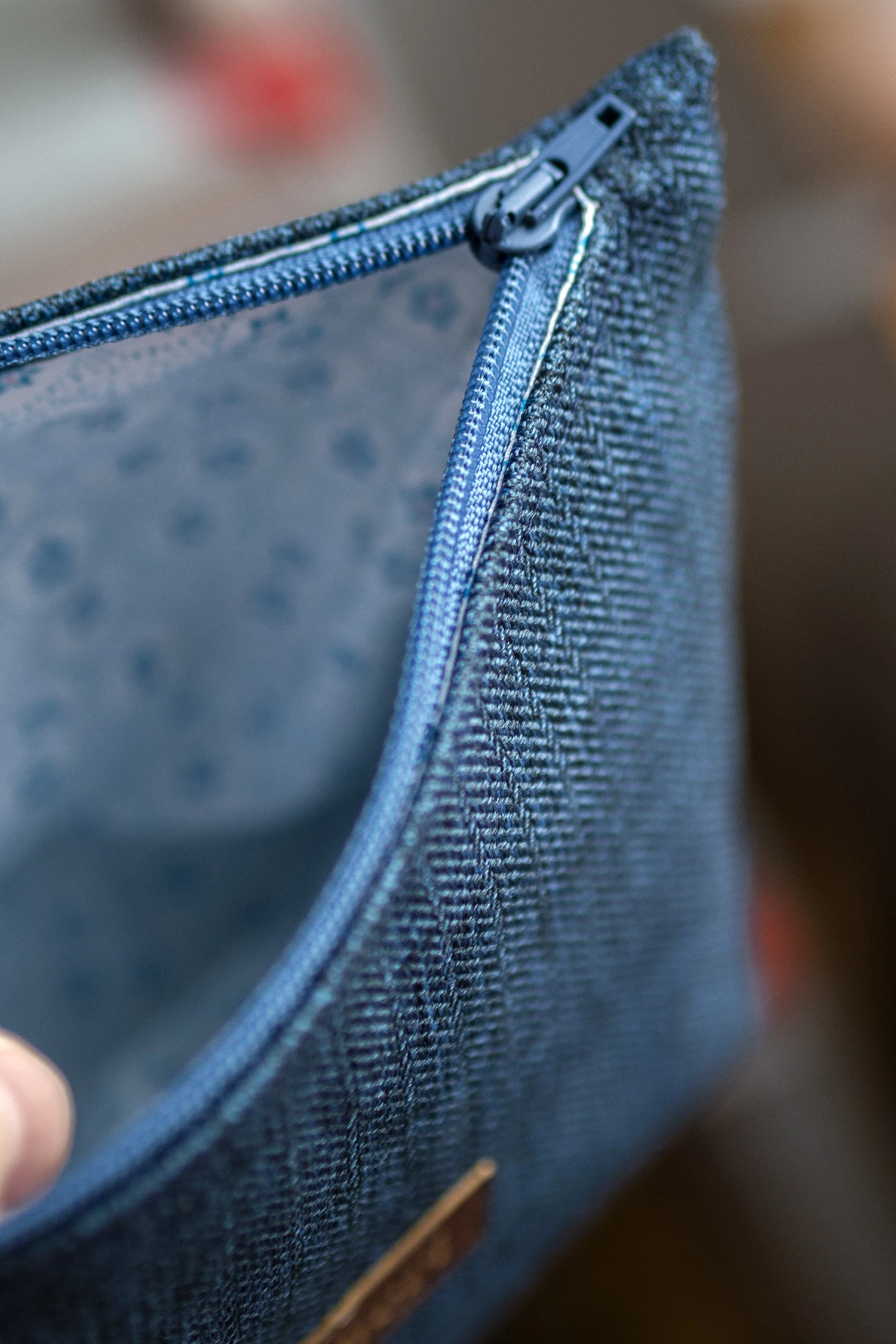 Duża kosmetyczka wykonana z granatowej tkaniny w jodełkę.