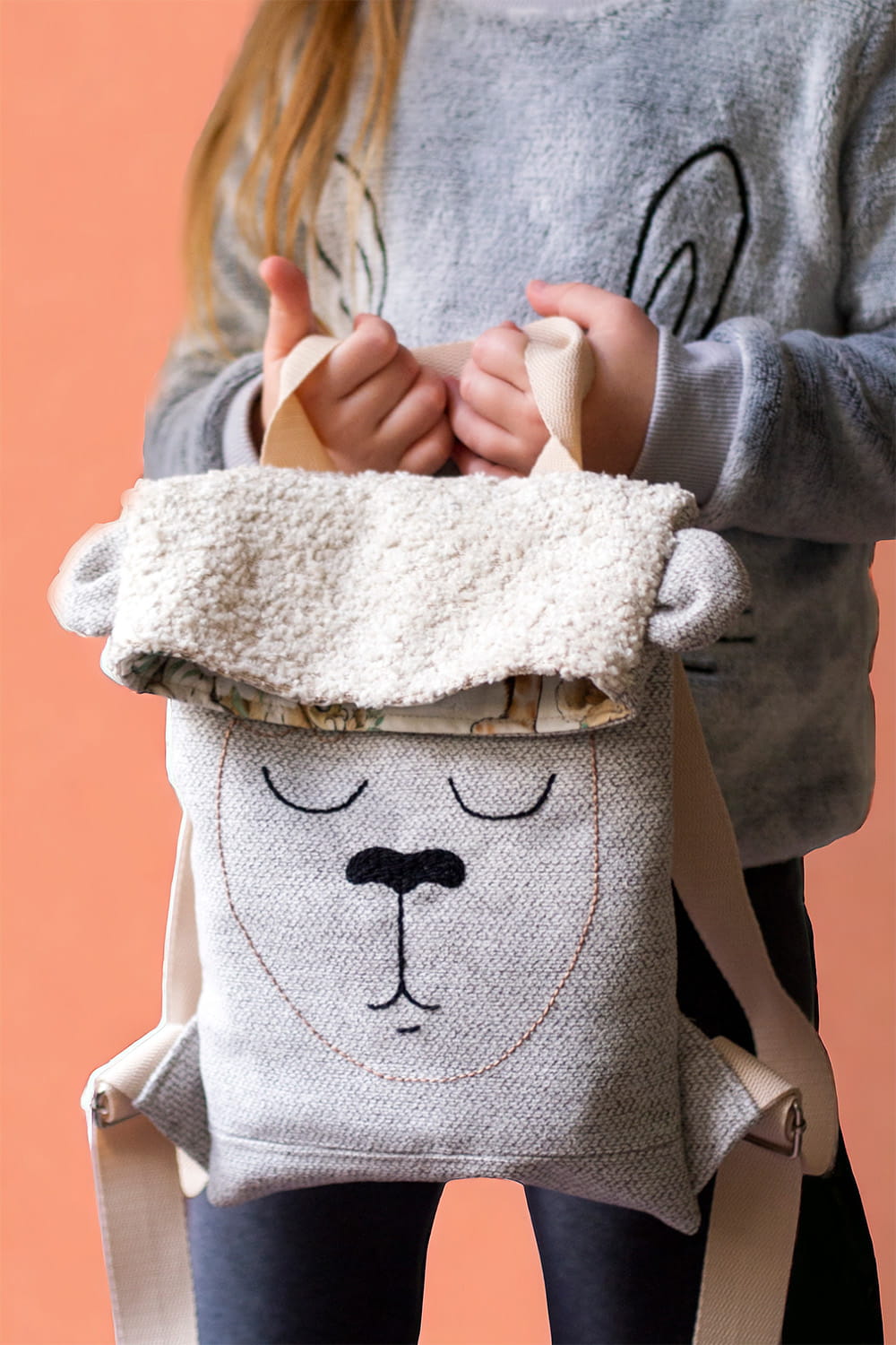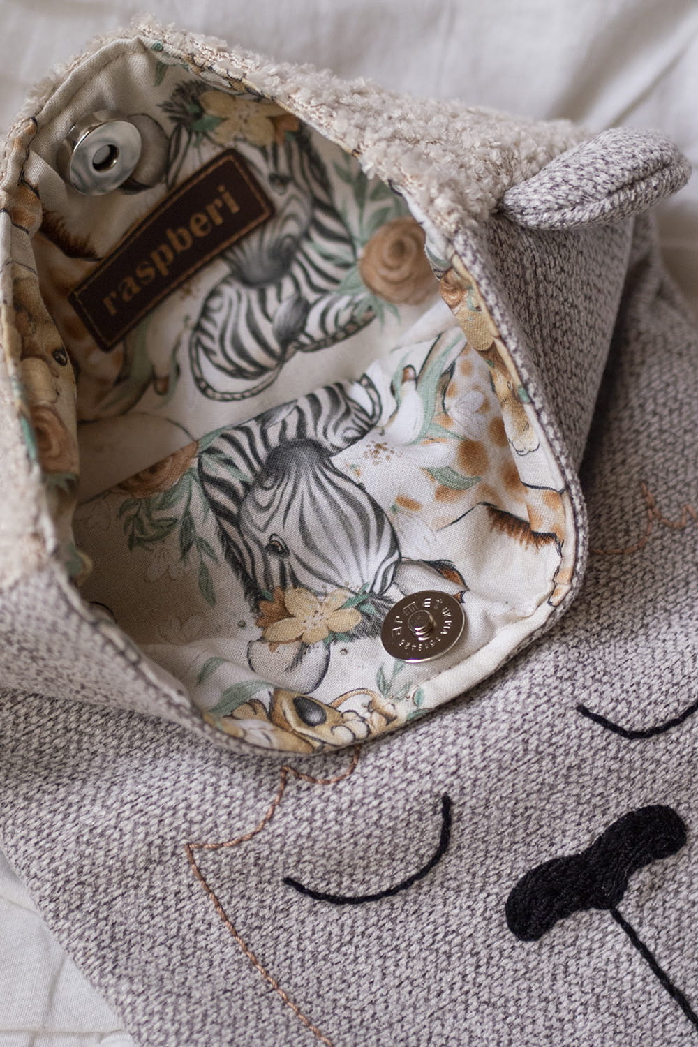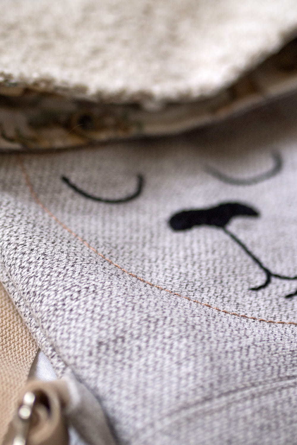 Wykonany z beżowych tkanin, z przodu ręcznie haftowany pyszczek lamy.