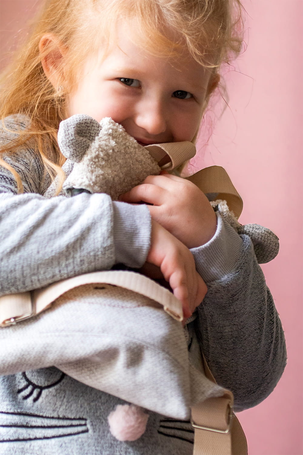 Regulowane parciane paski w kolorze beżowym, bawełniana podszewka z dziecięcym wzorem.