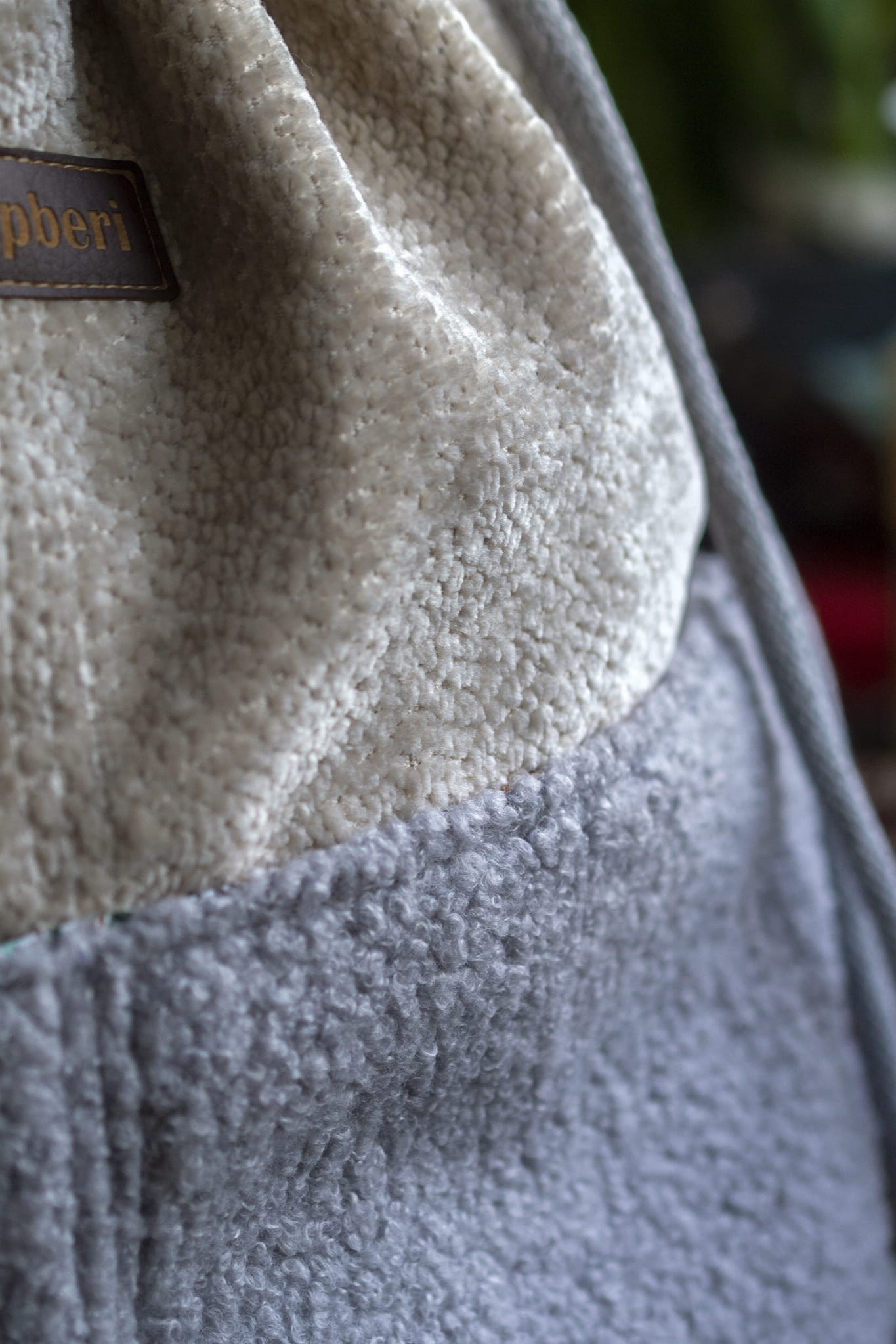 Dół tworzy dodatkowe miejsce na przechowywanie rzeczy - z przodu dwie kieszenie (np. na butelkę), z tyłu jedną duża kieszeń (idealna na tablet). Wykonane z jasnoszarej tkaniny typu "baranek".