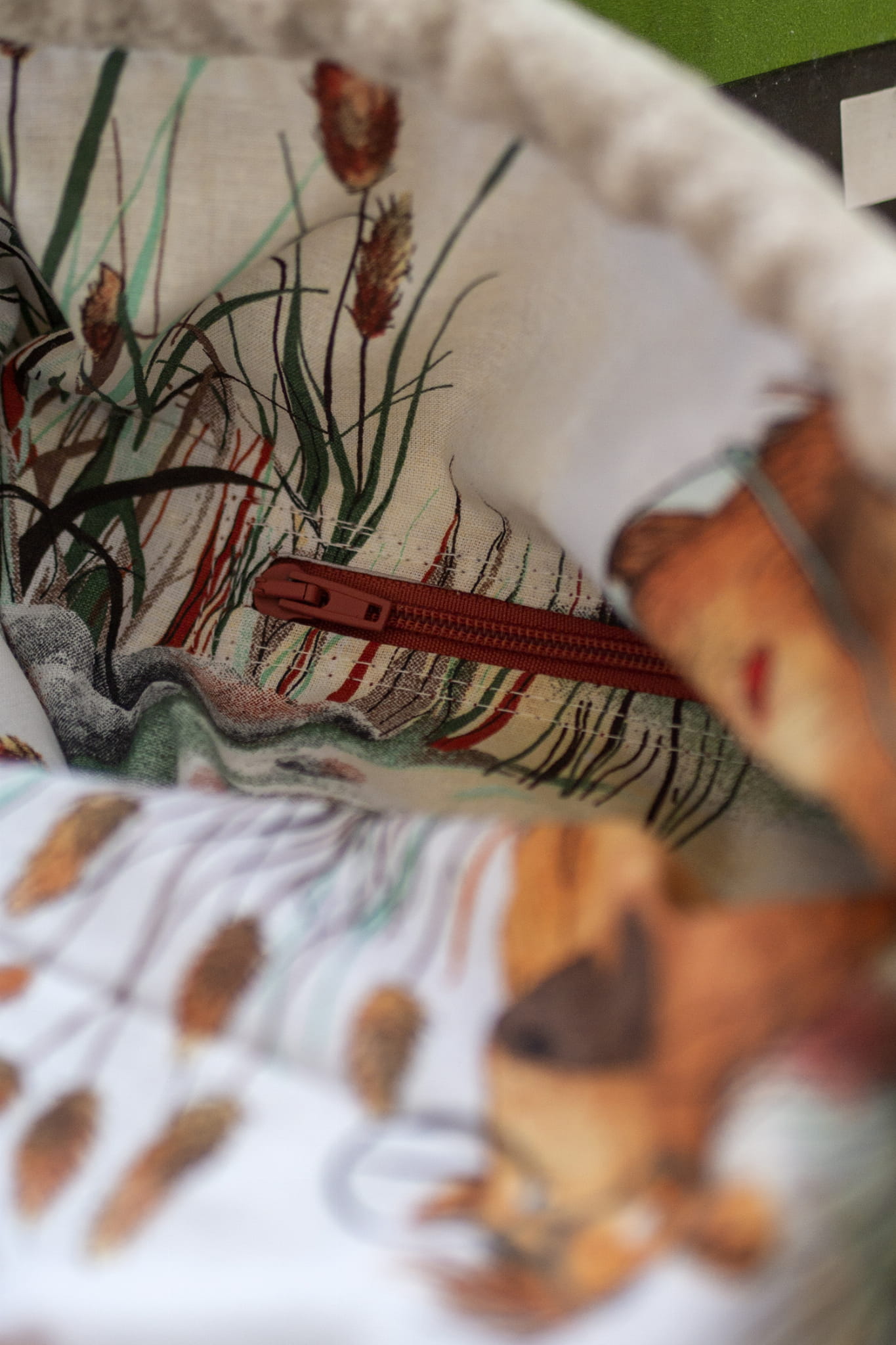 W środku plecak posiada kieszeń zapinaną na suwak. Wykończony jest bawełnianą podszewkę w kapibary.