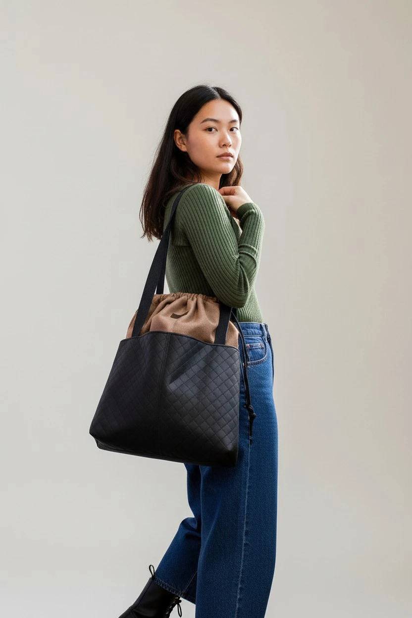 Wykonana z weluru w kolorze karmelowym oraz czarnej pikowanej ekoskóry. Bawełniane, czarne pasy i czarna, gładka, bawełniana podszewka.