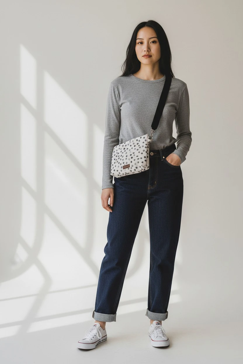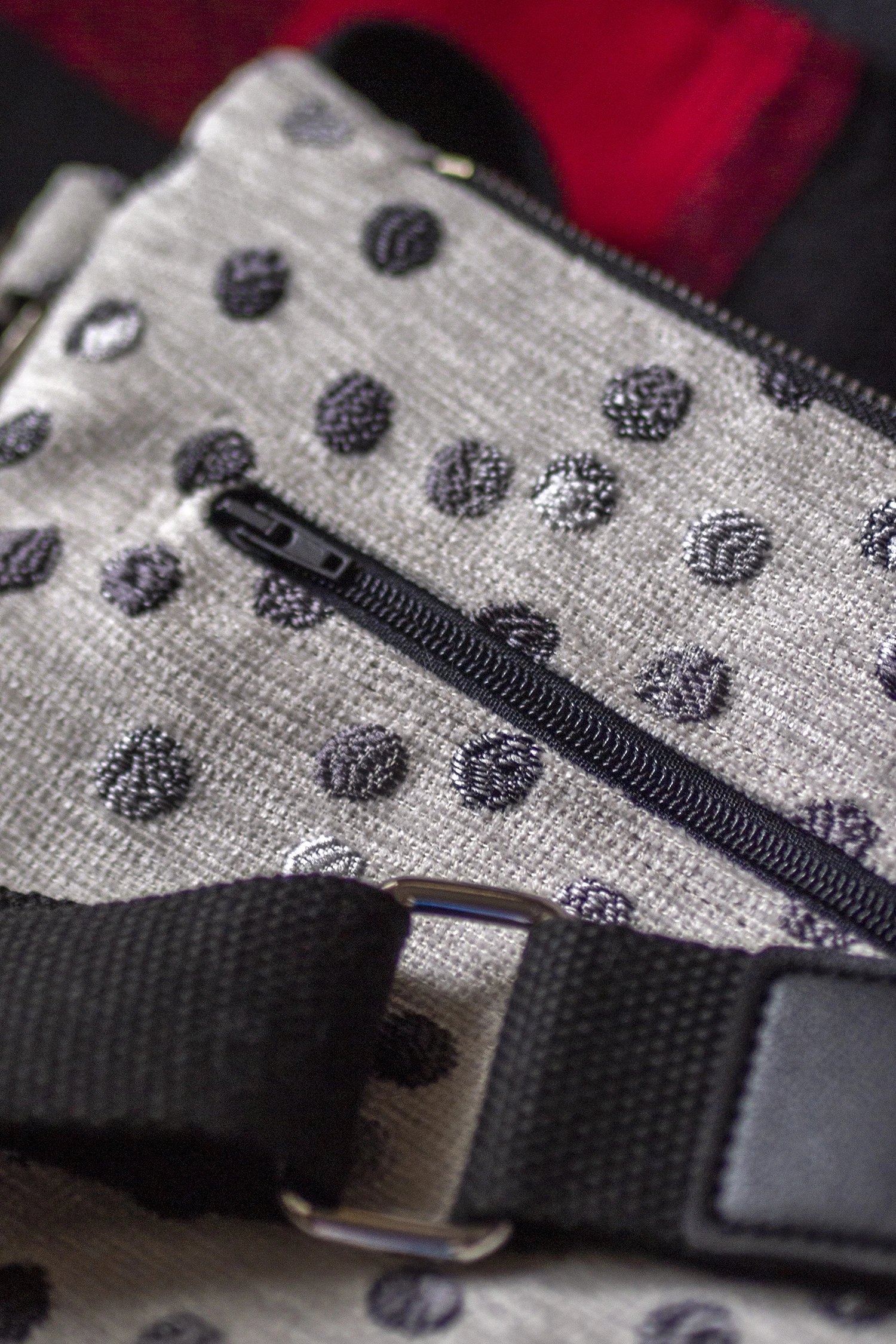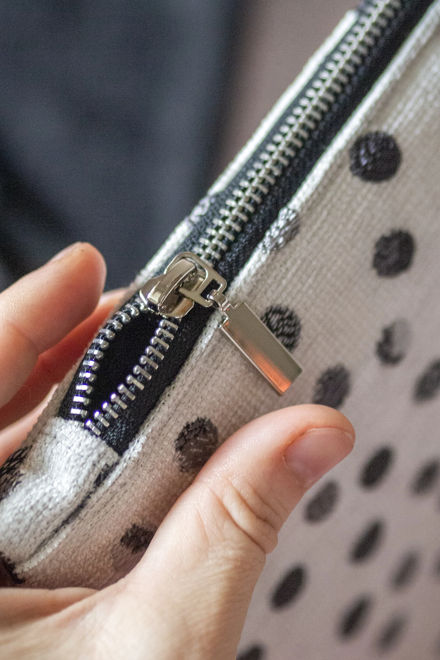 Prosta torebka, kopertówka w średnim rozmiarze wykonana z żakardu w grochy. Zapinana na suwak.
