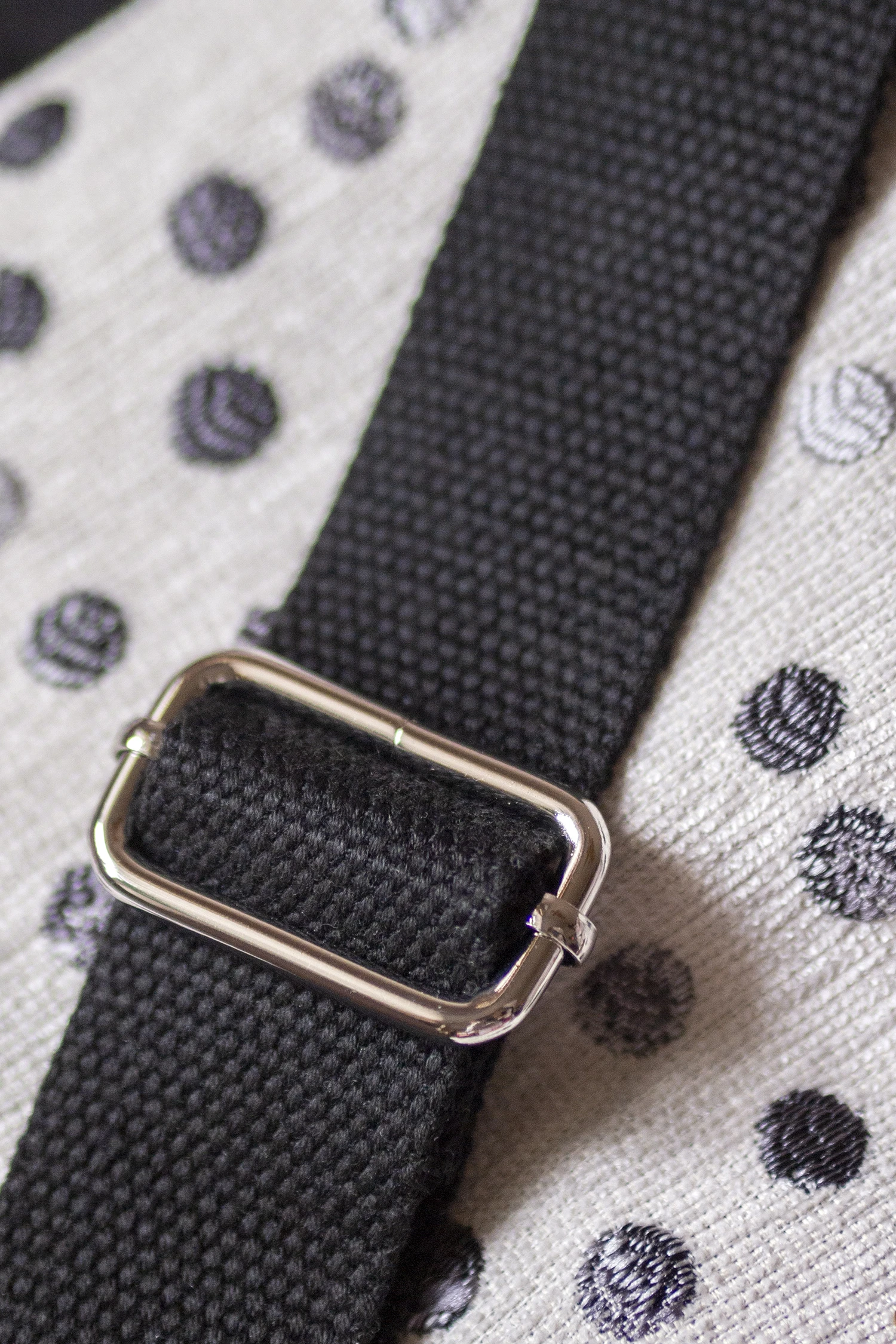 Torebka posiada regulowany, czarny pasek i srebrne okucia.