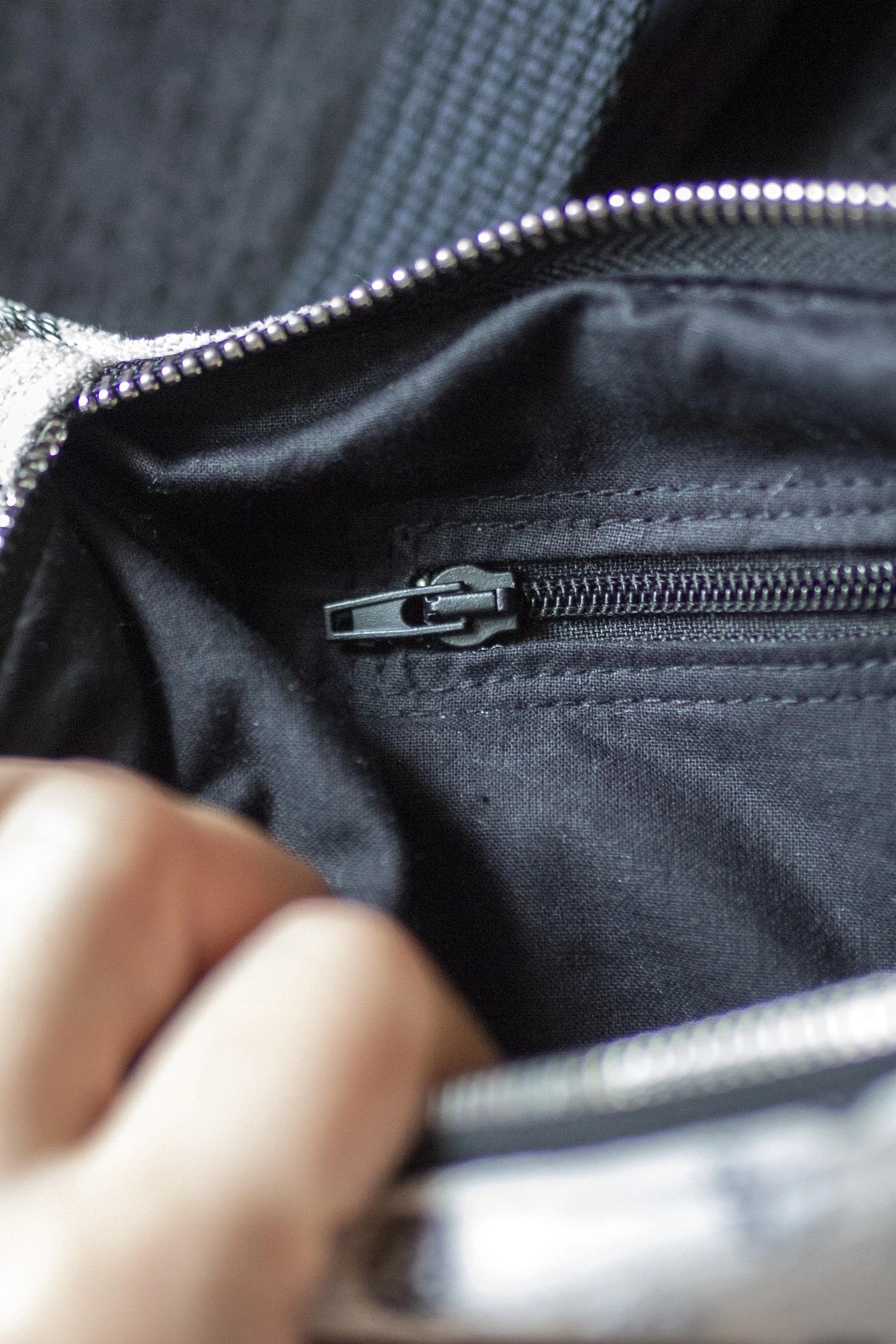 Małe zaszewki na dnie. Z tyłu oraz w środku torebki kieszonki zapinane na suwak. Środek wykończony bawełnianą podszewką.
