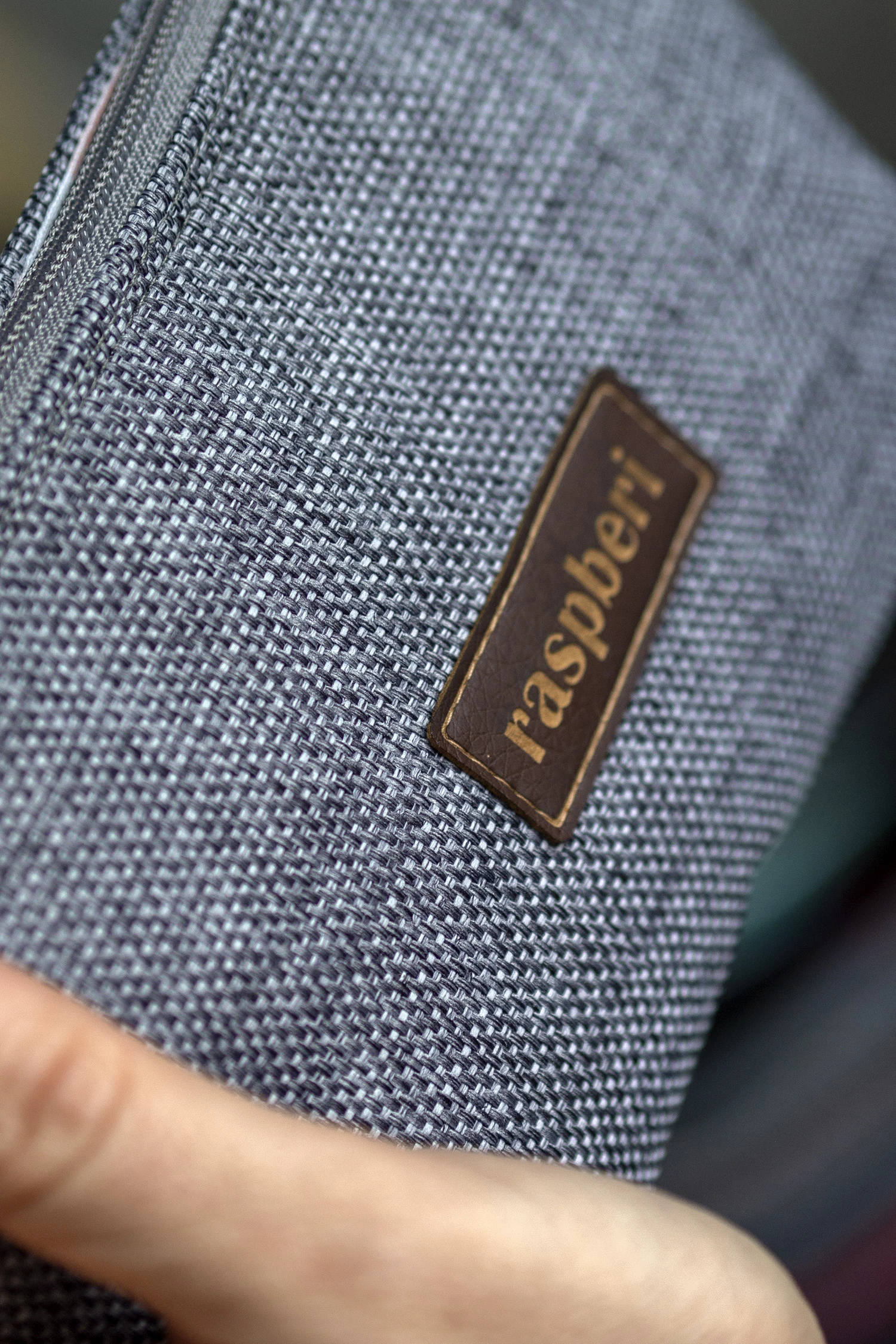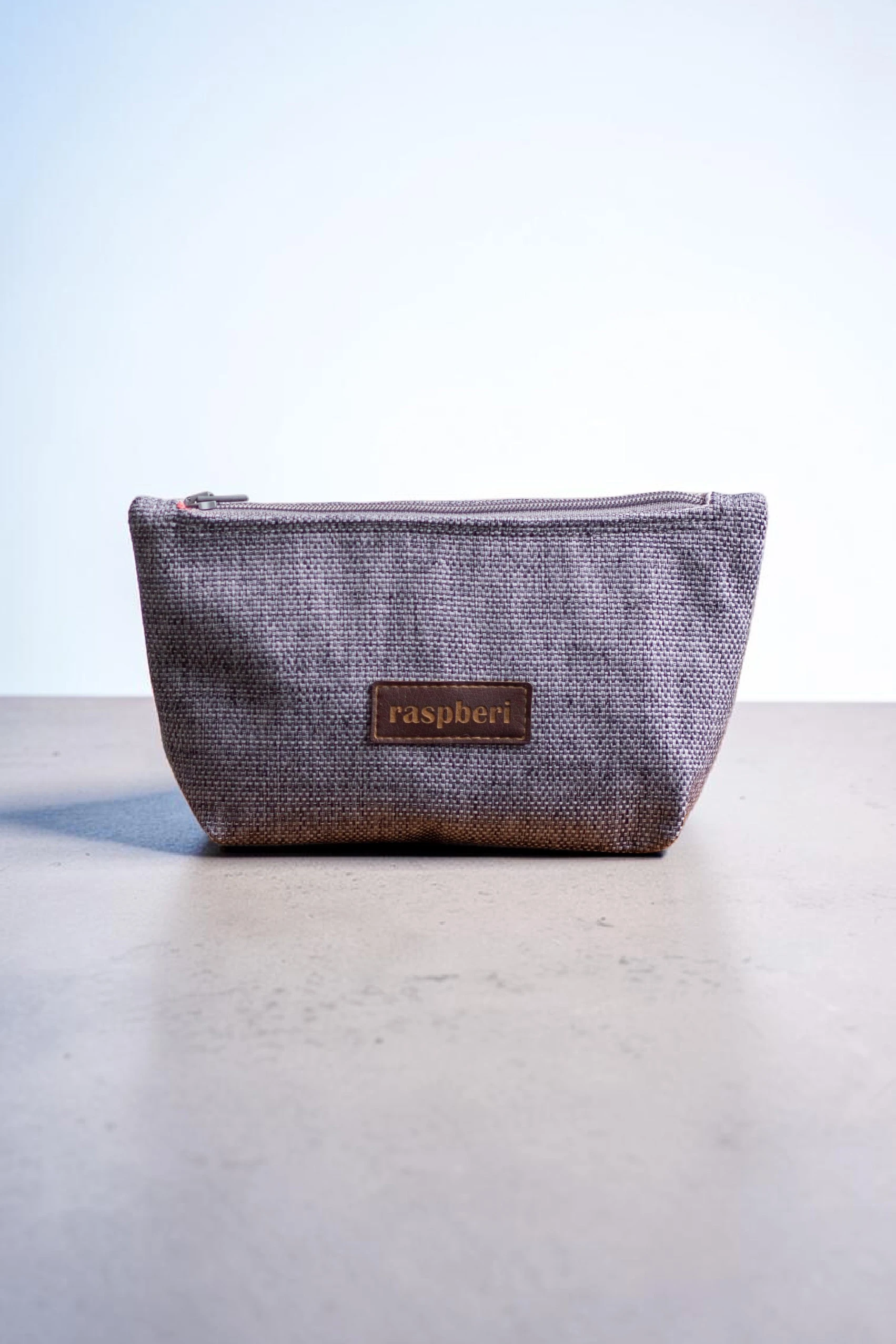 Średniej wielkości kosmetyczka w kolorze szarym.