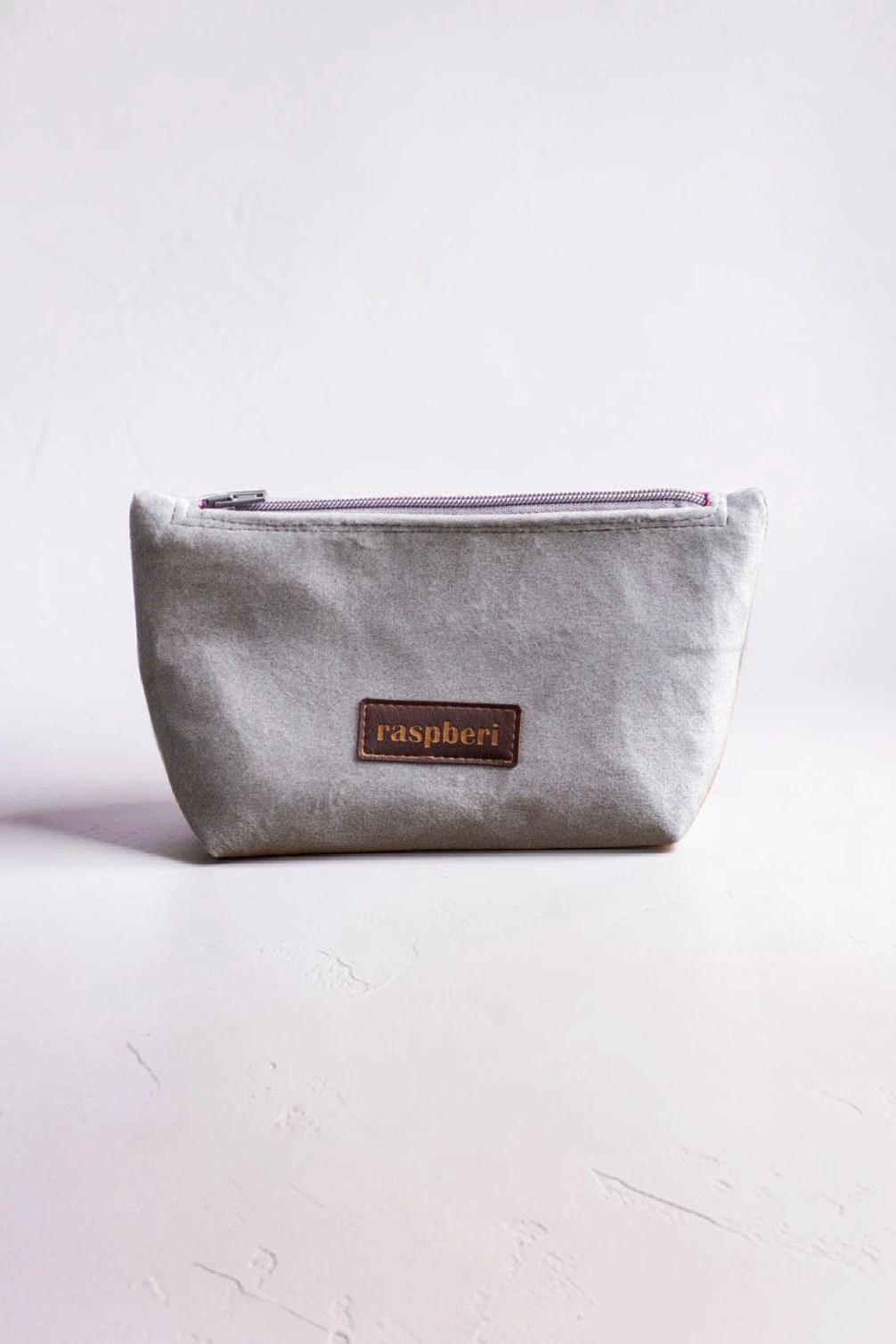Średniej wielkości kosmetyczka wykonana z jasnoszarego weluru.