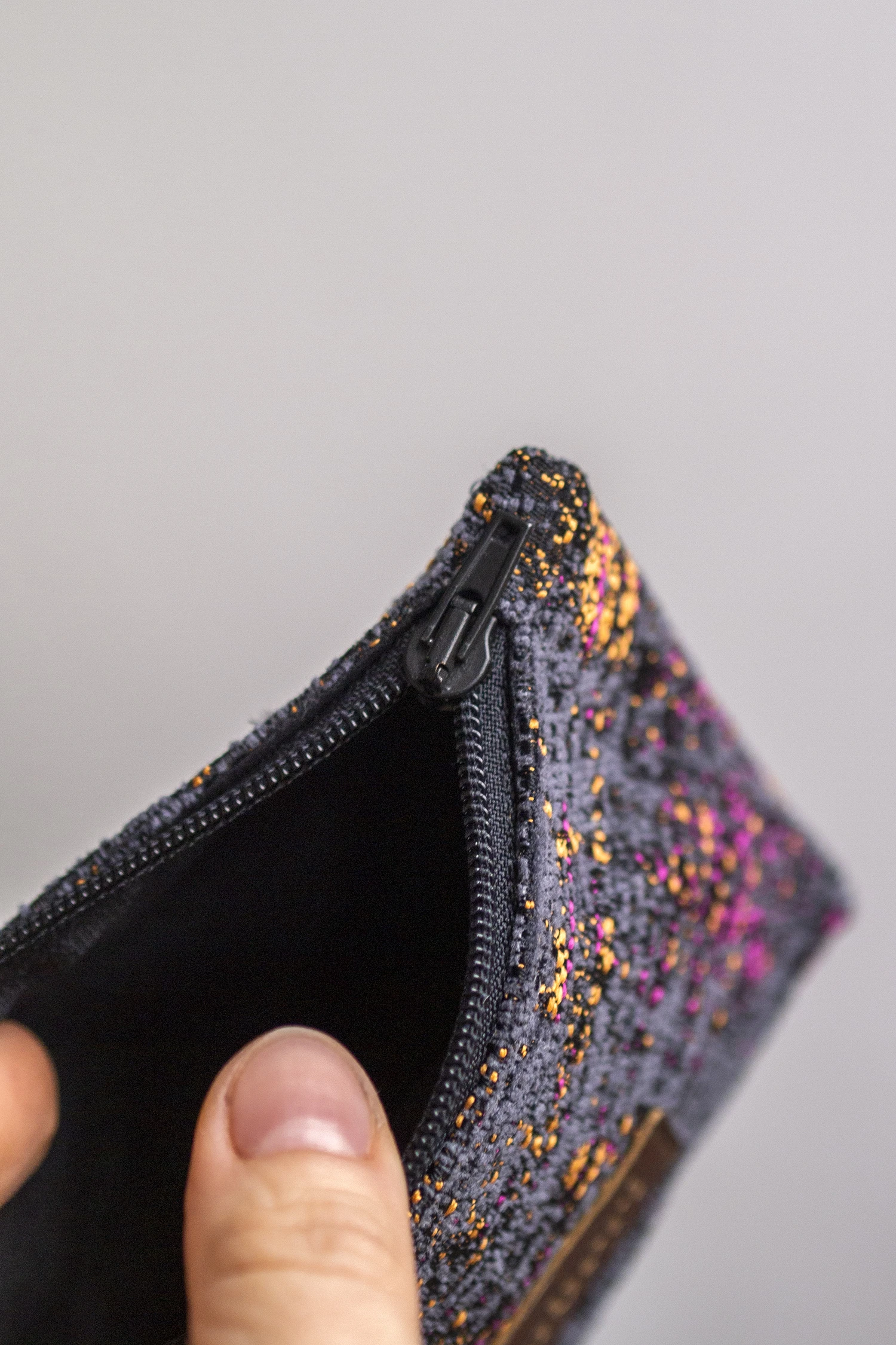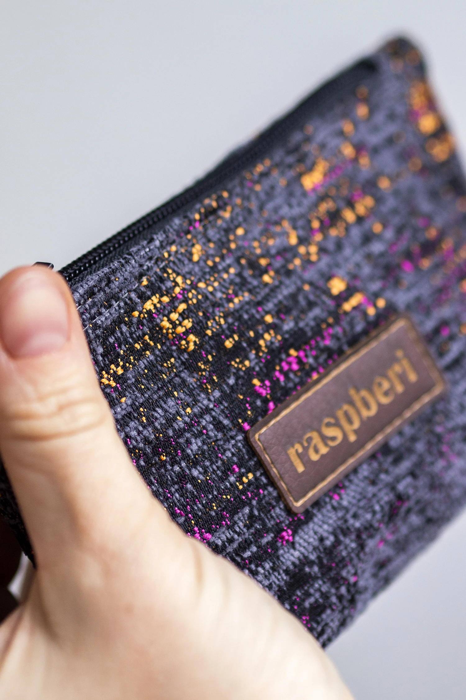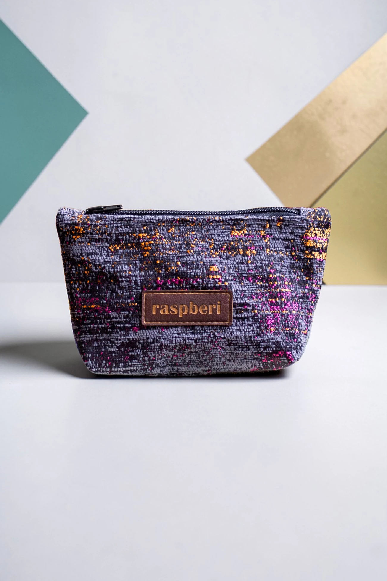 Kosmetyczka w rozmiarze MINI wykonana z grafitowej tkaniny przeplecionej kolorową nitką.