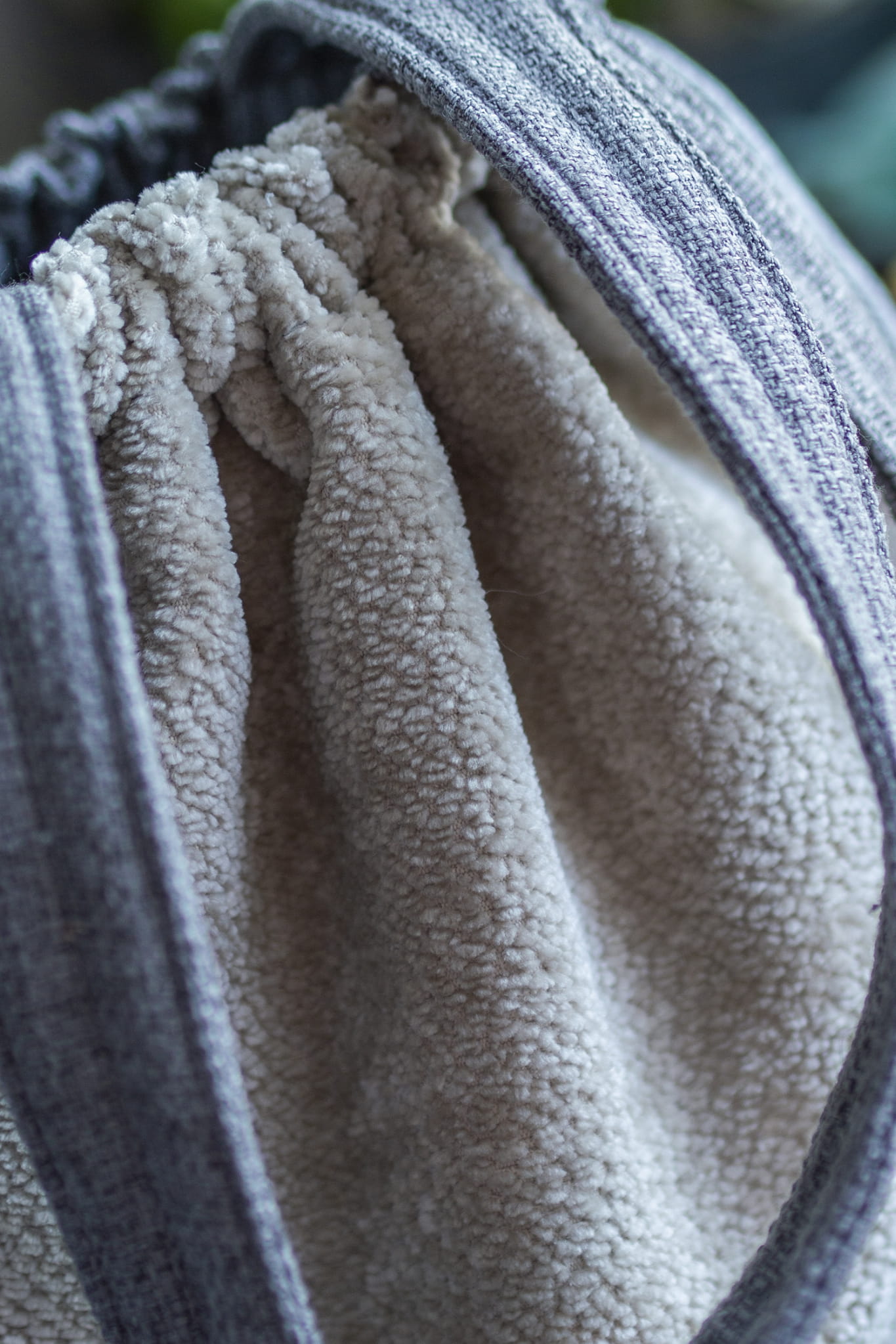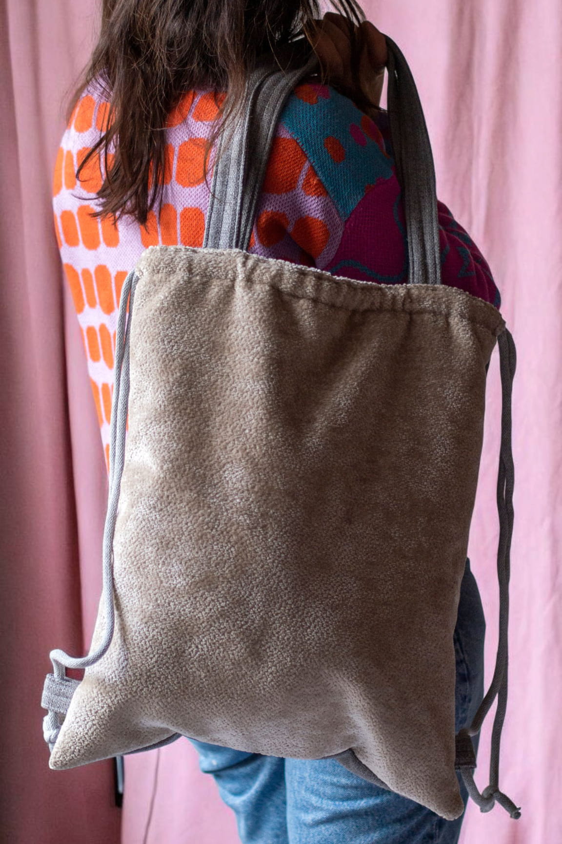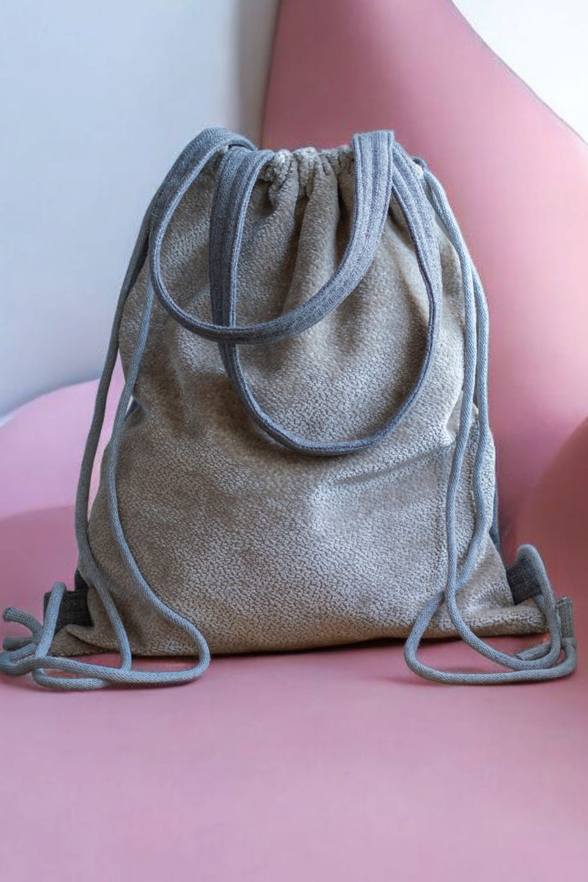 Plecakotorba worek 2w1 wykonana z lekko połyskującej tkaniny typu baranek w kolorze kremowym w połączeniu z szarą tkaniną o delikatnym splocie.