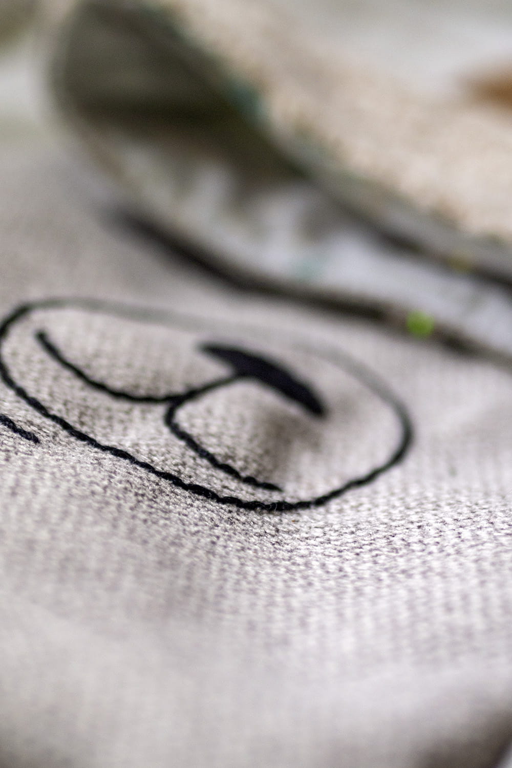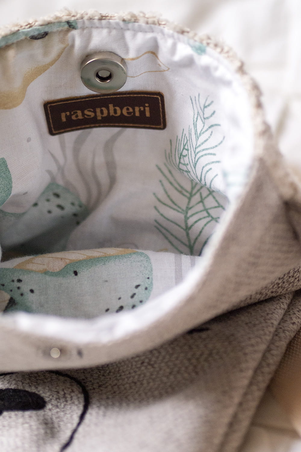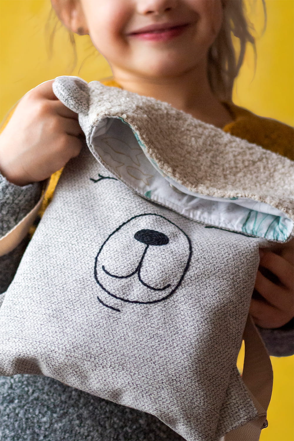 Wykonany z beżowych tkanin, z przodu ręcznie haftowany pyszczek lamy.