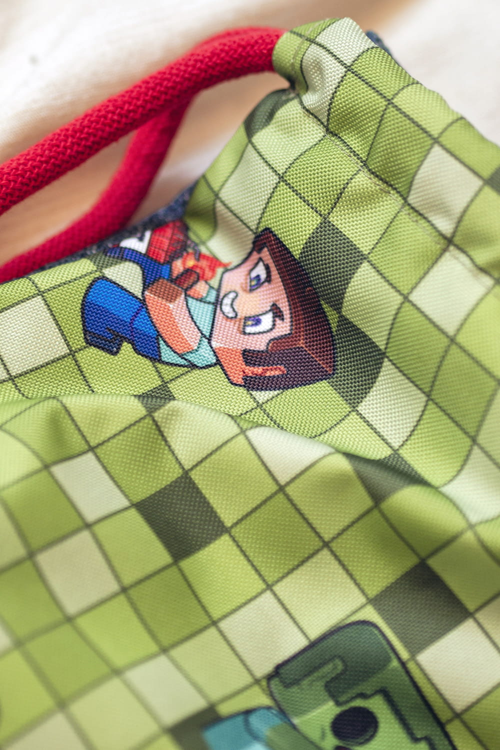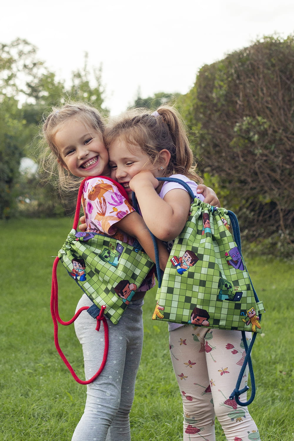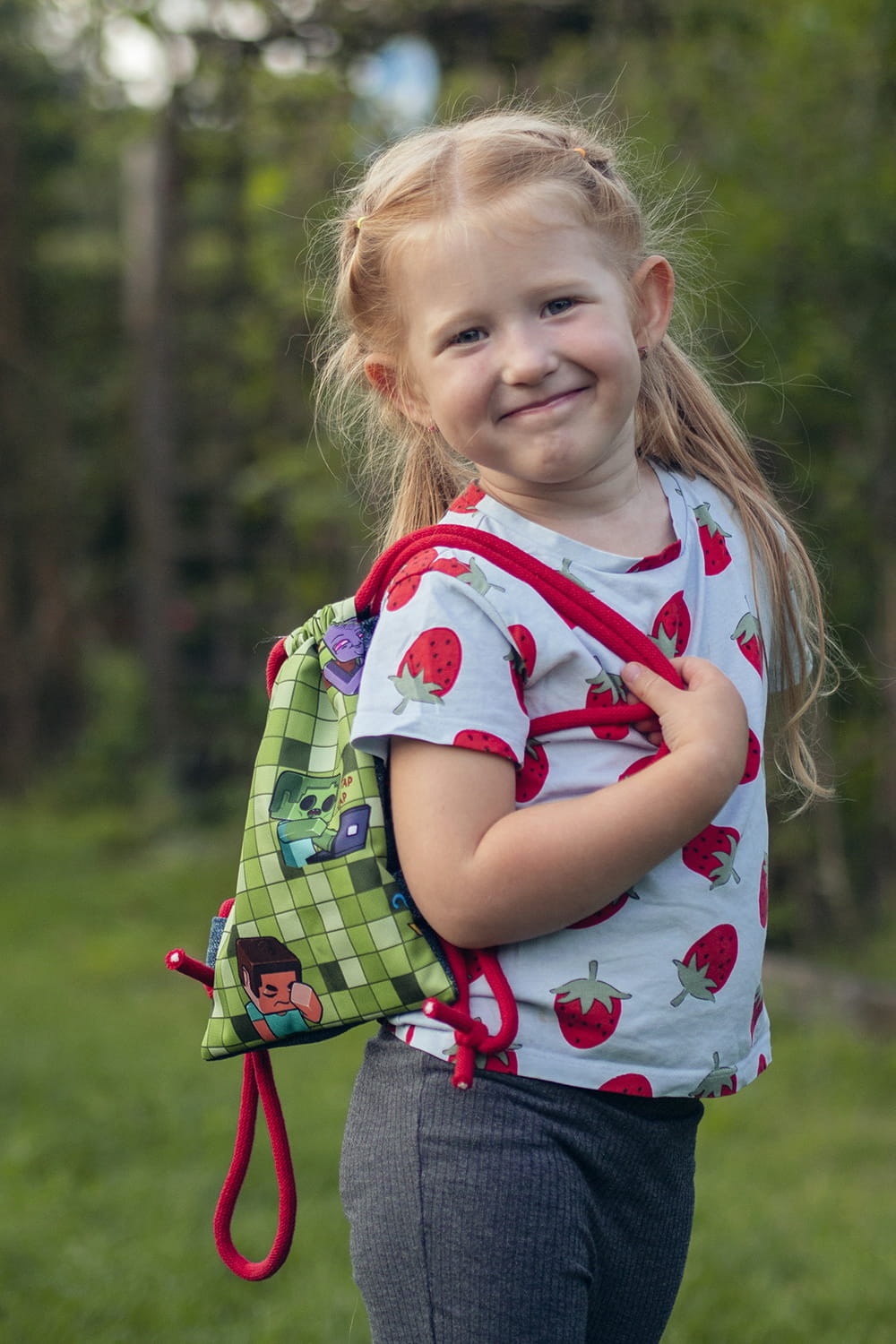 Dziecięcy plecaczek worek wykonany z wodoodpornego poliestru oraz granatowej plecionki. Bawełniane sznurki w kolorze czerwonym.