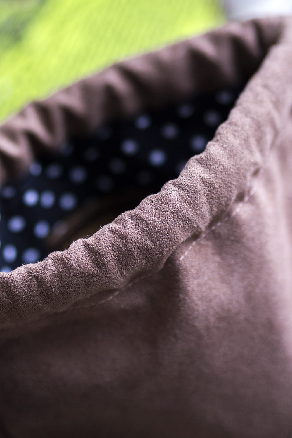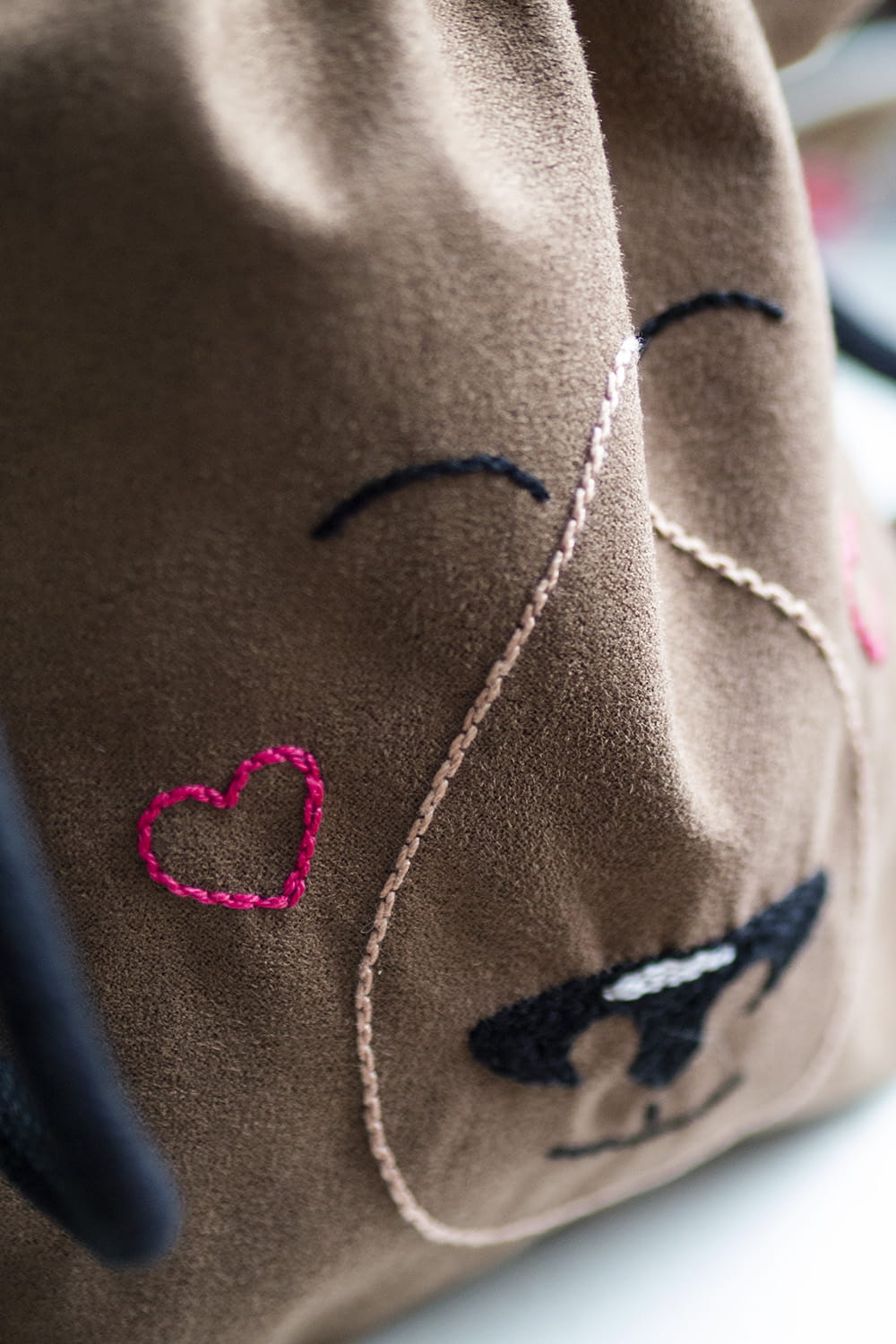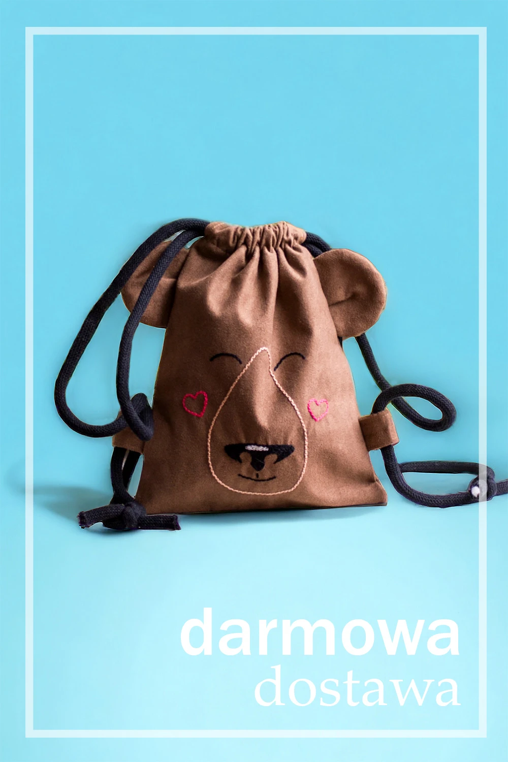 Dziecięcy plecaczek worek wykonany z brązowego nubuku. Ręcznie haftowany pyszczek misia. Bawełniane sznurki w kolorze czarnym.
