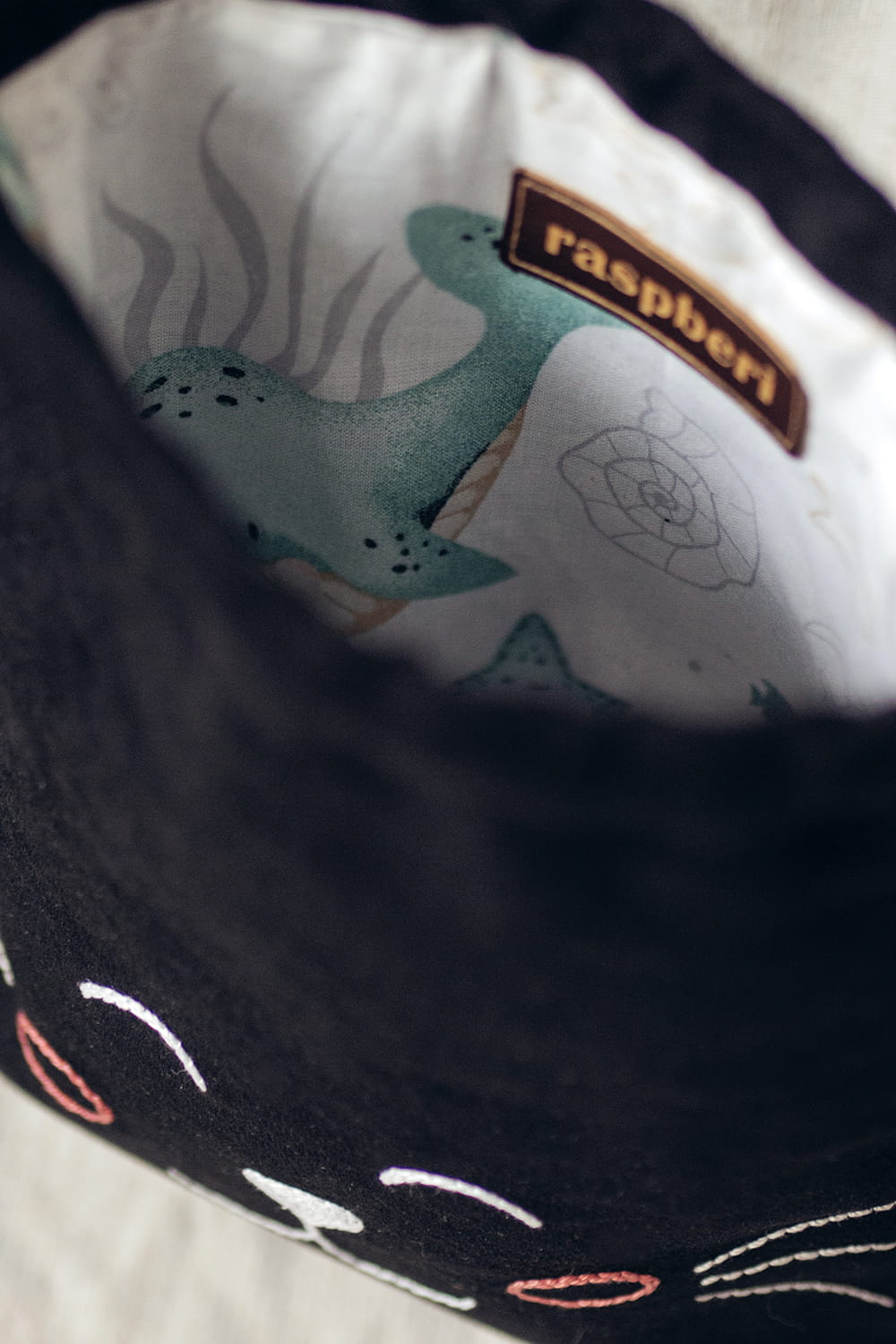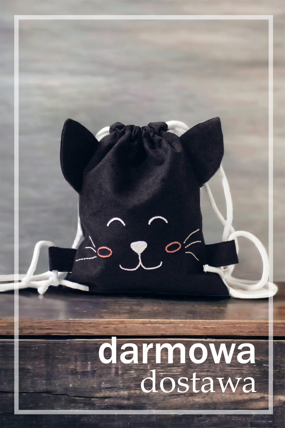 Dziecięcy plecaczek worek wykonany z czarnego nubuku. Ręcznie haftowany pyszczek kotka. Bawełniane sznurki w kolorze białym.