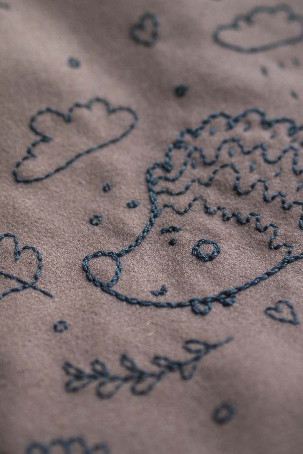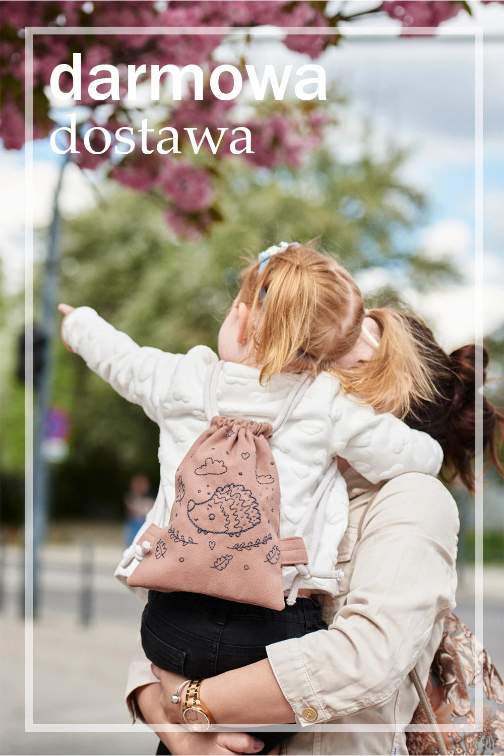 Dziecięcy plecaczek worek wykonany z jasnobrązowego flauszu. Ręcznie haftowany jeżyk. Bawełniane sznurki w kolorze perłowym.