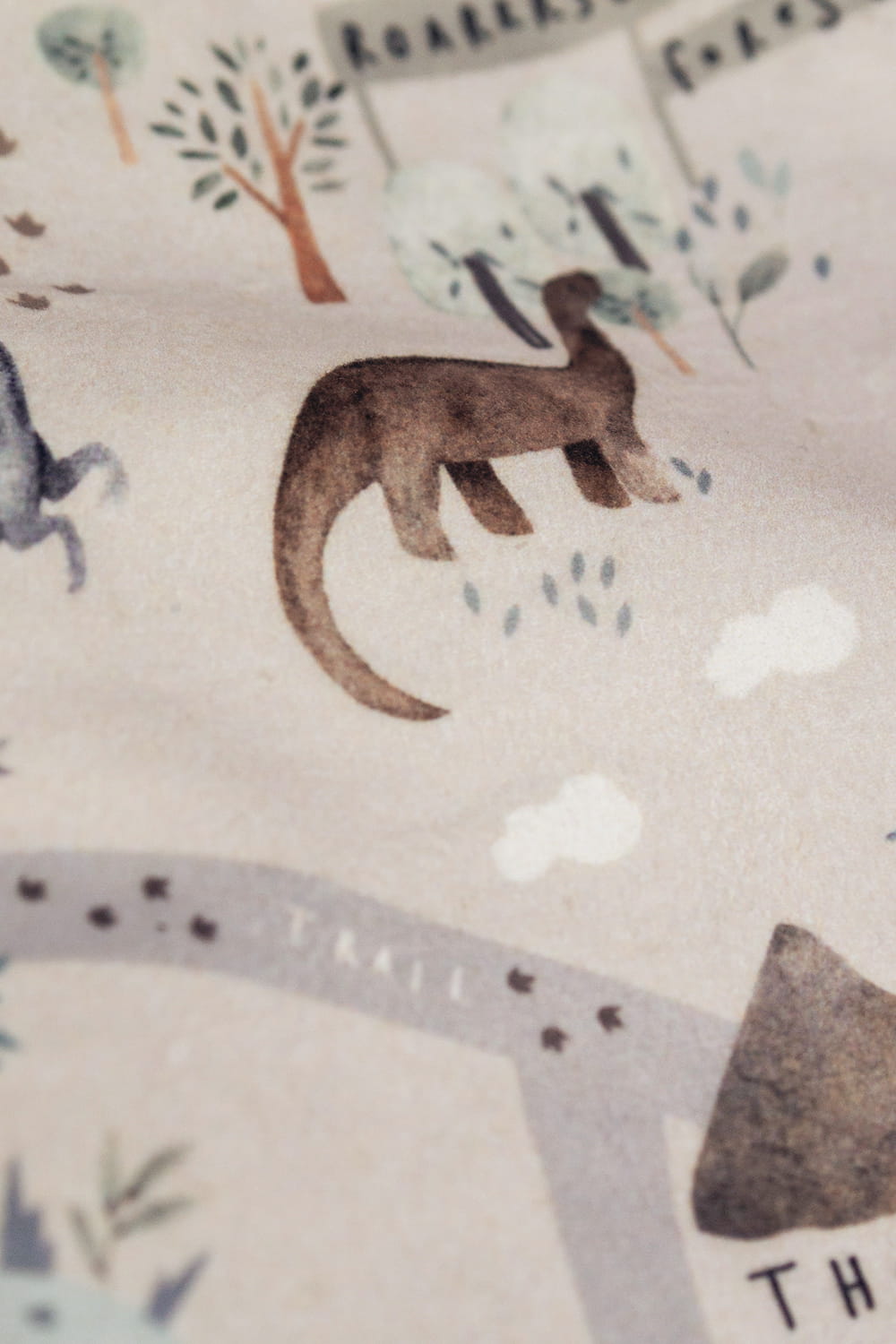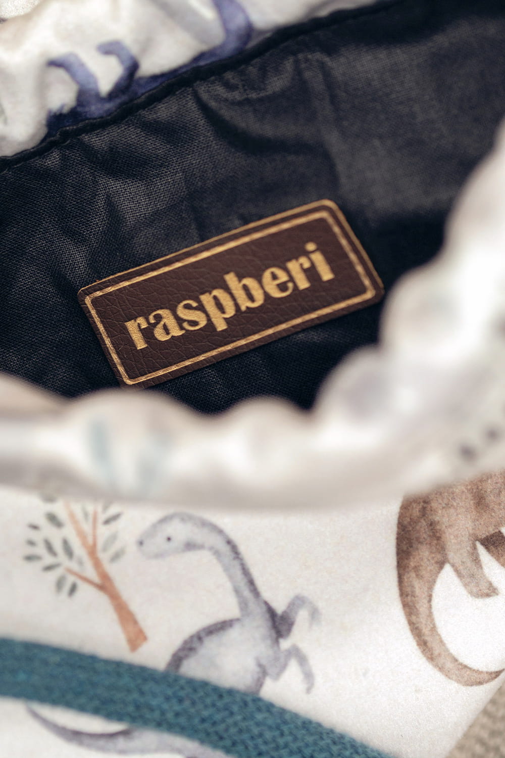 Dziecięcy plecaczek worek wykonany z jasnego weluru w dinozaury. Bawełniane sznurki w kolorze petrol.