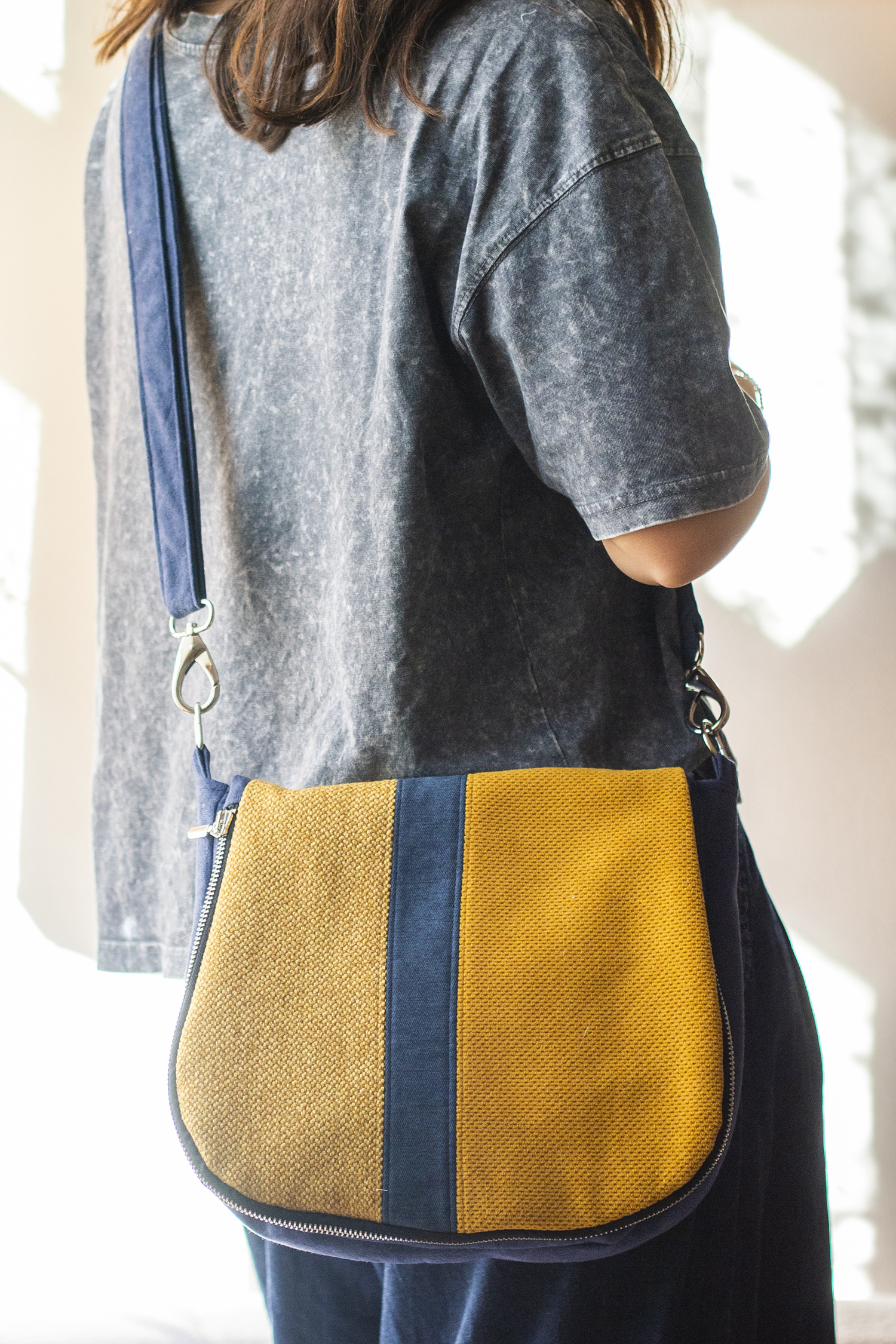 Średniej wielkości torebka listonoszka na ramię wykonana z granatowej mikrofazy. Klapa w kolorze miodowym.