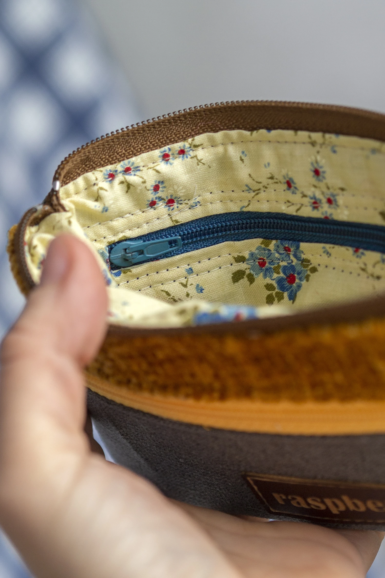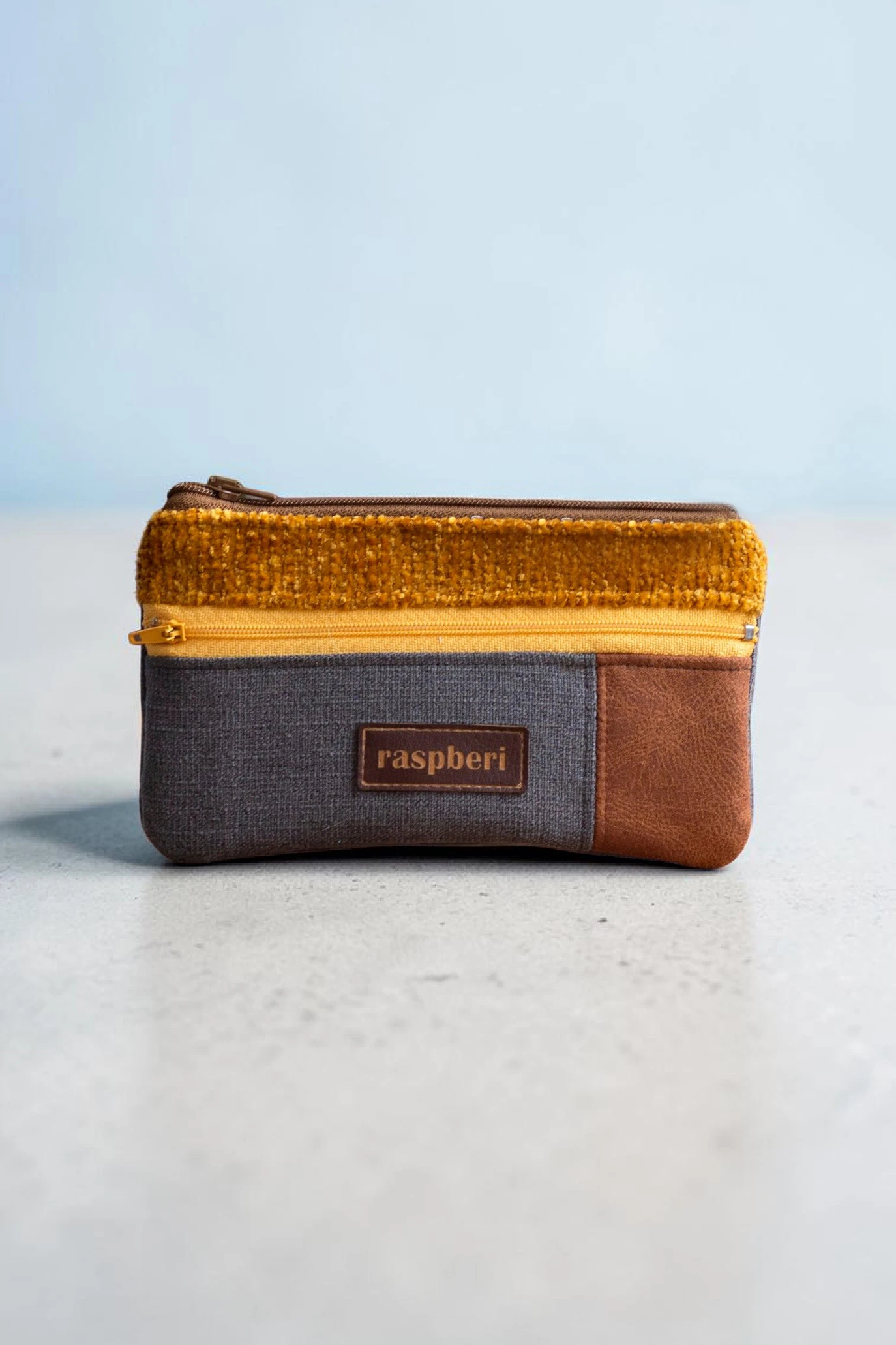 Prosty portfel wykonany z kilku rodzajów tkanin w kolorach miodowym, rudym i grafitowym.