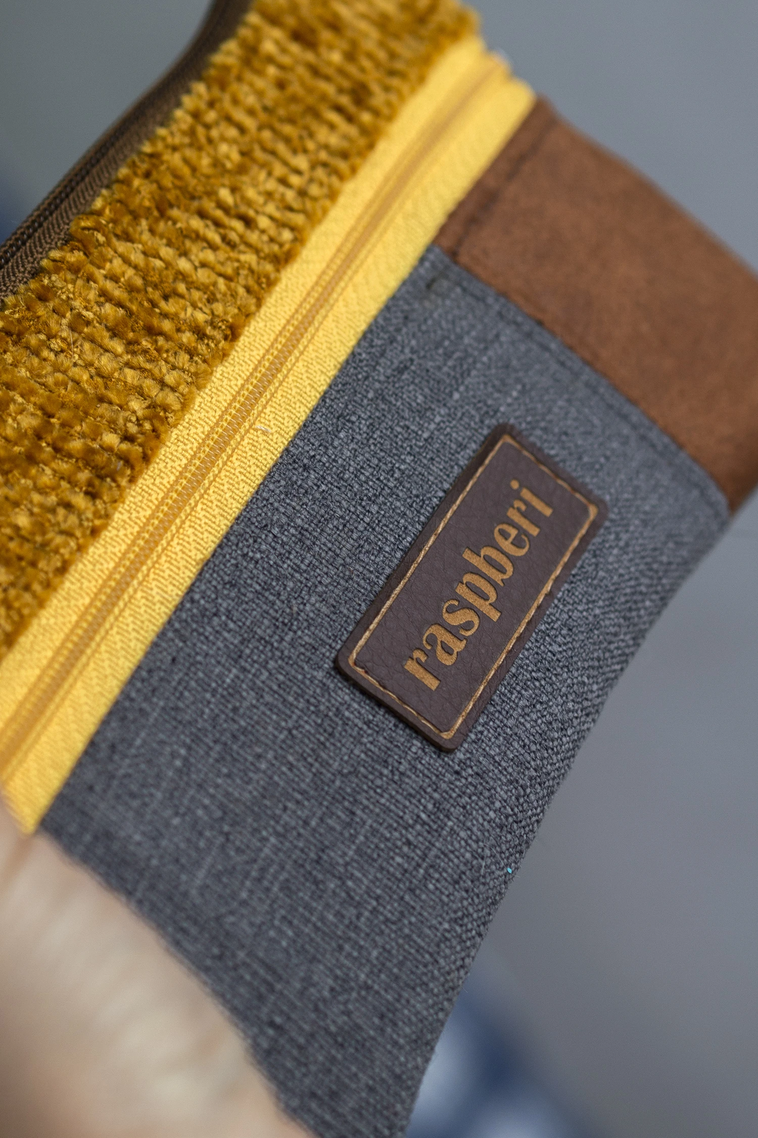 Prosty portfel wykonany z kilku rodzajów tkanin w kolorach miodowym, rudym i grafitowym. Portfel wykonany tylko w jednym egzemplarzu. Stworzony w duchu no waste.