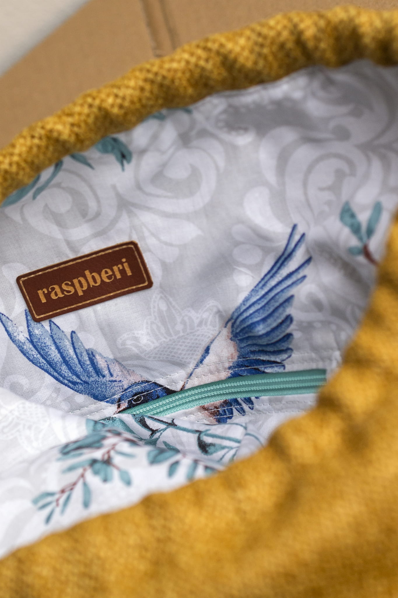 Bbiała, bawełniana podszewka we wzory. Kieszonka w środku.