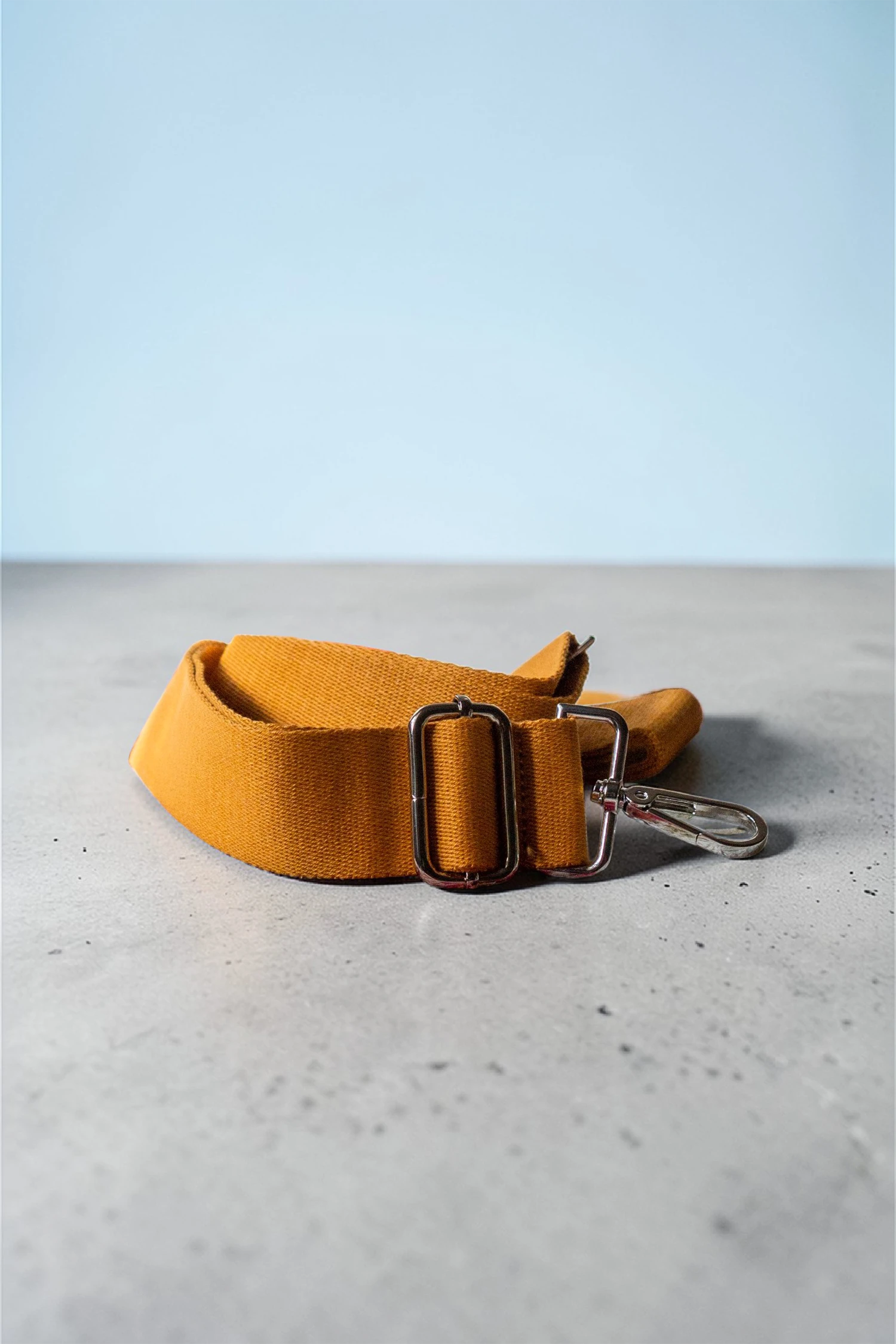 Regulowany pasek w kolorze miodowym. Srebrne okucia.