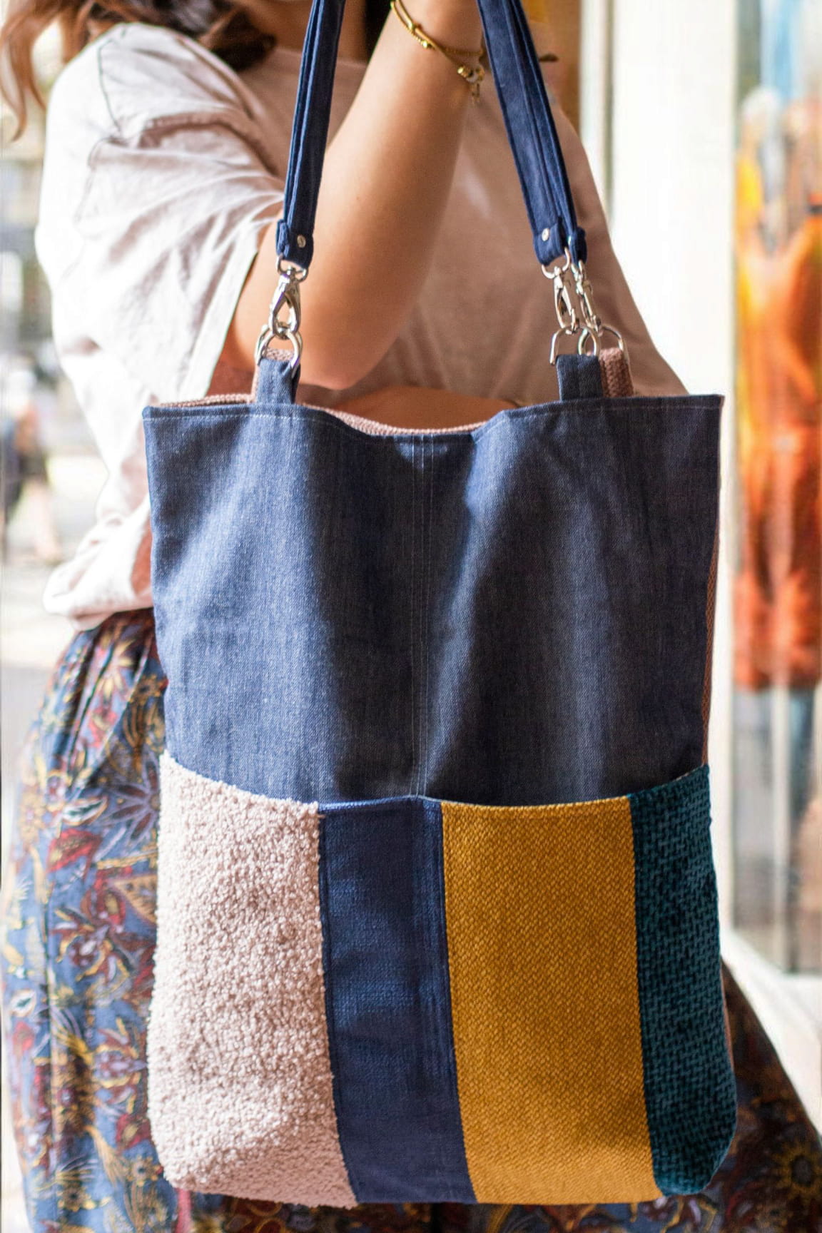 Z przodu dwie kieszenie w stylu patchwork. Całość zapinana na zapięcie magnetyczne.