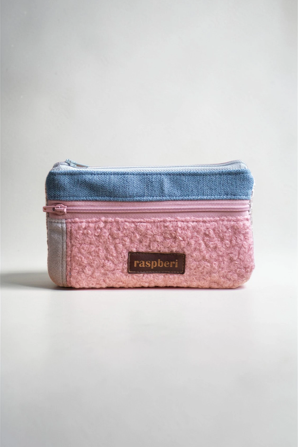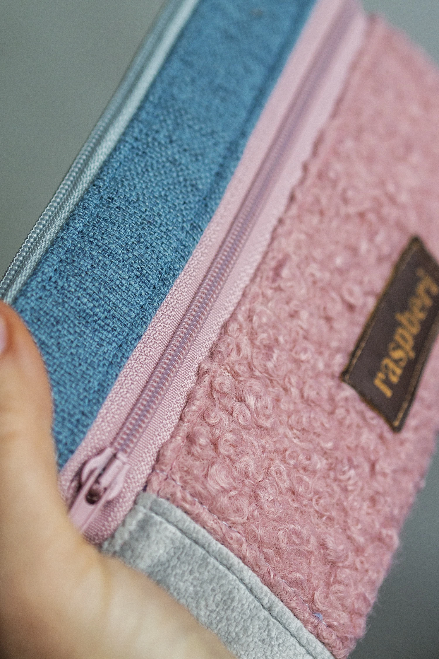 Prosty wodoodporny portfel wykonany z kilku rodzajów tkanin w odcieniach szarości i różu i błękitu.