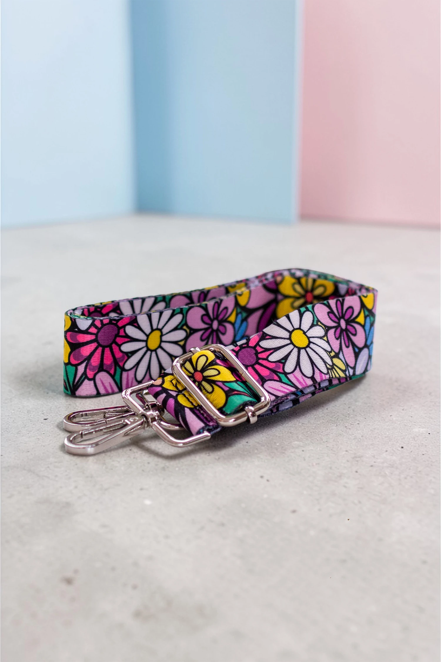 Regulowany pasek do torebki w kwiaty. Srebrne okucia.