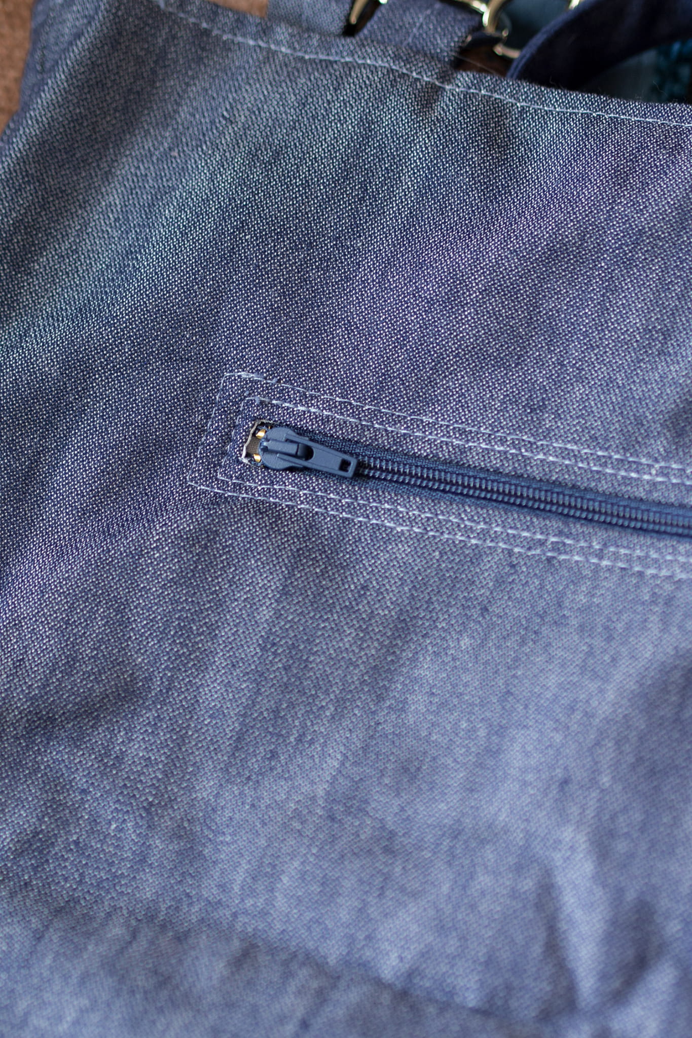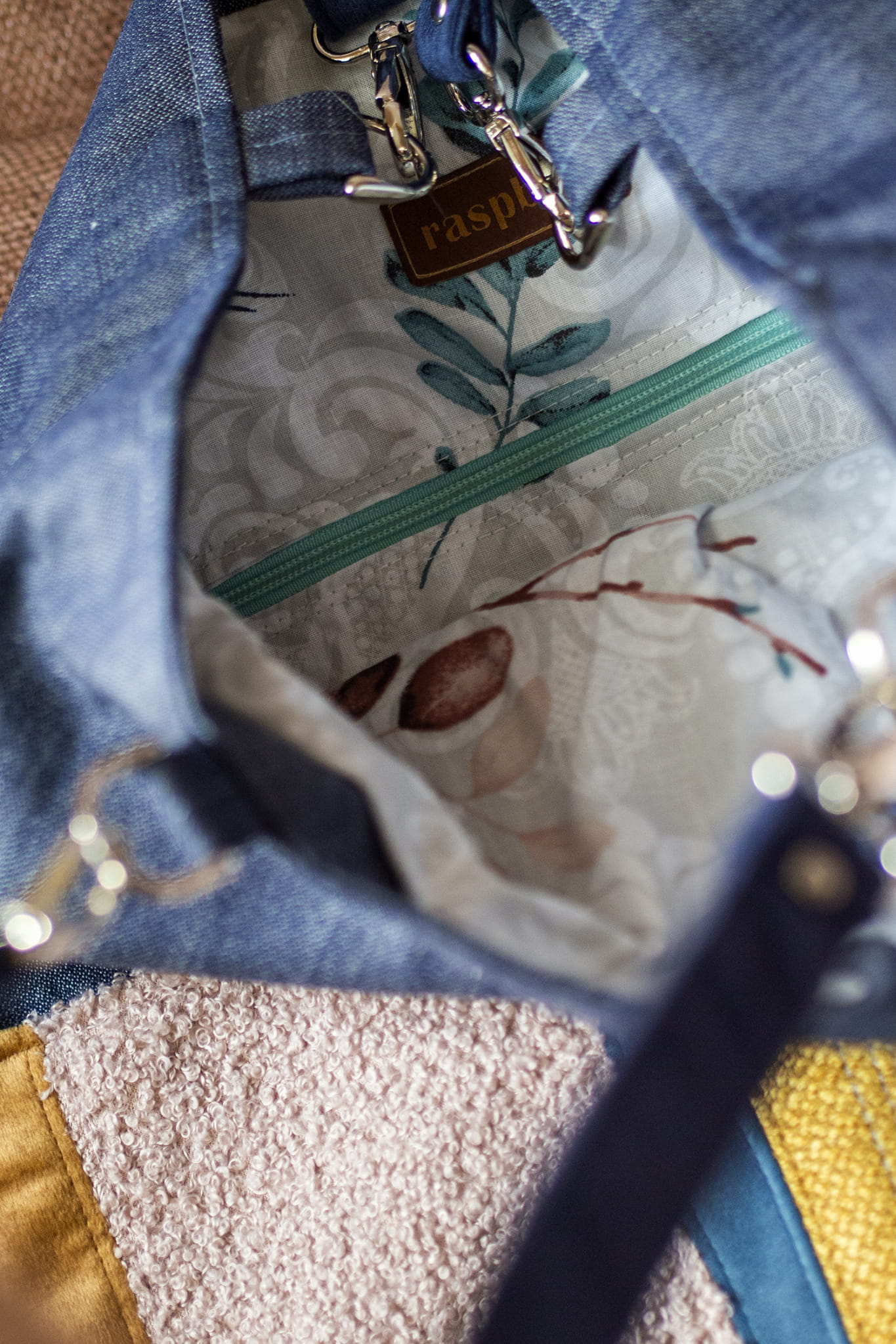 Bawełniana, biała podszewka we wzory, w środku i z tyłu torby kieszonki zapinane na suwak.
