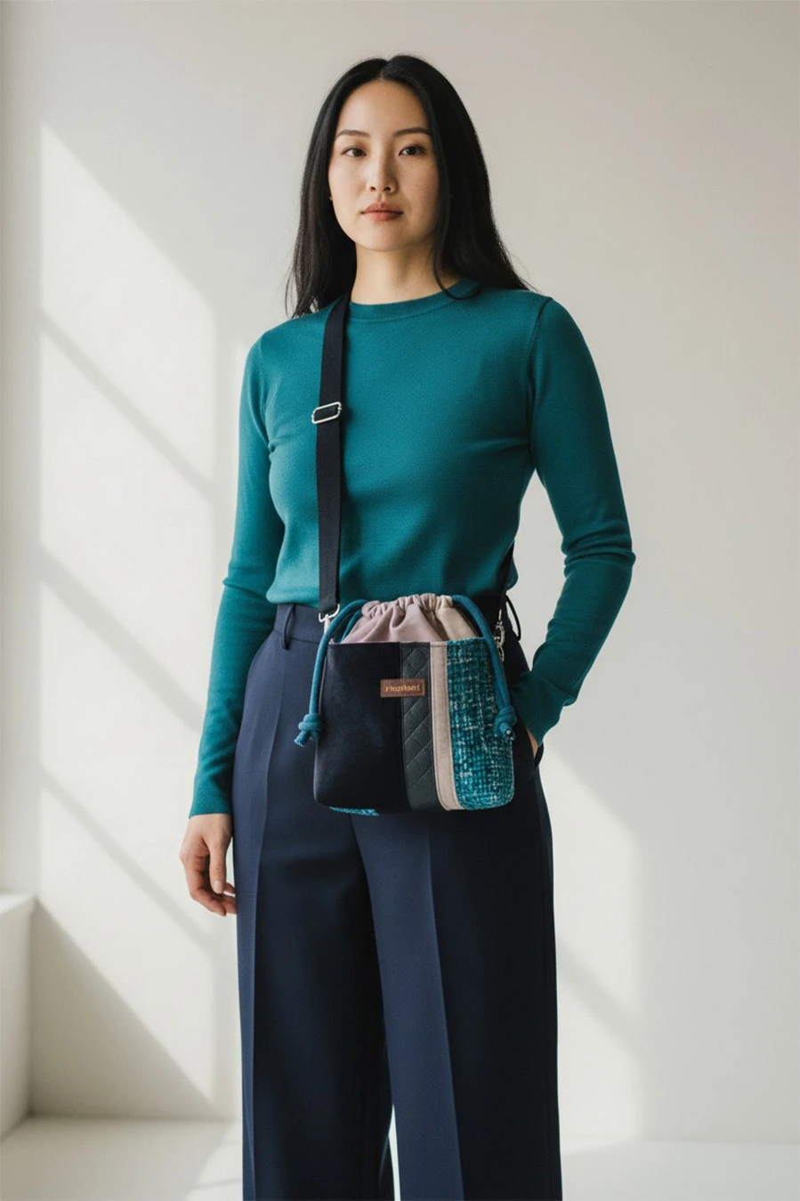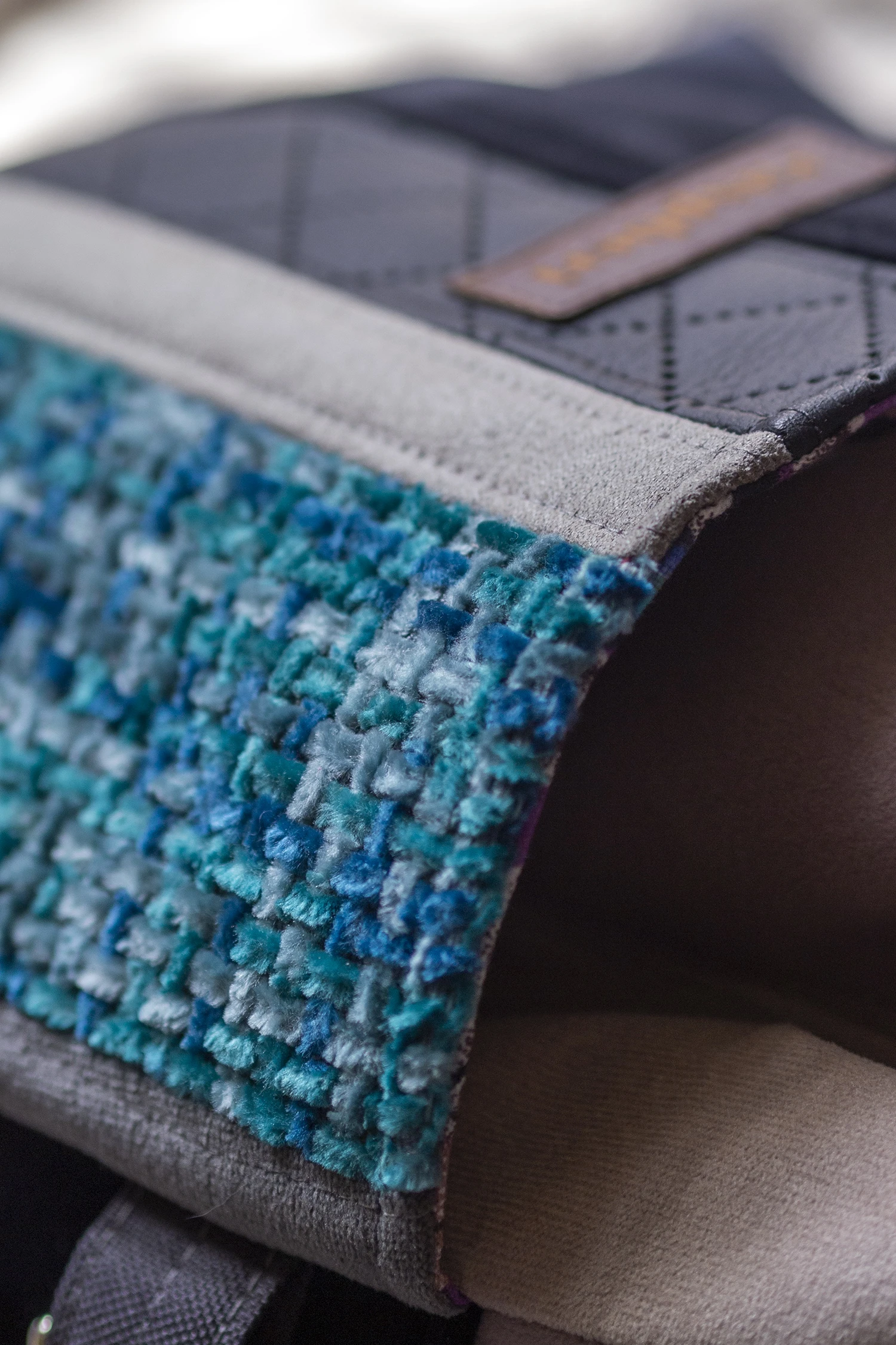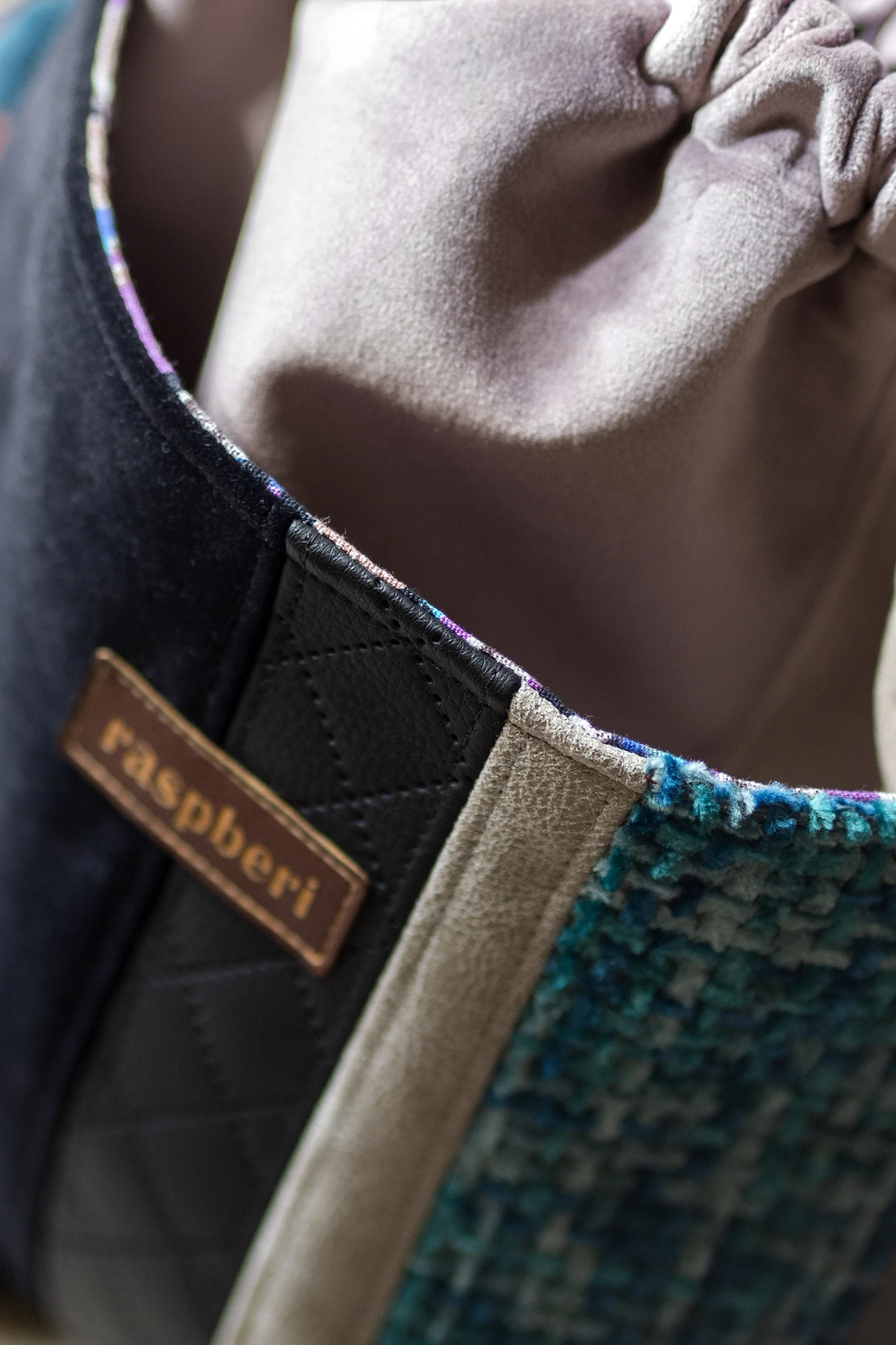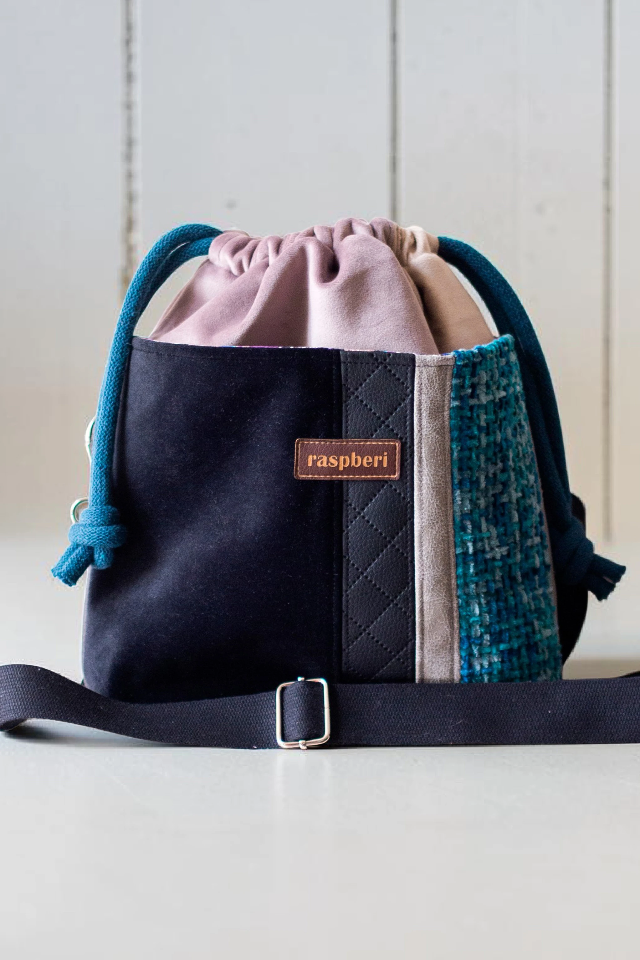 Całość ściągana grubym, bawełnianym sznurkiem w kolorze petrol.