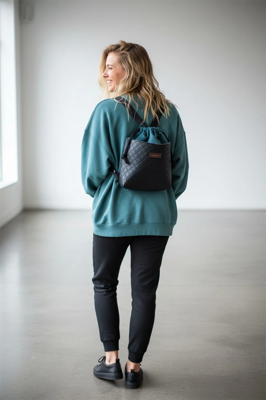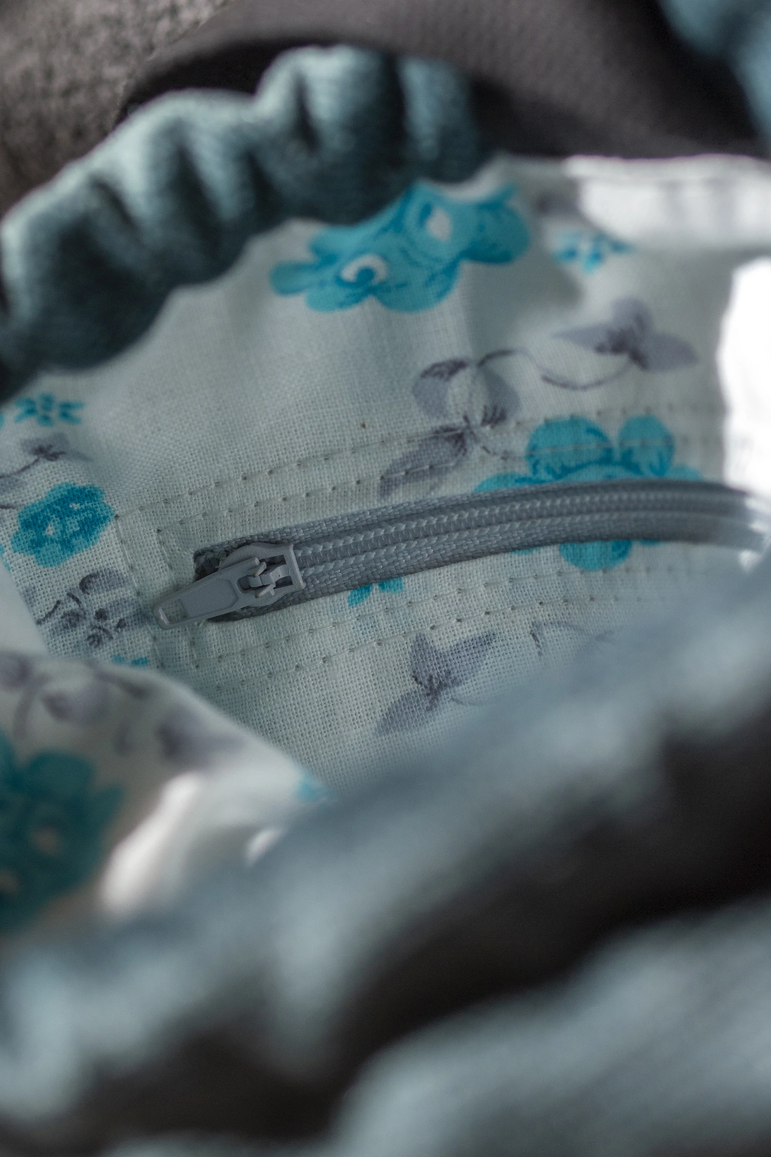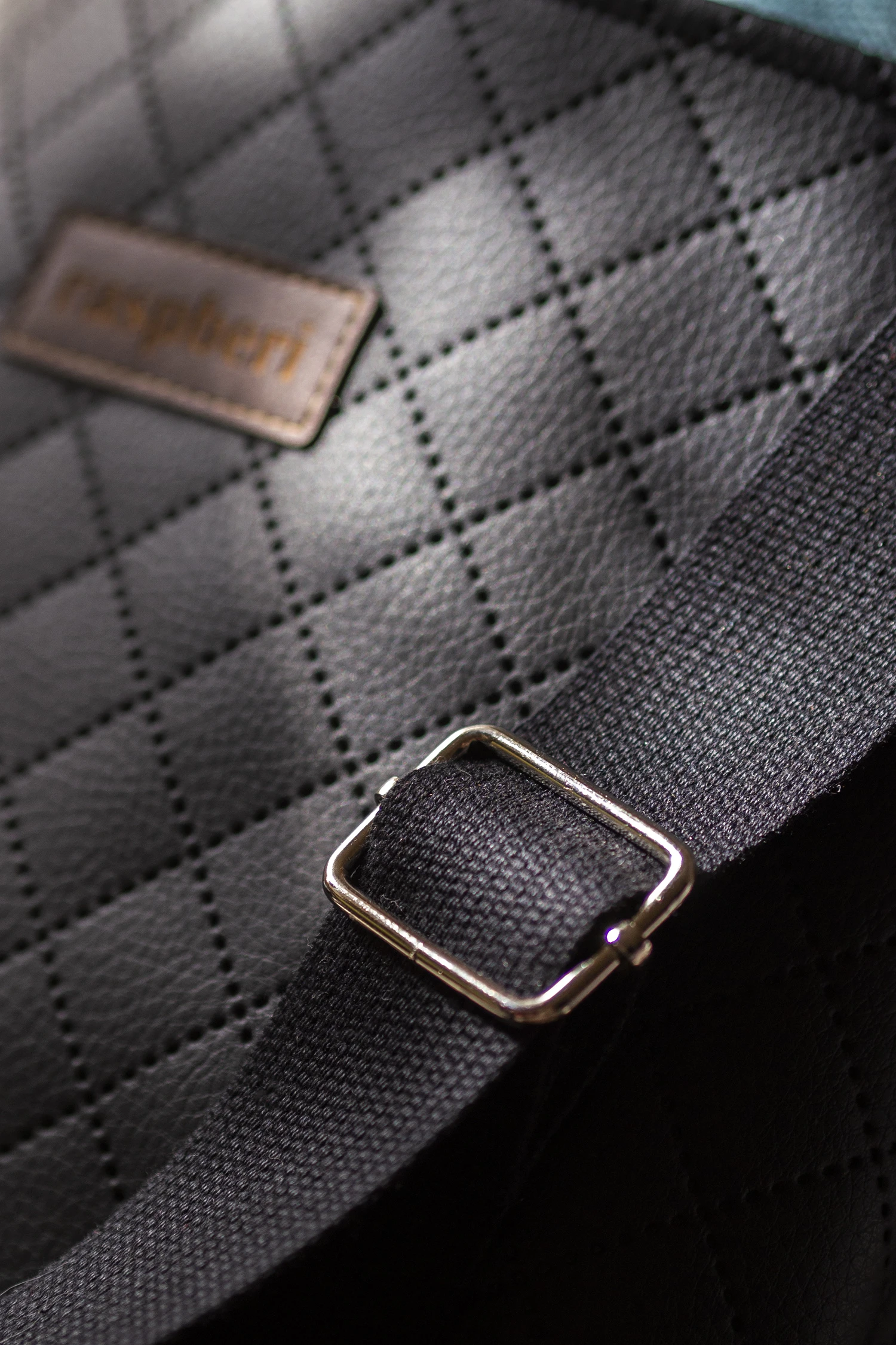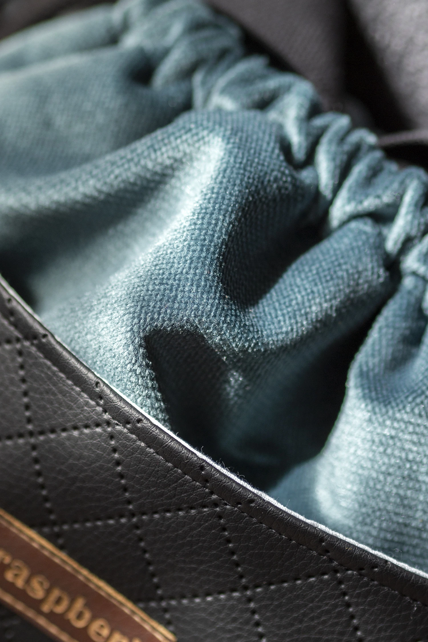Wykonany z weluru w kolorze petrol. Z przodu oraz z na tyle torebki kieszenie (np. na telefon czy chusteczki) z pikowanej czarnej ekoskóry.
