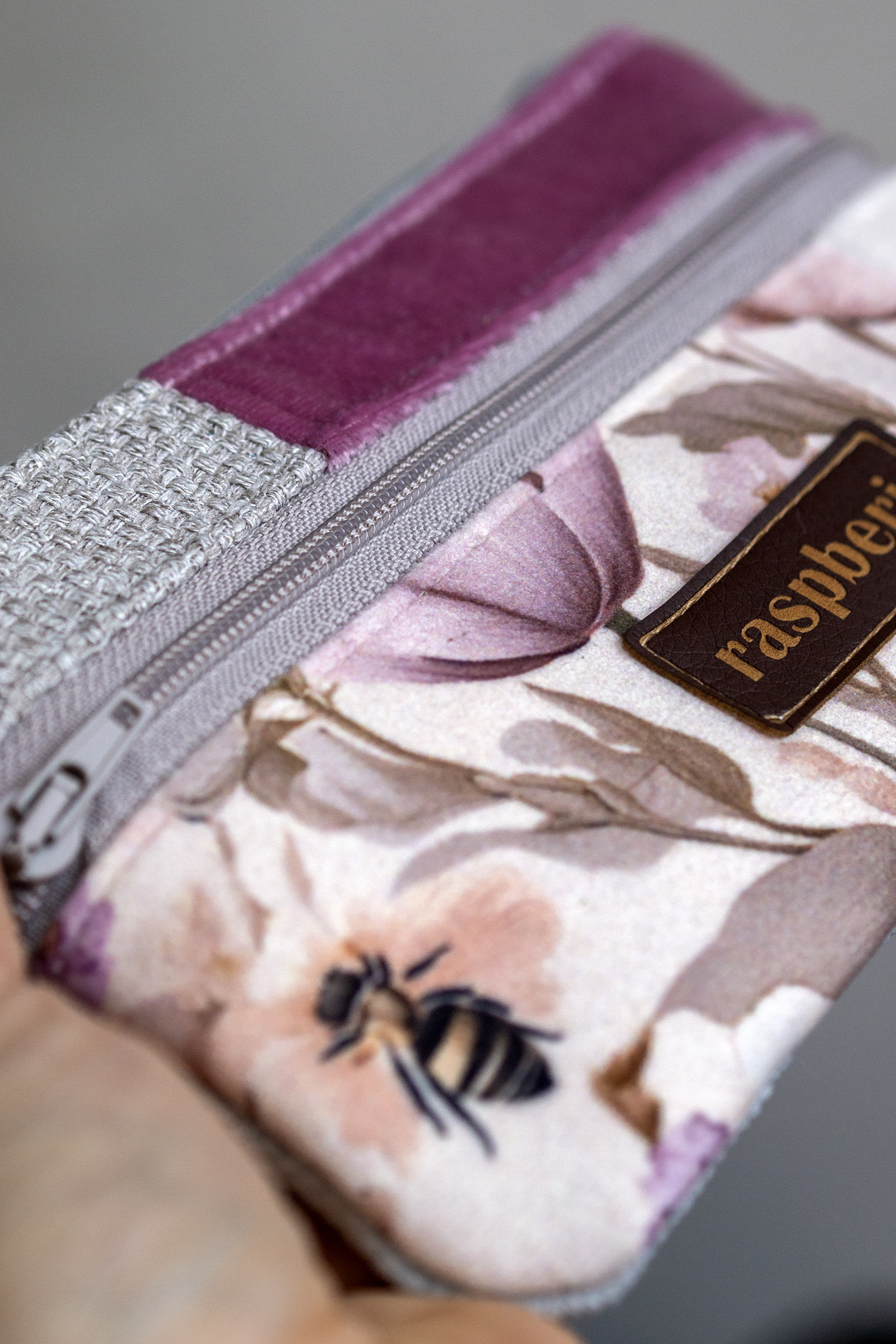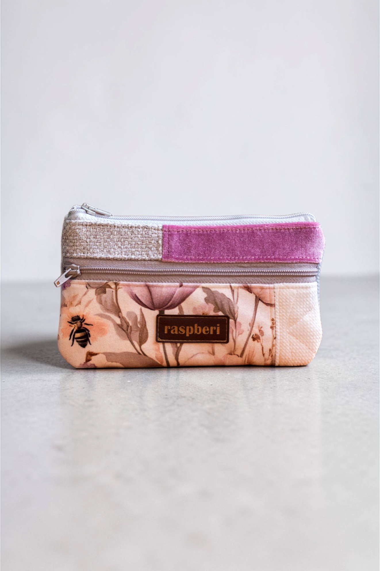Prosty wodoodporny portfel w kolorze kremowo-różowo-szarym w kwiaty.