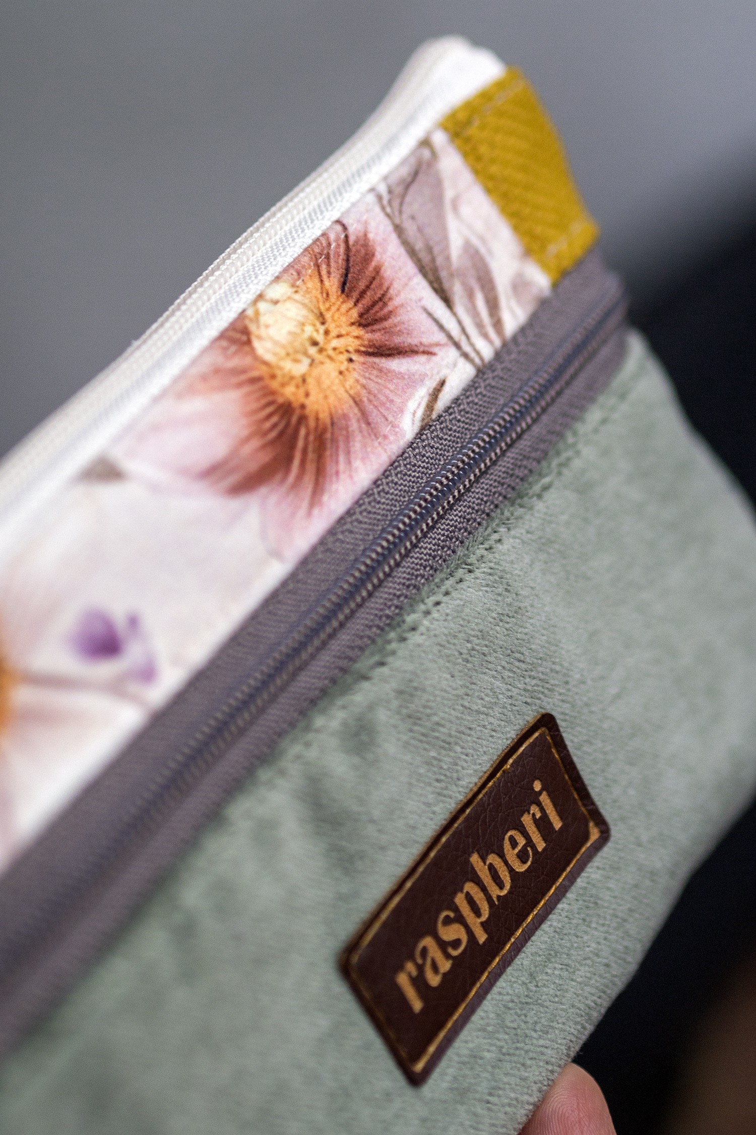 Prosty wodoodporny portfel w kolorze kremowo-laurowym w kwiaty. Tył z tkaniny typu "baranek".